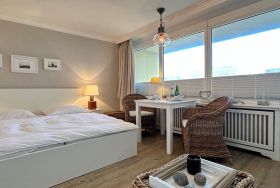 1-Zimmer-Ferienwohnung im Haus Metropol, ca. 38m², Nichtraucher ! 1. OG, Landseite. Wohn-/ Schlafraum mit Doppelbett (180x200), 2-Sitzercouch, Esstisch mit 2 Stühlen, Flat-TV und Radio, W-Lan (ohne Gewähr), Ostbalkon mit Balkonmöbeln, separate Küche mit Mikrowelle und 4-Plattenherd. Duschbad / WC. Tierhaltung ist nicht gestattet. Bettwäsche und Handtücher sind zur Anreise aufgezogen. Ein PKW-Stellplatz kann kostenpflichtig zugebucht werden.