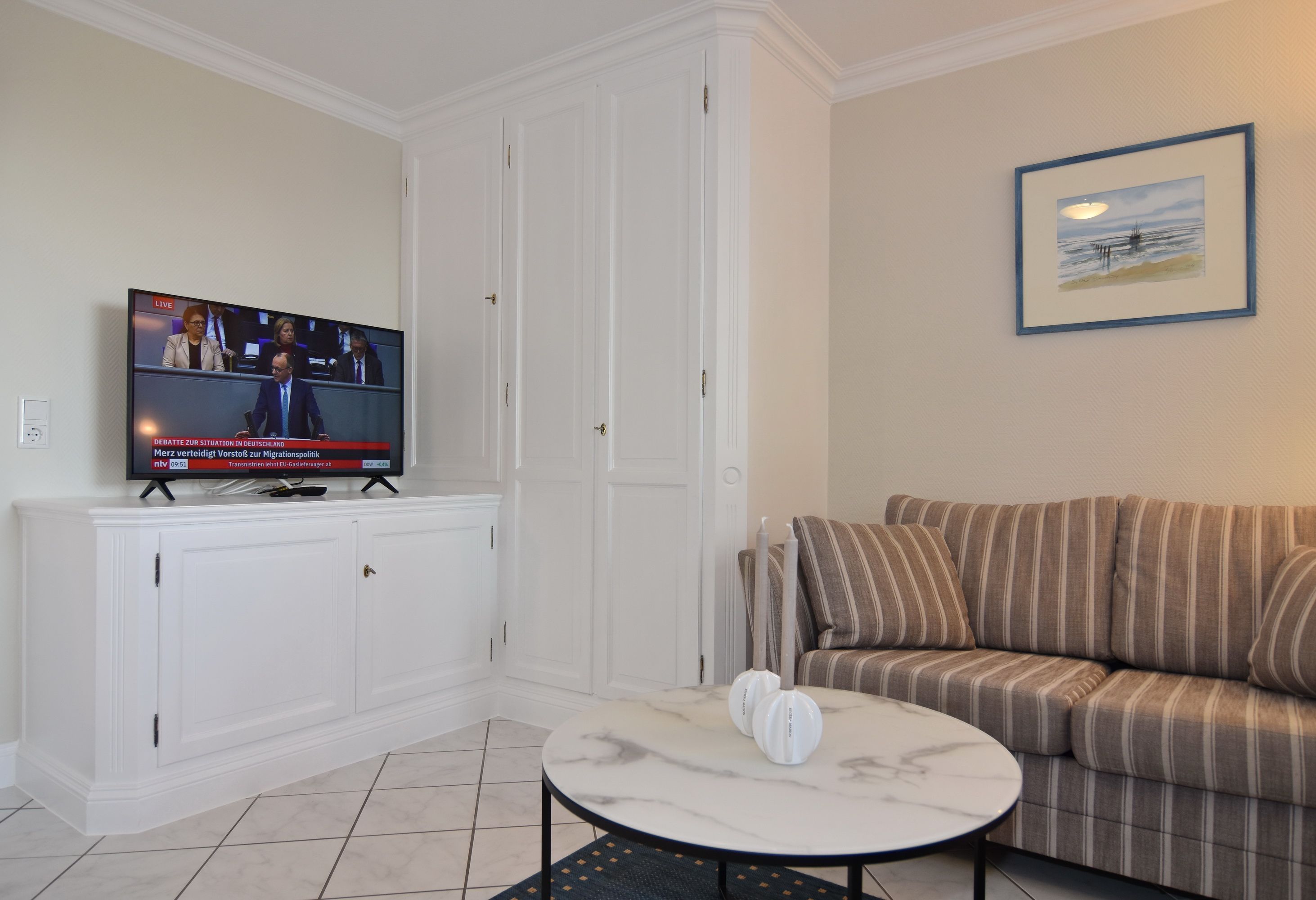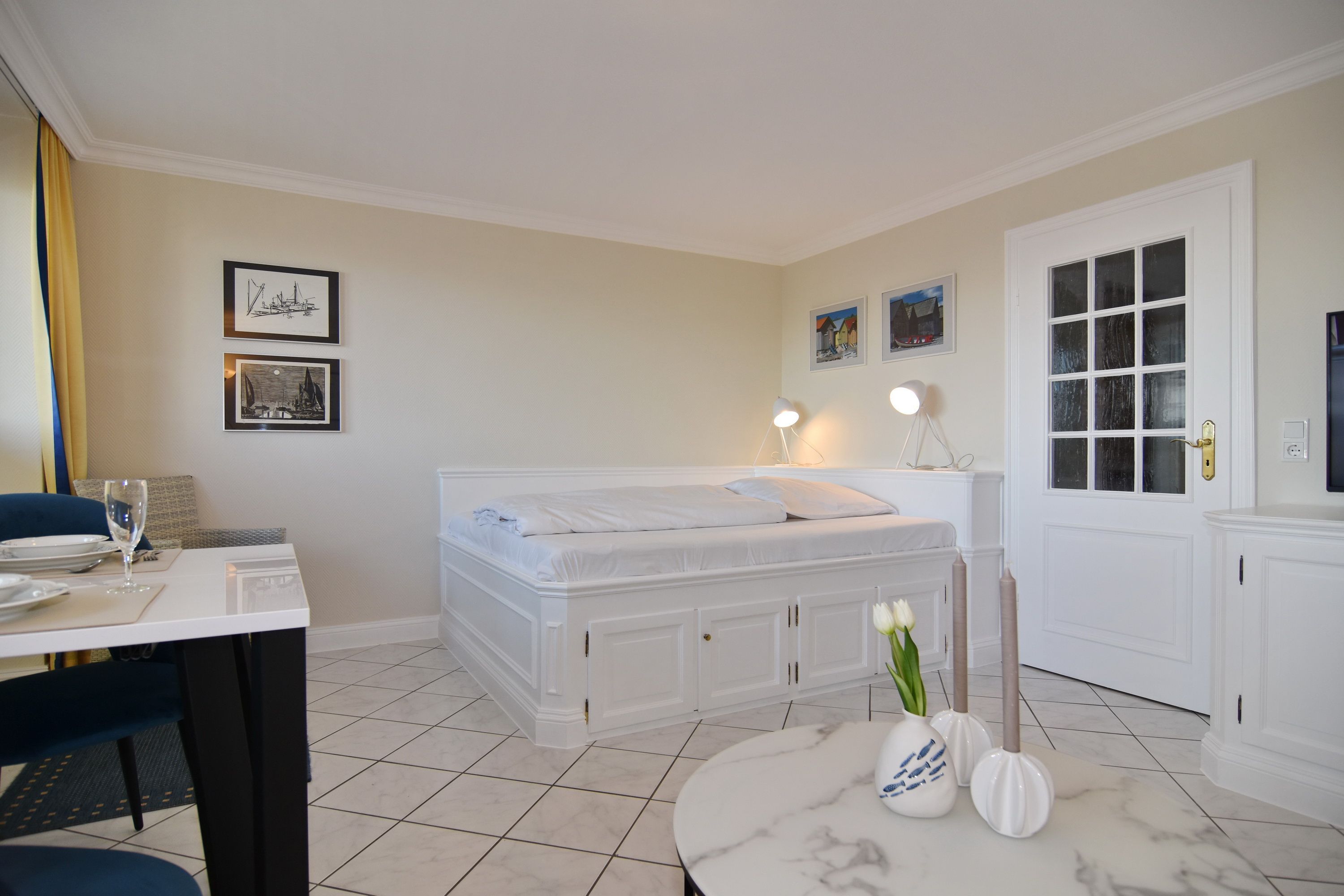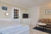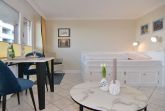 1-Zimmer-Ferienwohnung im 3. OG vom Haus Metropol, 38m², Landseite, Nichtraucher-Whg. Wohn-/ Schlafraum mit Doppelbett (160cm x 200cm), Eßtisch am Fenster, Couch, Kabel-TV, W-Lan (ohne Gewähr). Ost-Balkon, separate Küche mit Backofen und Geschirrspüler, Duschbad/WC. Das Apartment ist gefliest. Tierhaltung ist nicht gestattet. Bettwäsche und Handtücher sind zur Anreise aufgezogen. Ein PKW-Stellplatz kann kostenpflichtig zugebucht werden.