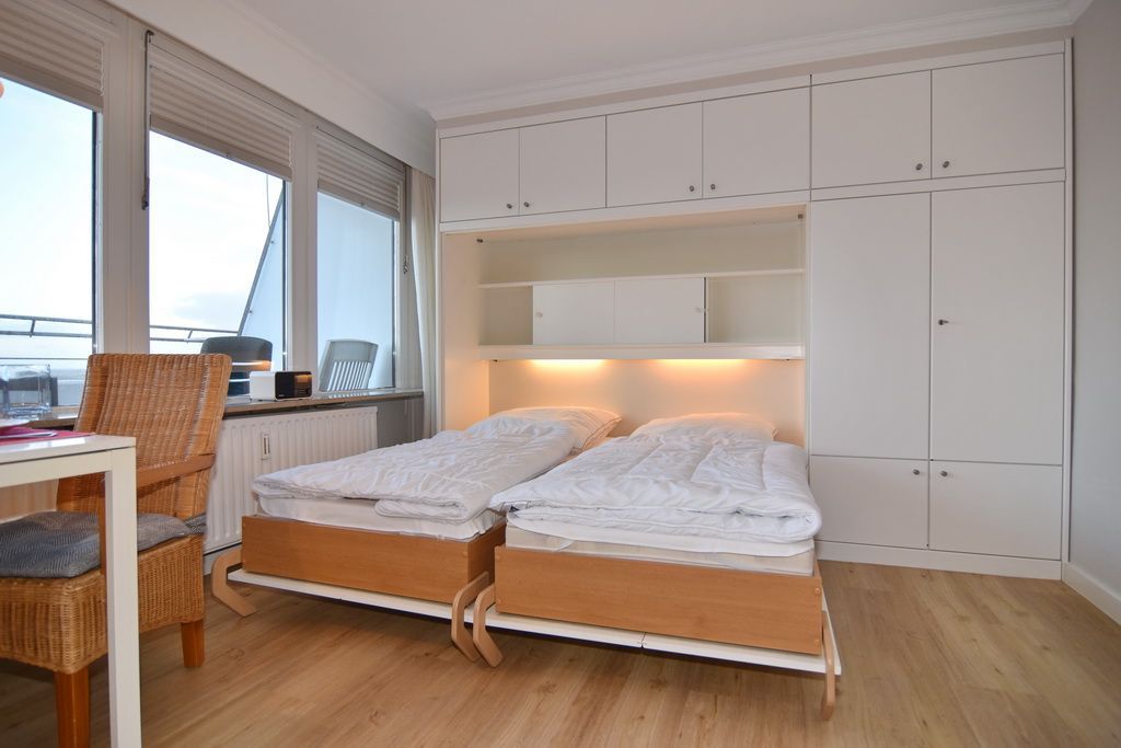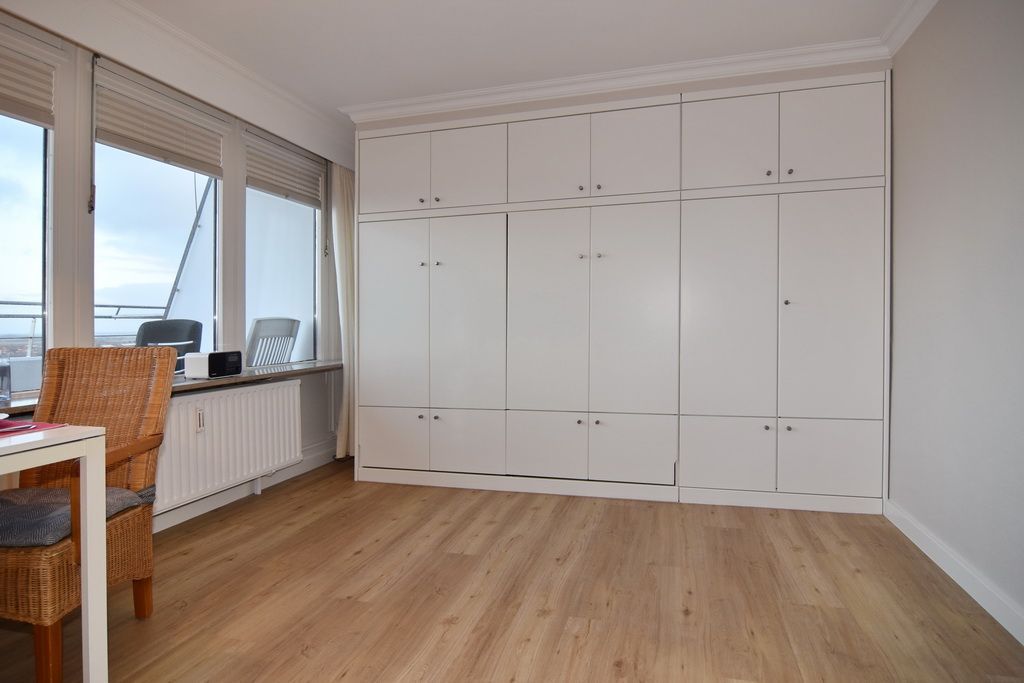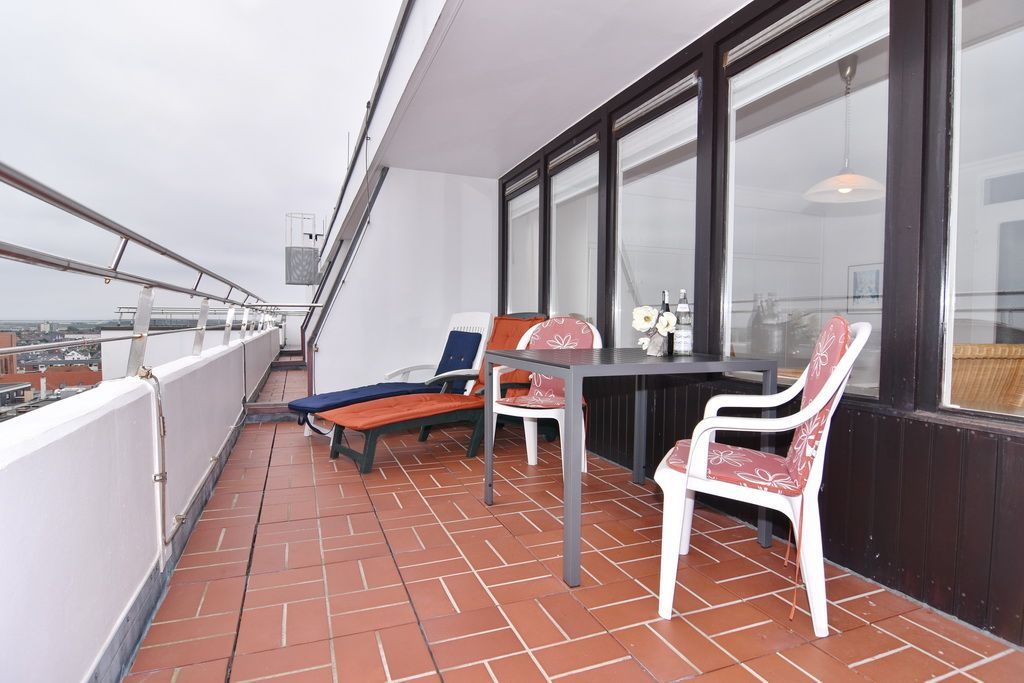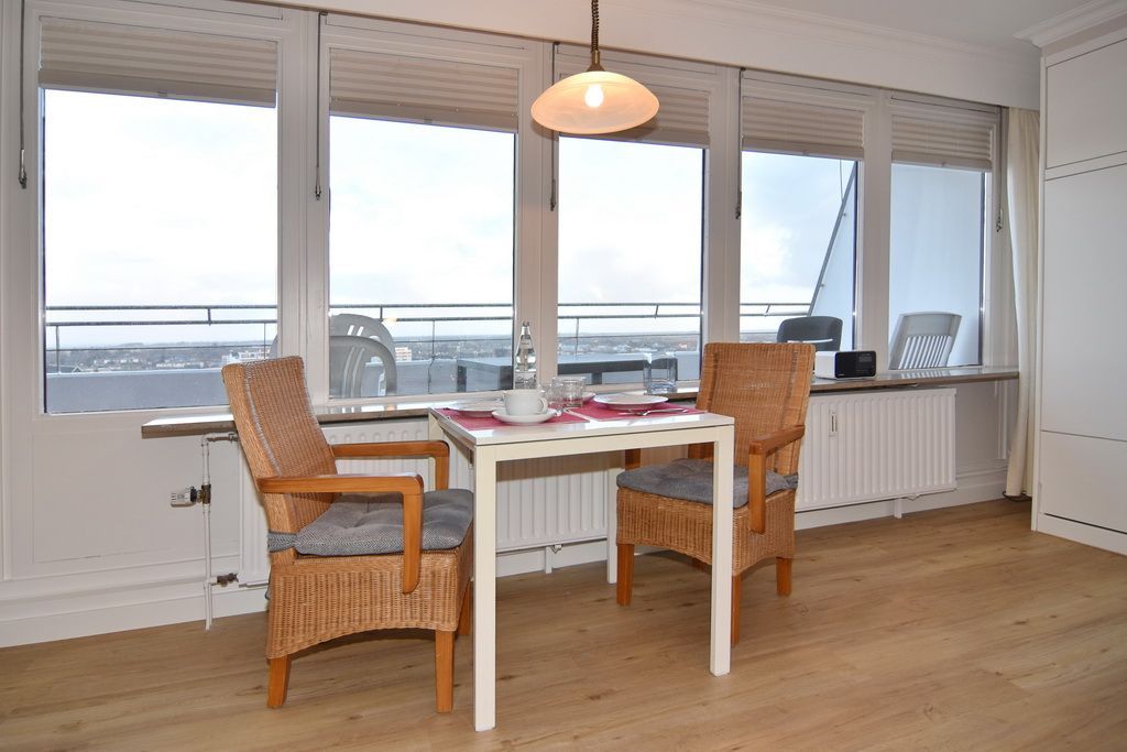 Gepflegtes 1-Zimmer-Penthouse in der 10. Etage (Achtung! Aufzug nur bis zur 9. Etage) mit ca. 46 qm im Haus Sylter Welle. Geniessen Sie den traumhaften Blick über die ganze Insel bis hin zum Wattenmeer. Die Nichtraucher-Wohnung verfügt über einen Wohn-/Schlafraum mit Doppelschrankbett ((je 190 x 90), Ledercouch und Sessel, Eßtisch am Fenster, Flat-TV und Radio W-Lan (ohne Gewähr). Von hier aus gelangen Sie zur Dachterrasse mit Blick über die Insel, 2 Sonnenliegen sowie Tisch und 2 Stühle bieten Gelegenheit zum Ausspannen. Die separate Küche mit Backofen und 4-Platten-herd und das Duschbad/WC gehen vom Flur ab. Das Appartement ist gefliest und eignet sich für Allergiker. Tierhaltung ist hier nicht gestattet. Bettwäsche und Handtücher sind zur Anreise aufgezogen. Ein PKW-Stellplatz kann kostenpflichtig zugebucht werden.