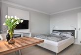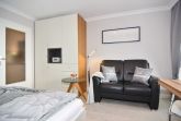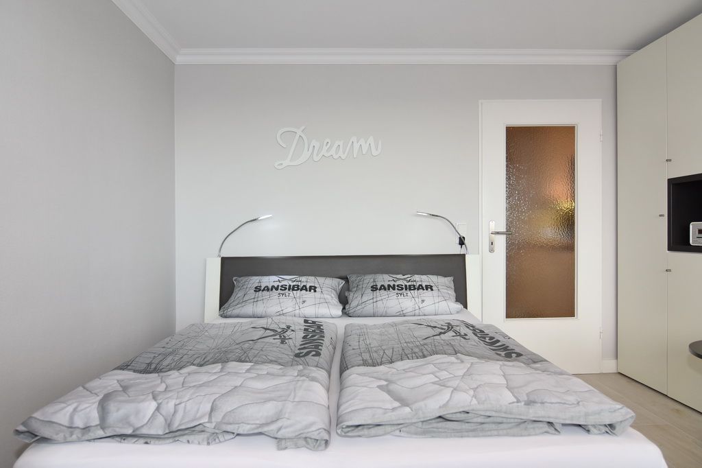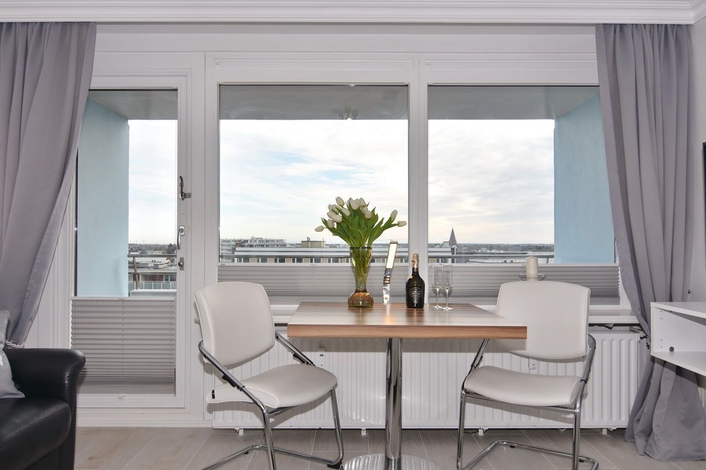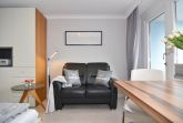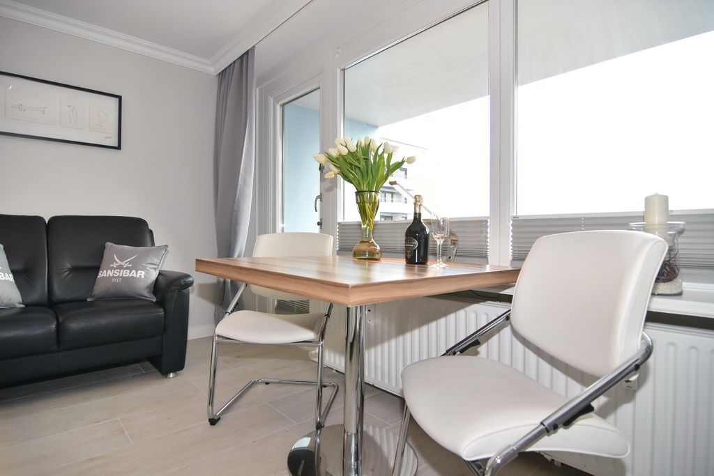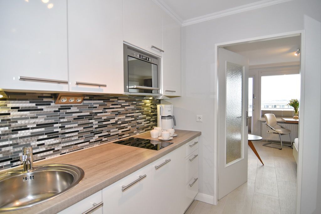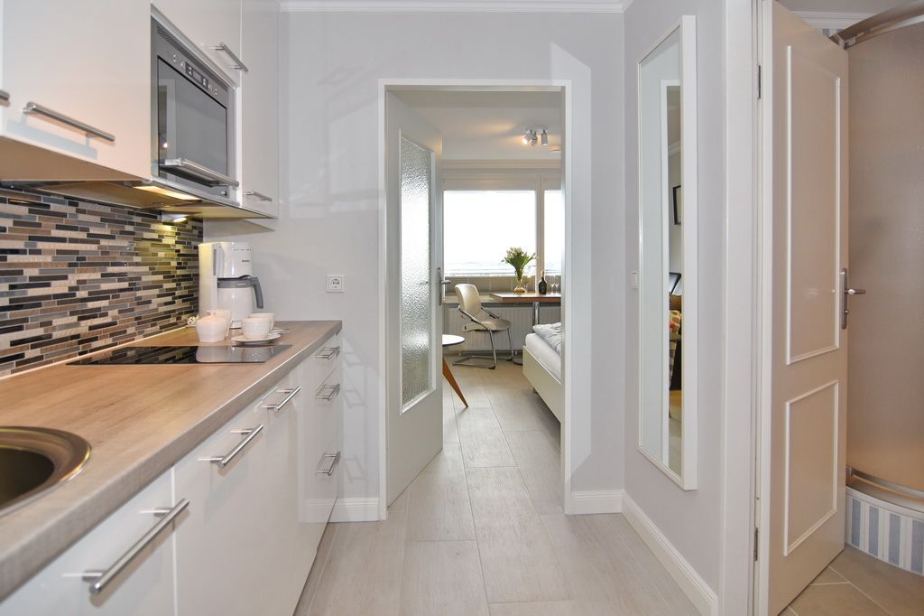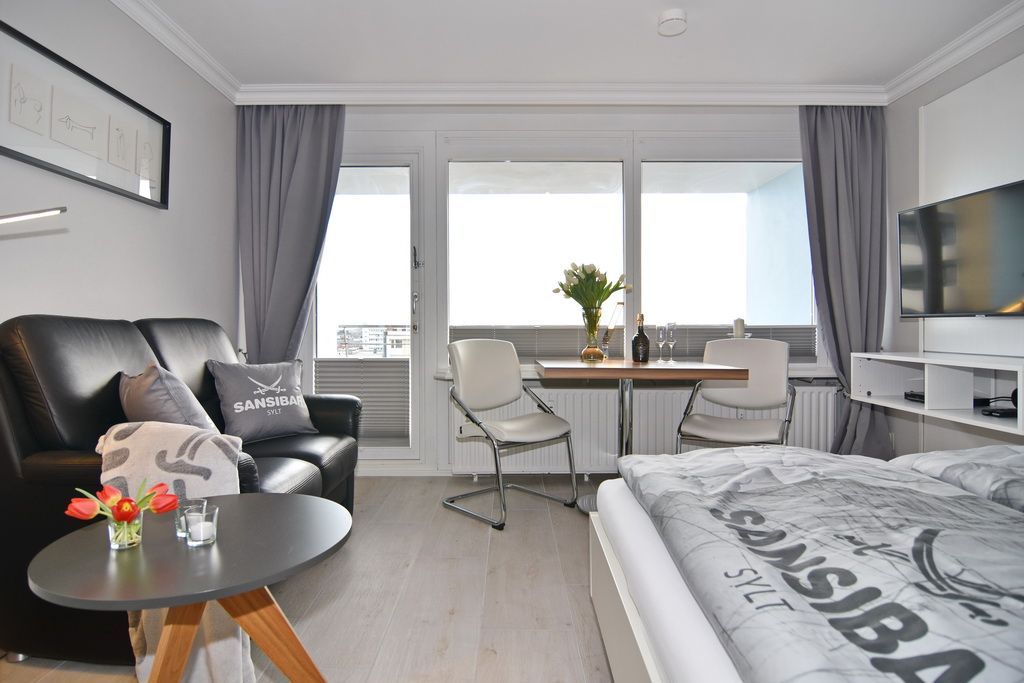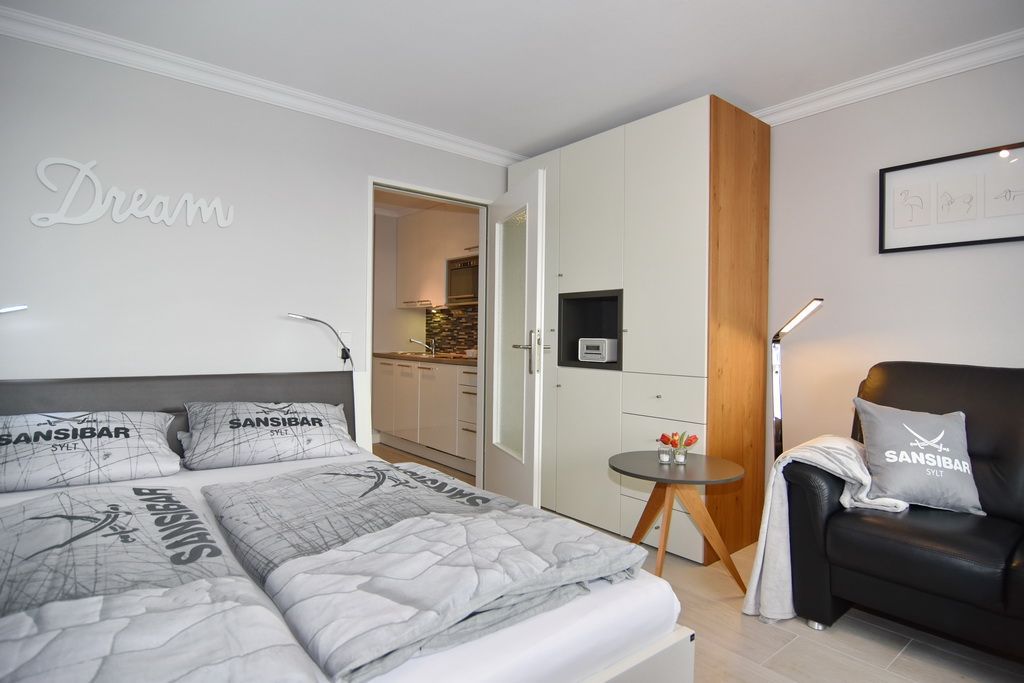 Attraktive 1-Zimmer-Ferienwohnung im 5. OG des Haus Metropol. (Nichtraucher) Wohn-/ Schlafraum mit Doppelbett (2 Matratzen á 80 cm), Essplatz am Fenster, 2-Sitzer-Couch, Flat-TV, Radio, DVD und Blu Ray Player. W-Lan (ohne Gewähr). Moderne Küchenzeile mit Mikrowelle und Geschirrspüler im Flurbereich, Duschbad/WC. Ostbalkon mit Blick über Westerland. Tierhaltung ist nicht gestattet. Das Appartement ist mit Parkett ausgelegt. Bettwäsche und Handtücher sind zur Anreise aufgezogen. Ein PKW-Stellplatz kann kostenpflichtig zugebucht werden.