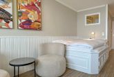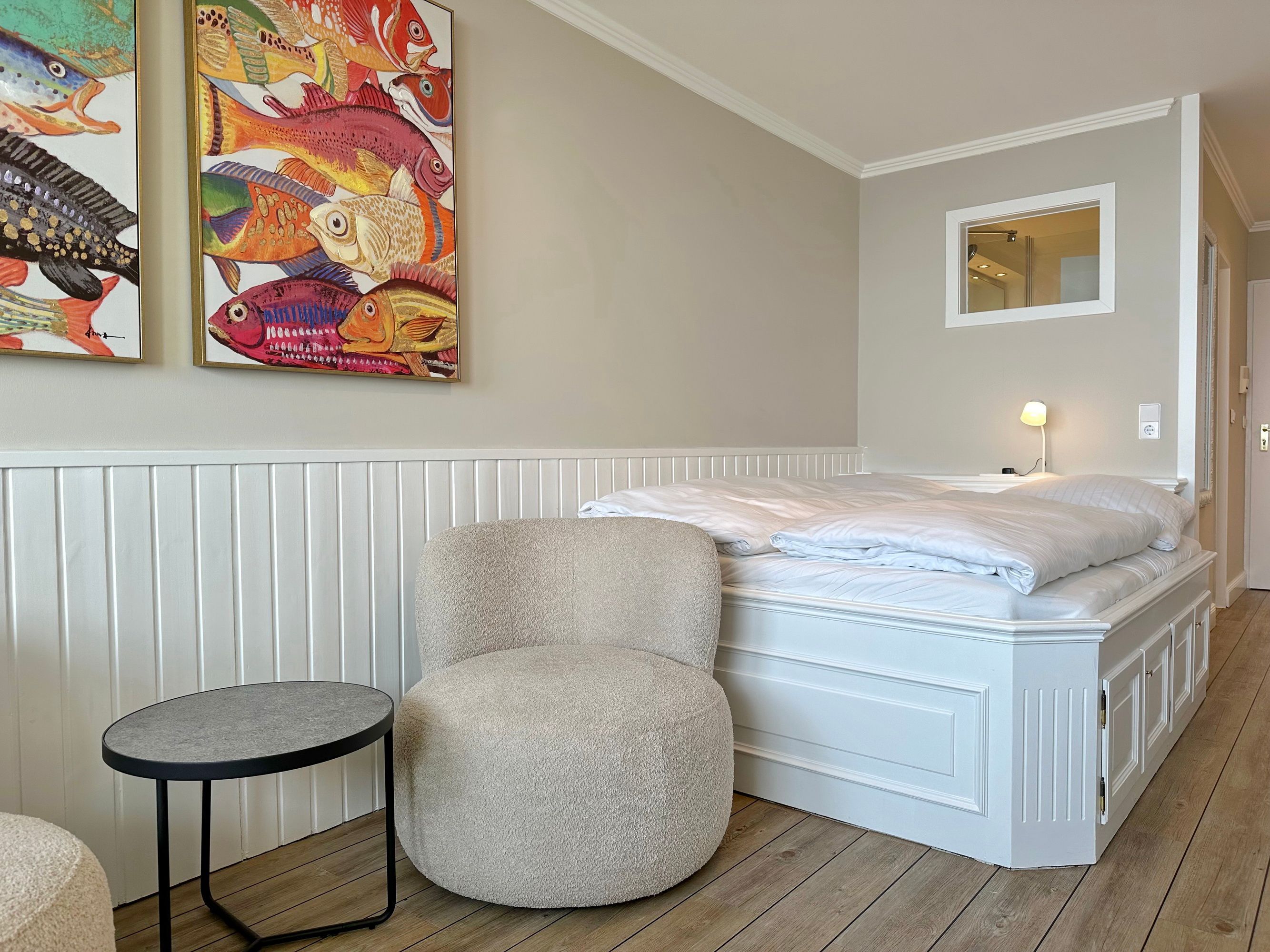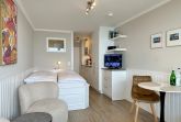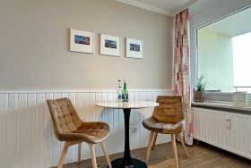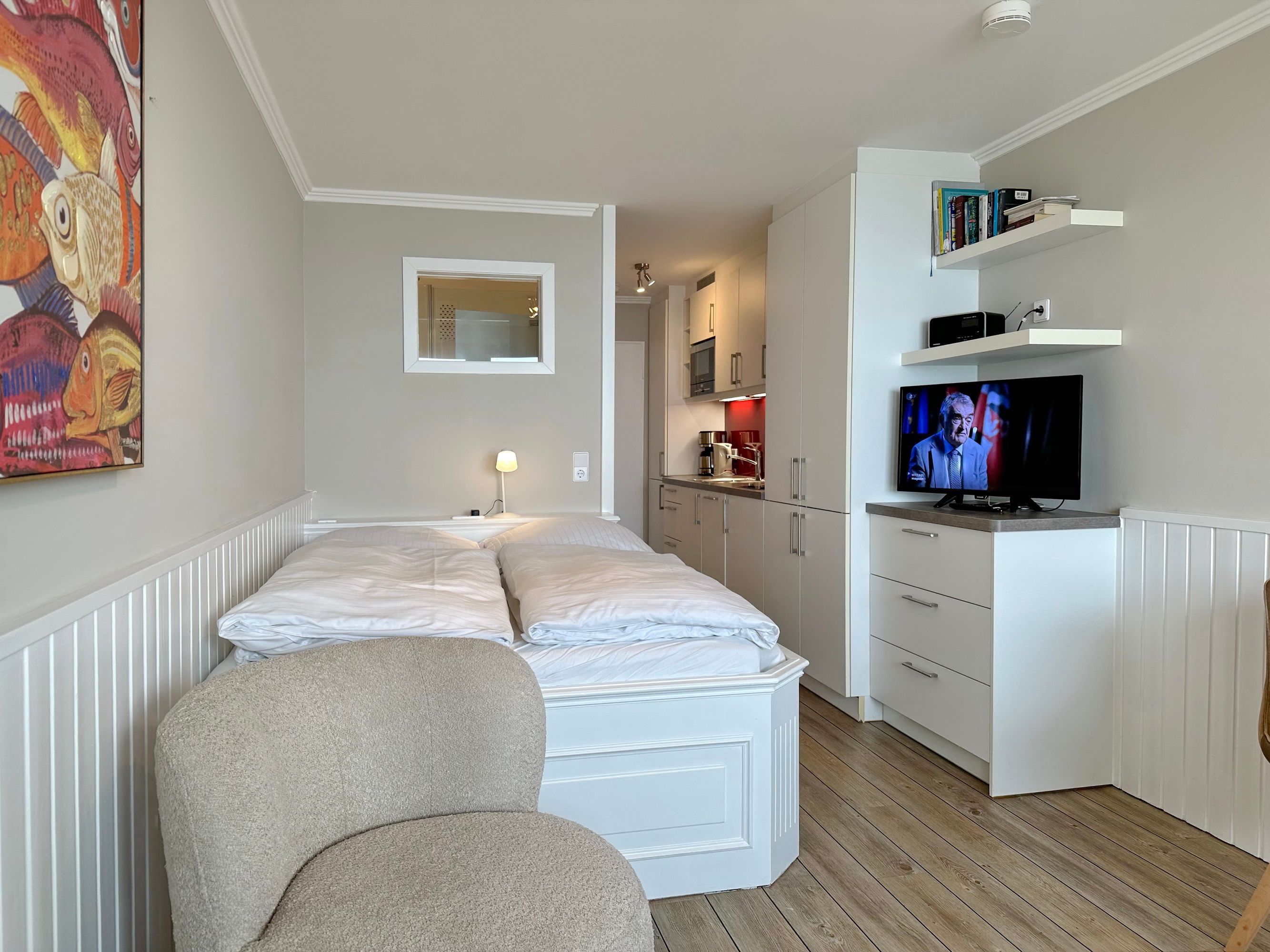 Seeblick mit Meeresrauschen erwarten Sie in dieser modern ausgestatteten 1-Zimmer-Ferienwohnung im 1.OG vom Haus Metropol mit ca. 25 m². Das Wohn-/Schlafzimmer mit Podestdoppelbett (140x200), Sitzecke und Essecke am Fenster hat einen Einbauschrank, Flat-TV mit Radio und hauseigenem WLAN. Die schöne Küchenzeile mit Geschirrspüler, Mikrowelle und 2-Platten-Ceran-Kochfeld ist voll ausgestattet und für 2 Personen ausreichend. Gegenüberliegend der Küche befindet sich das seperate Duschbad mit WC. Der Westbalkon bietet Ihnen einen wunderbaren Blick auf das Meer, die Promenade und den Sonnenuntergang am Abend. Tierhaltung nach Anmeldung erlaubt. Bettwäsche und Handtücher sind zur Anreise aufgezogen. Ein PKW-Stellplatz kann kostenpflichtig zugebucht werden.