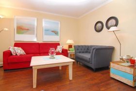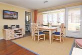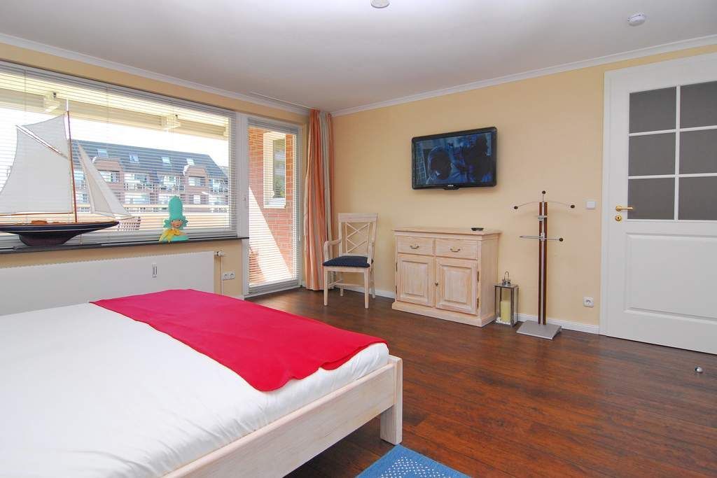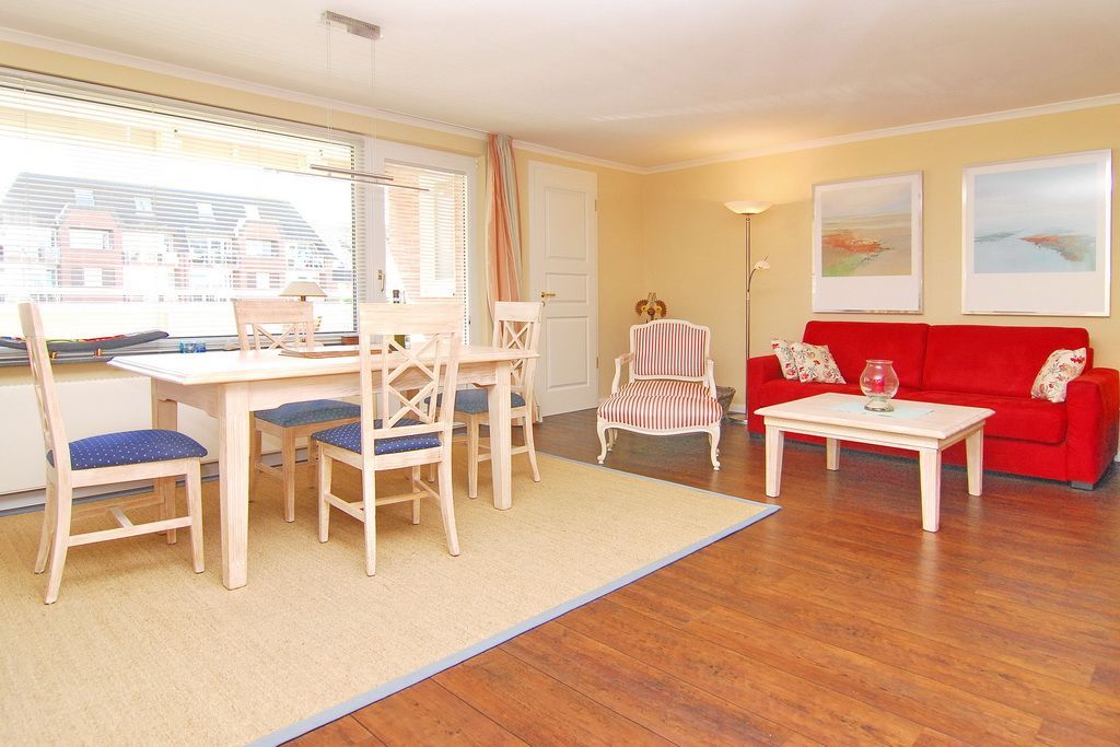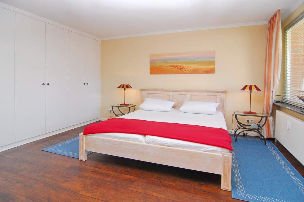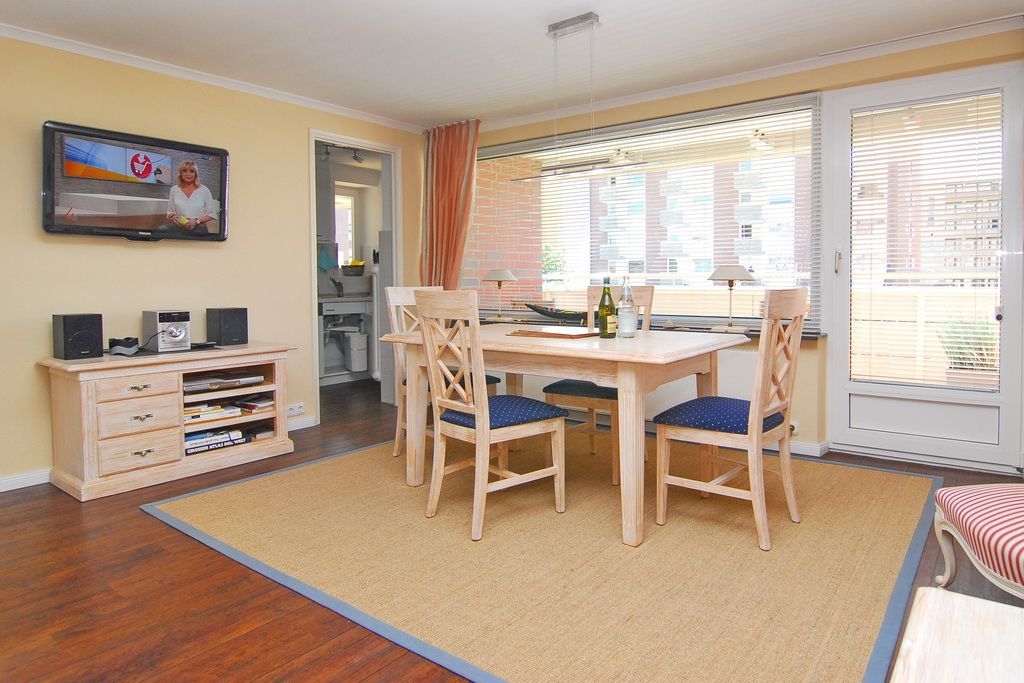 Exklusive 2-Zimmer-Ferienwohnung im Haus Nordseeresidenz, 1. OG, ca. 65 m², Nichtraucher, großes Wohnzimmer mit Schlafcouch (180x200) , Zweisitzer-Couch und Sessel, großer Esstisch, Flat-TV, Stereoanlage, DVD, Ipodstation u. W-Lan (ohne Gewähr), separate Küche mit Geschirrspüler, Mikrowelle und Backofen, Schlafzimmer mit Doppelbett, Einbauschrank und Flat-TV, 2 Westbalkone mit Liegen und Bestuhlung, kleines Duschbad / WC, Flur mit Garderobe. Inkl. PKW-Stellplatz Nr. 9 hinter dem Haus. Tierhaltung ist nicht gestattet. Bettwäsche und Handtücher sind zur Anreise aufgezogen.