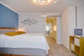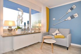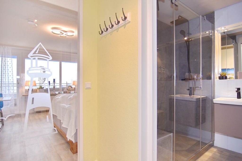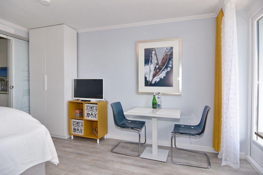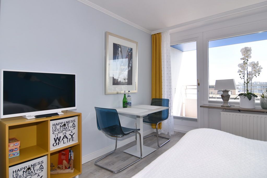 Moderne 1-Zimmer-Ferienwohnung mit ca. 30m² im 6.OG zur Landseite im Haus Sylter Welle. Nichtraucher-Whg.! Kombinierter Wohn-/Schlafraum mit Boxspringbett (2x80x200 ), 2-Sitzer-Couch, Essplatz für zwei Personen, Flat-TV mit integriertem Radio, W-Lan (ohne Gewähr). Einladender Ostbalkon mit Balkonmöbeln und Blick über die Innenstadt von Westerland. Helle Küchenzeile im Flurbereich mit Geschirrspüler, 2-Platten-Ceranfeld. Duschbad mit großzügiger Wellnessdusche. Bettwäsche und Handtücher sind zur Anreise aufgezogen. Ein PKW-Stellplatz kann kostenpflichtig zugebucht werden. Tierhaltung (Hund) ist gestattet, muss bitte angemeldet werden!