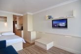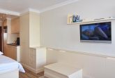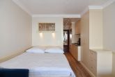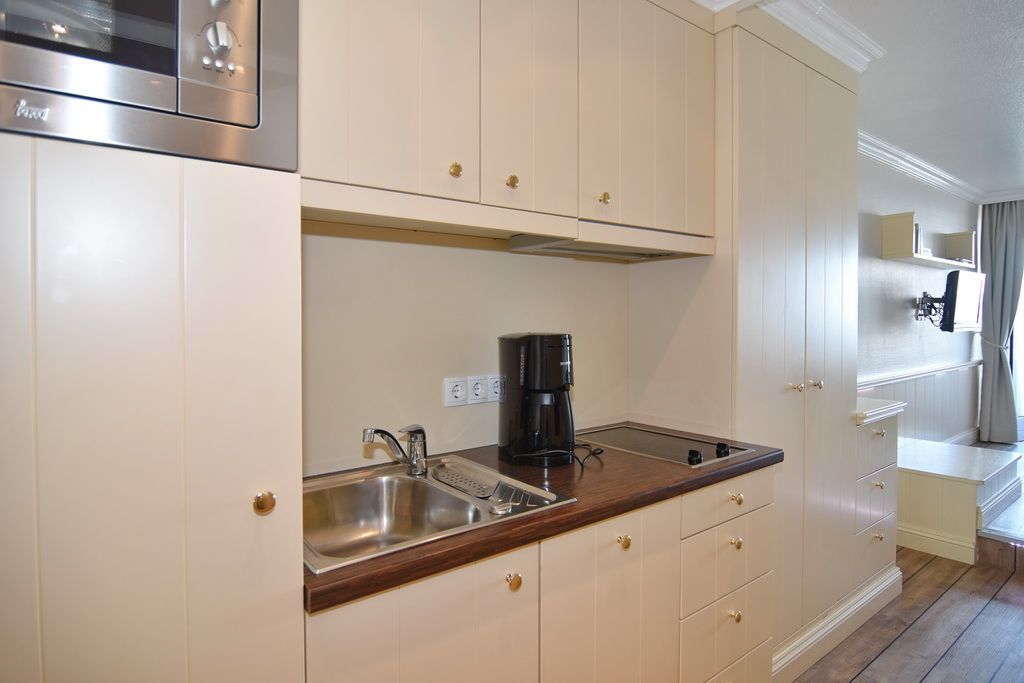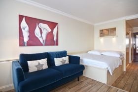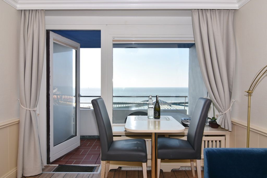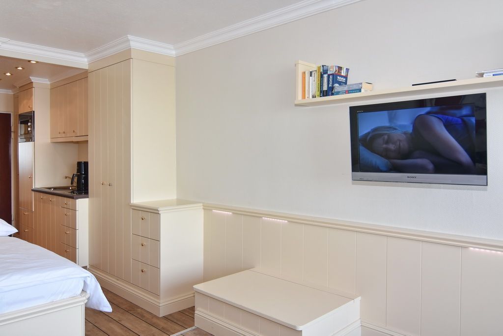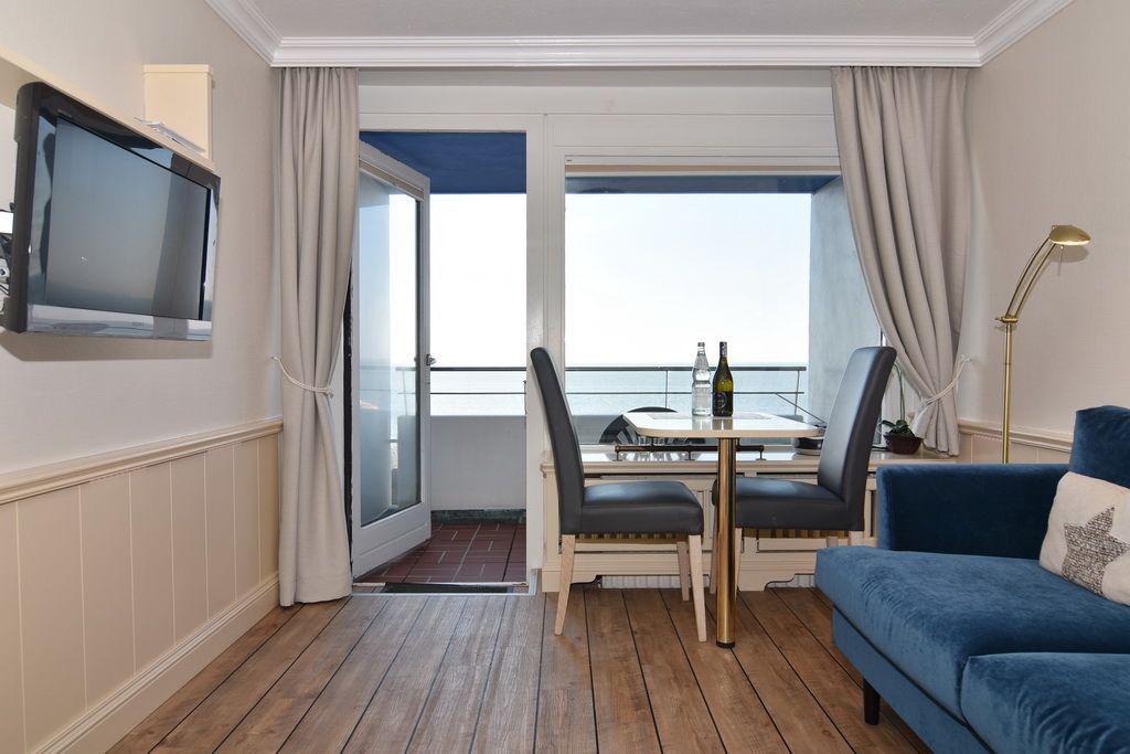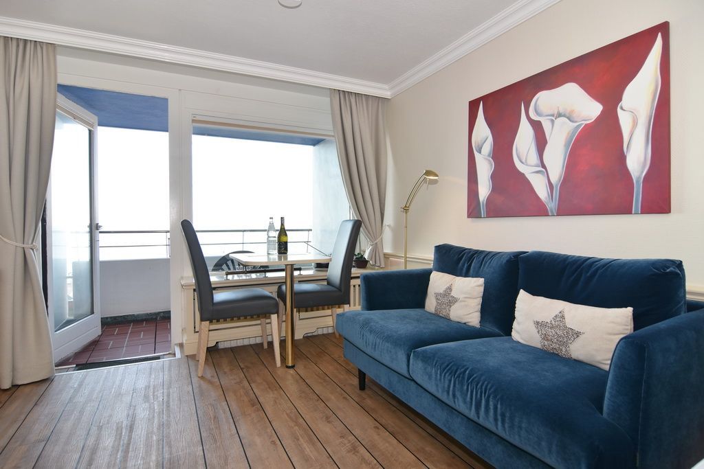 Schöne 1-Zimmer-Ferienwohnung im Haus Sylter Welle, 4.OG, ca. 25 qm; Nichtraucher-Whg.! Uneingeschränkter Meeresblick. Heller Wohn-/Schlafraum mit Doppelbett (140*200) und Westbalkon zur Seeseite, erhöhter Essplatz (Achtung Stufe) mit herrlichem Meeresblick, 2-Sitzer-Couch, Flat-TV, Radio, W-Lan (ohne Gewähr), Duschbad / WC, hübsche Küchenzeile mit Geschirrspüler und Mikrowelle. Bettwäsche und Handtücher sind zur Anreise aufgezogen. Ein PKW-Stellplatz kann kostenpflichtig zugebucht werden.