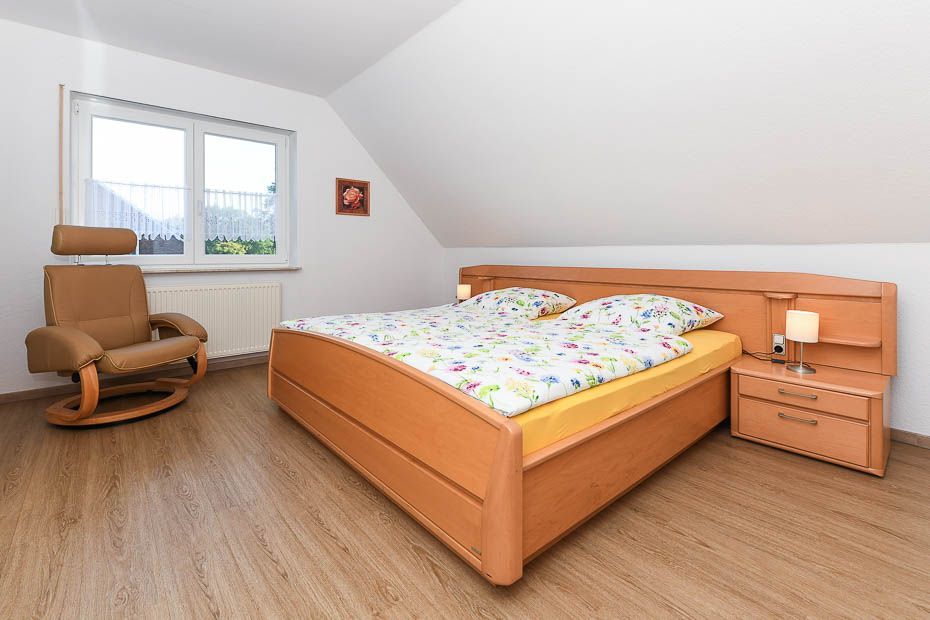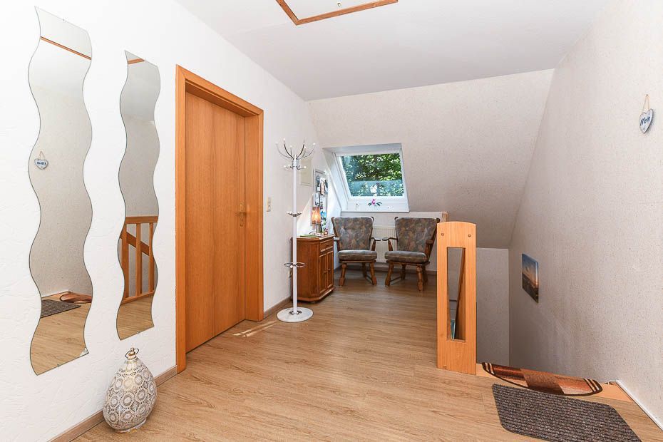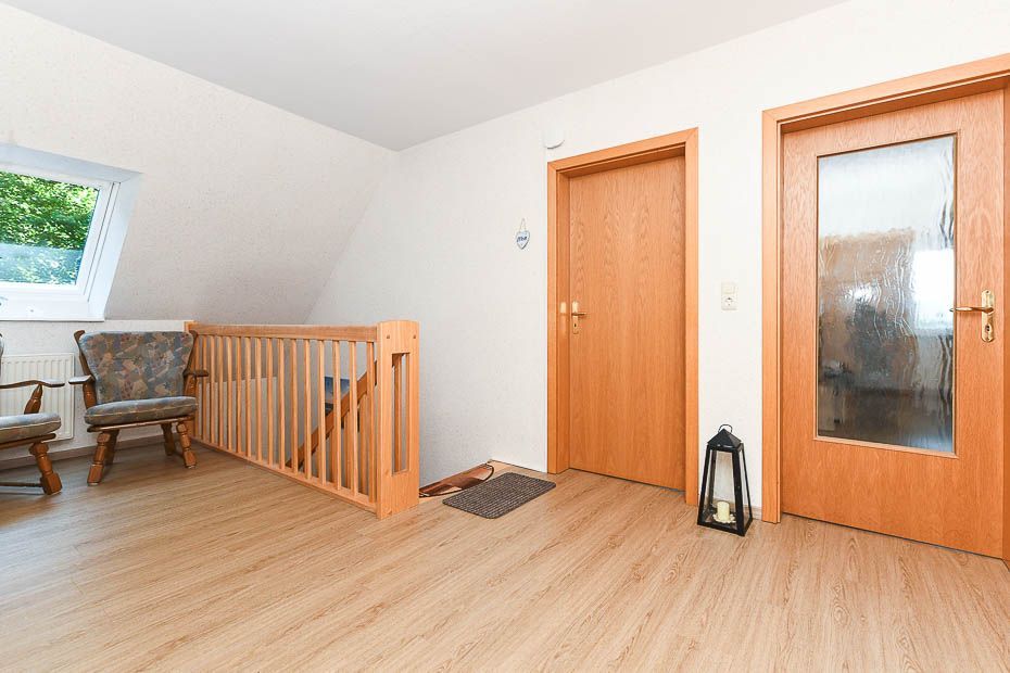 Größe ca. 90 Quadratmeter, Wohnzimmer, Küche, Schlafzimmer, zweites separates Schlafzimmer/Kinderzimmer, Badezimmer mit Badewanne, Dusche und Waschtisch, separates WC mit Waschtisch, Obergeschoss, optimal für 2 bis 4 Personen.