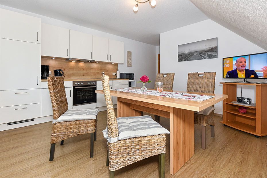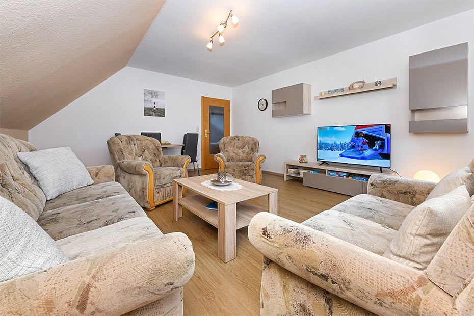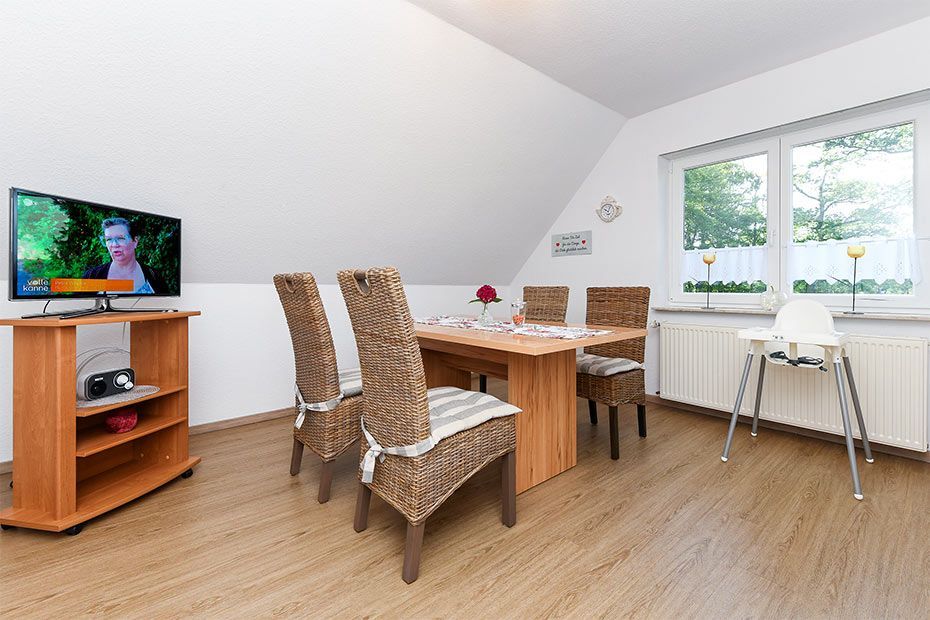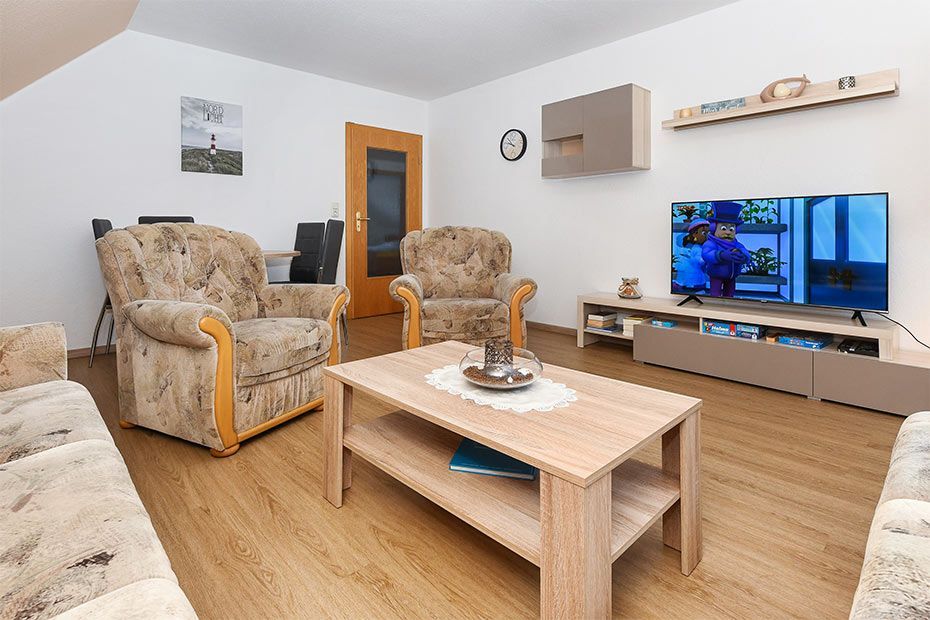 In der im Jahr 2022 vollständig renovierten Ferienwohnung „Zur Kuhweide“ finden 2 bis 4 Personen auf ungefähr 90 Quadratmeter Wohnfläche sehr gute Bedingungen für einen ruhigen und erholsamen Urlaub an der Nordsee. Die Ferienwohnung im Obergeschoss des Hauses ist gemütlich eingerichtet, freundlich gestaltet und sehr gut ausgestattet. Hier finden Sie wunderbare Bedingungen für einen schönen Ostfrieslandurlaub. Im großen Garten gibt es zum Beispiel die Möglichkeit, ganz gemütlich in der Sonne zu sitzen oder bei einer Tasse Tee denn hier ist ja Ostfriesland endlich einmal ein gutes Buch zu lesen oder die Ruhe bei einem Blick über die grünen Wiesen und Kuhweiden zu genießen. Ihre Kinder können sich derweil auf dem direkt angrenzenden und ehemals aktiv bewirtschafteten Bauernhof umsehen und sich auf dem großen Hofgelände austoben.