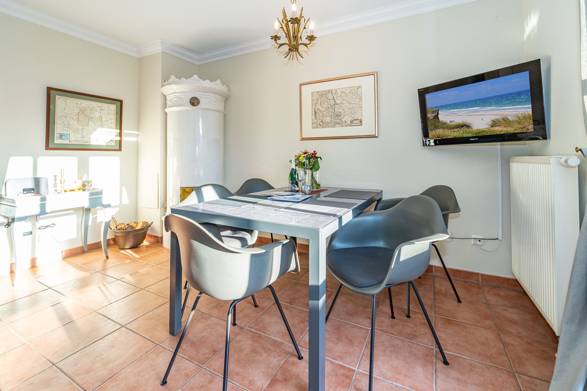 Das Wohnzimmer ist mit einer gemütlichen Couchgarnitur (Zweisitzer-Couch und zwei urgemütliche Ohrensessel), Essplatz für 6 Personen, weißem antiken Kachelofen, großem Kabel-Flachbild-TV, Radio/CD-Player und einer cremefarbenen Küche im Landhausstil ausgestattet. Kostenlose Internetnutzung per W-Lan (ohne Gewähr).