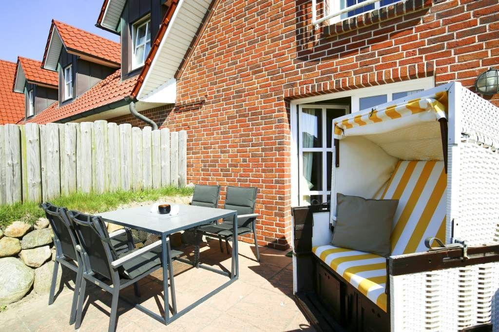 Vom Wohnzimmer betritt man die nach Süden ausgerichtete Sonnenterrasse mit Saison-Strandkorb (ca. April-Oktober) und Gartenmöbeln.