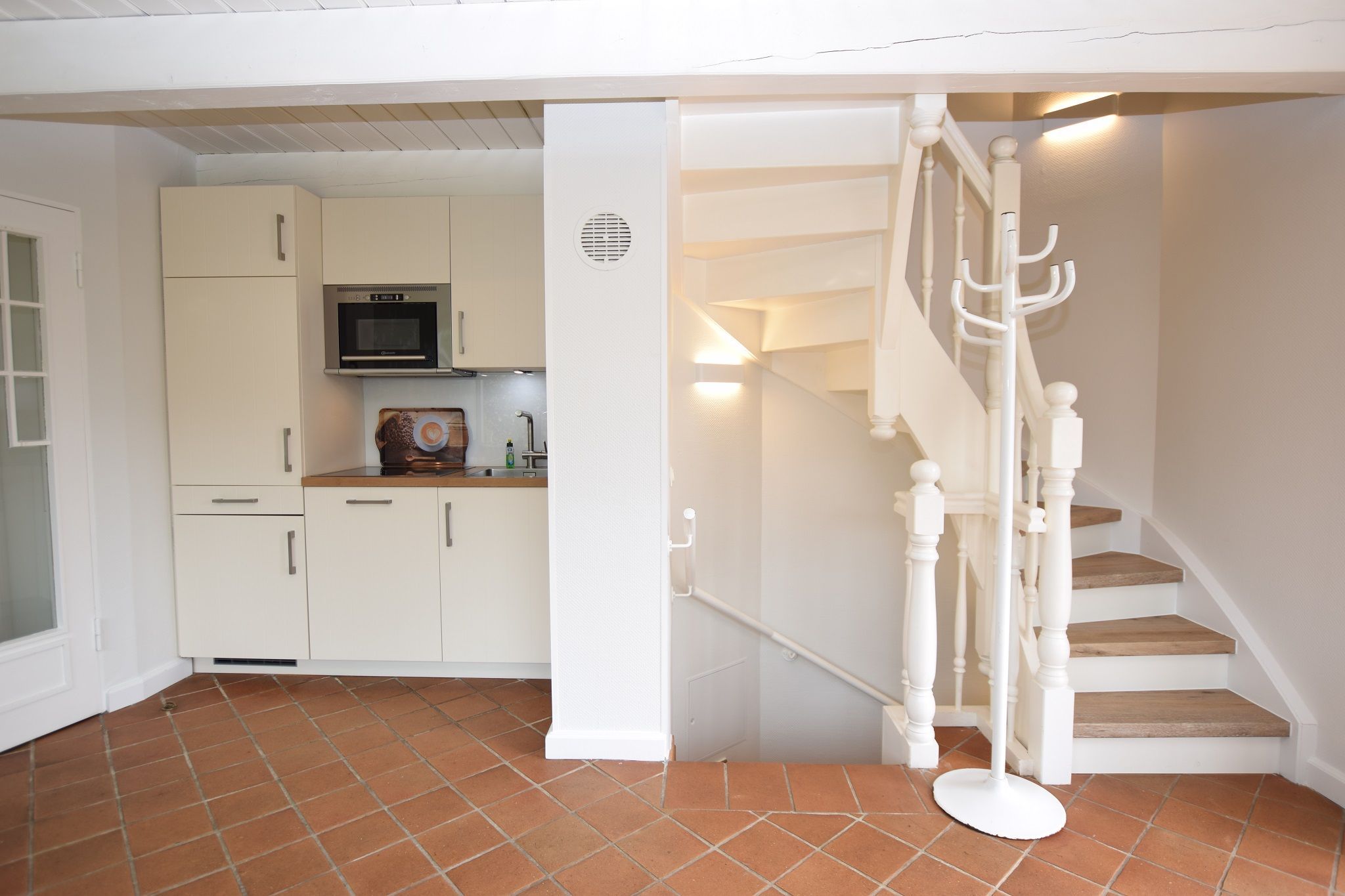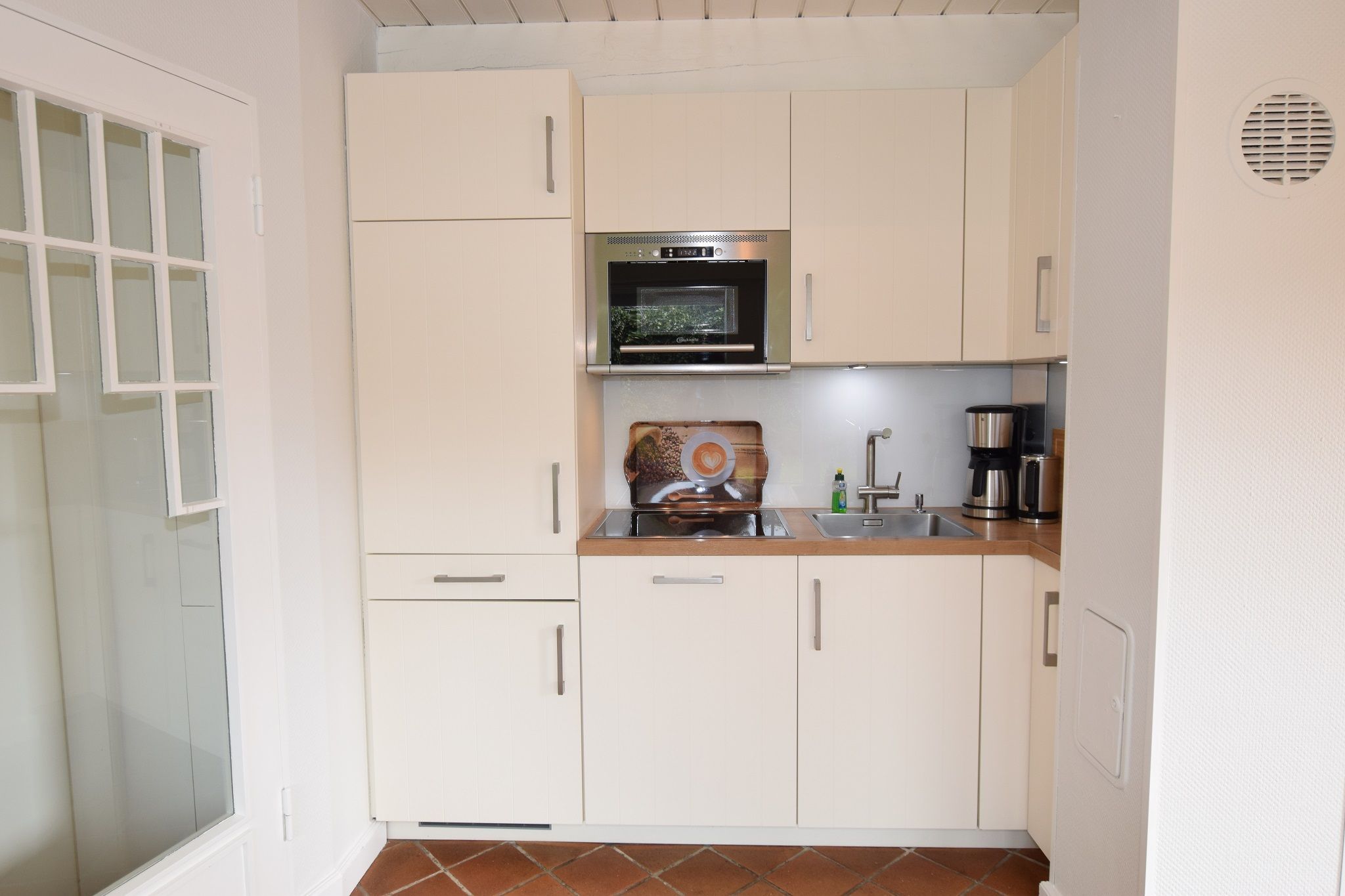 Die Pantry hat einen Geschirrspüler, eine Mikrowelle, ein 4-Platten-Ceranfeld und einen Kühlschrank mit 3-Sterne-Gefrierfach. Kaffeemaschine, Wasserkocher und Toaster gehören zur Grundausstattung.