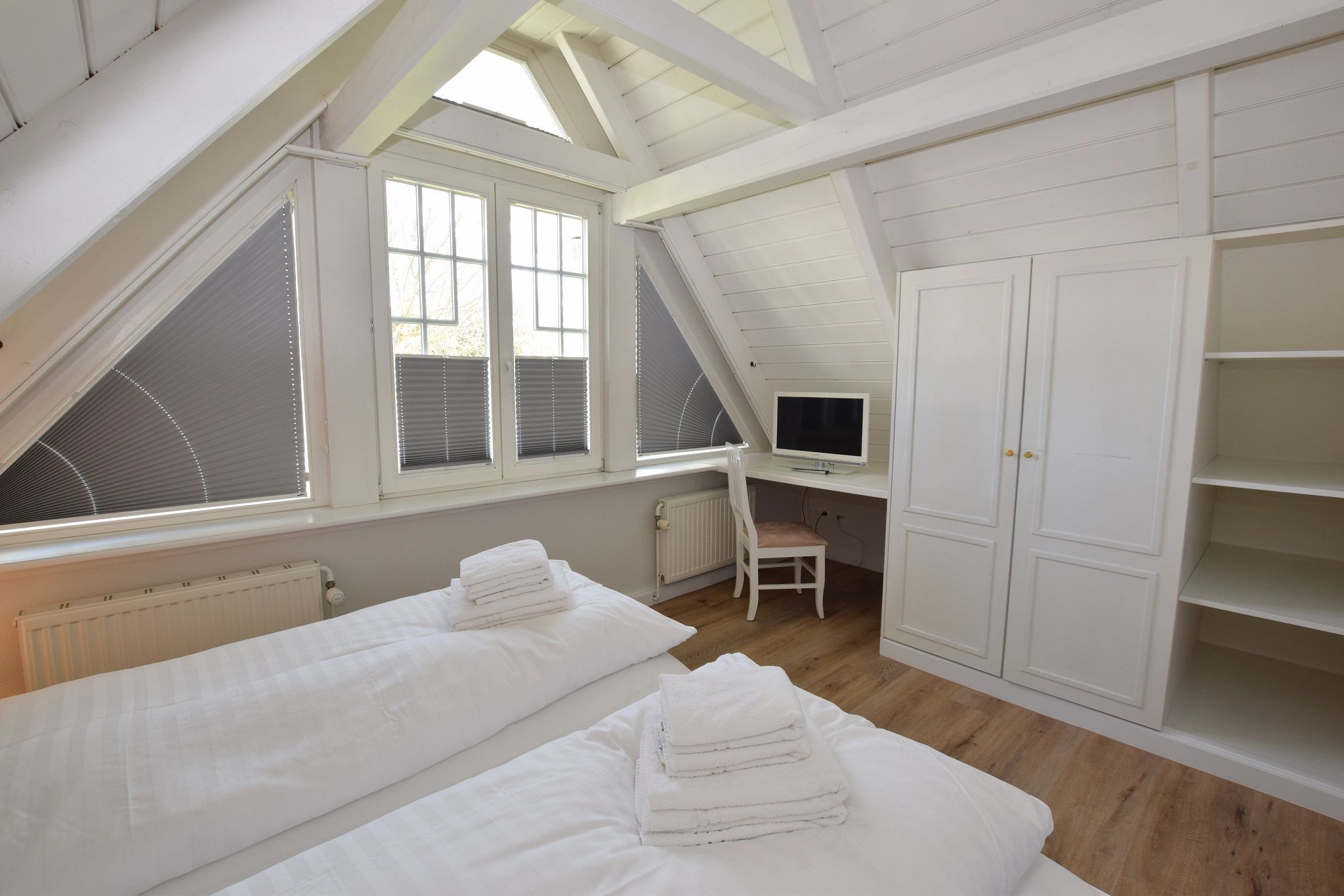 Das 1. geräumige Schlafzimmer (Vinylboden) hat ein gutes Doppelbett (Einzelmatratzen 0,90 x 2,00 m) und Flachbild-TV sowie ein schickes Wannenbad/WC.