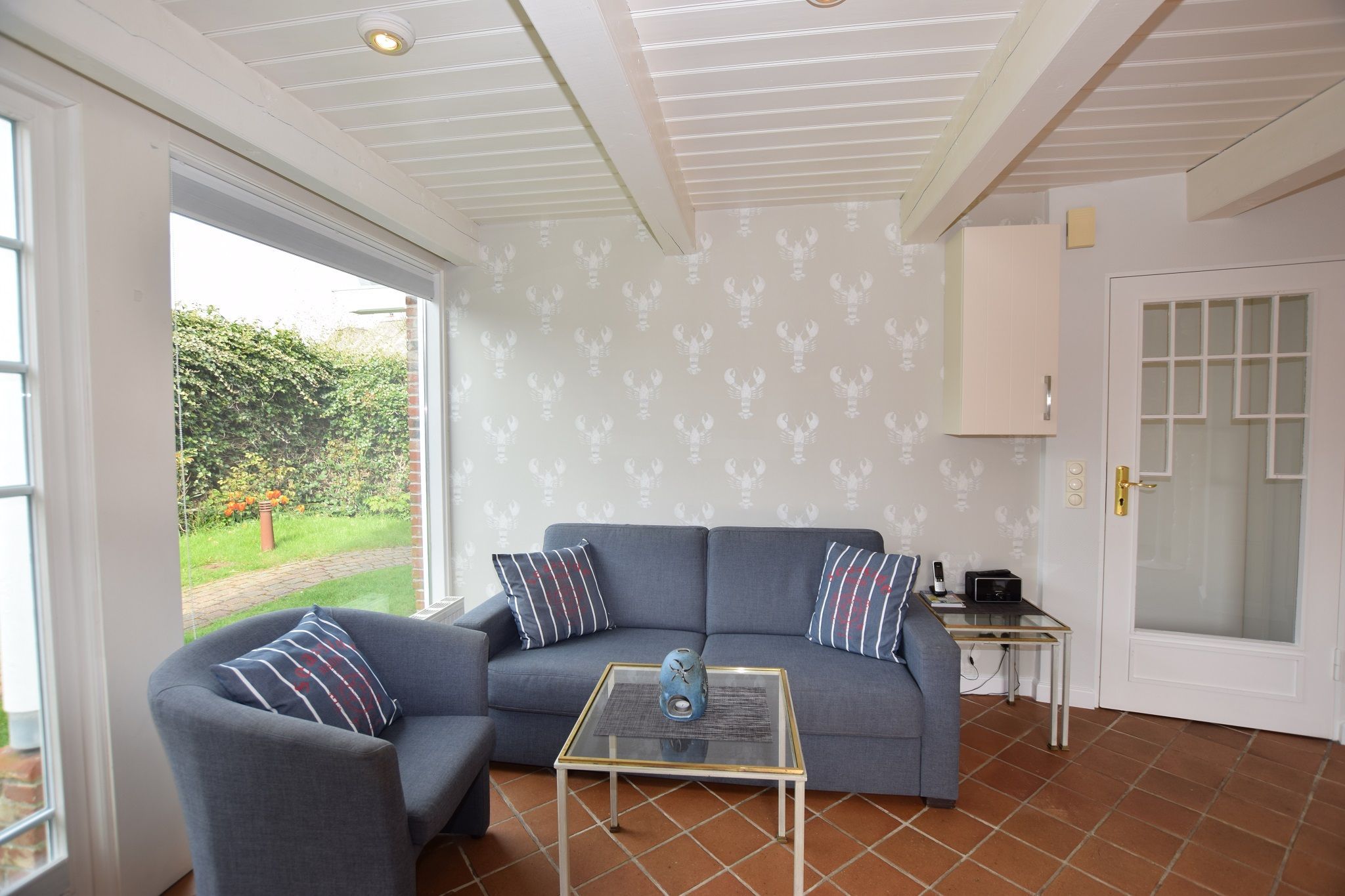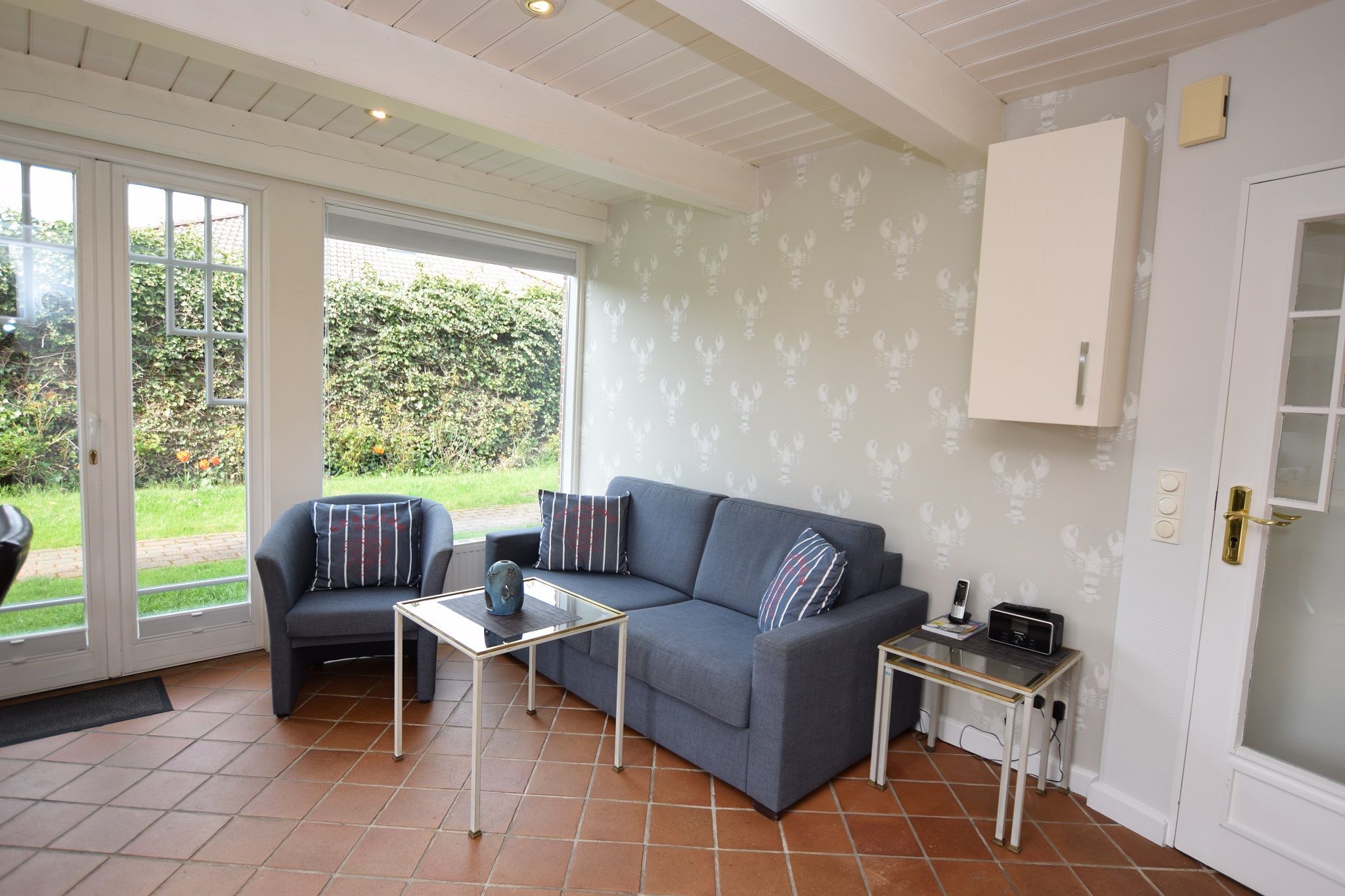 Das Wohnzimmer ist mit einem Zweisitzer-Sofa mit Schlaffunktion (1,50 x 1,90 m), ein Sessel, einem Essplatz, einem Telefon mit Telefonflatrate ins deutsche Festnetz (Handynummern gesperrt), W-Lan, Flachbild-TV, einer Radio/CD-Anlage und einer Pantry ausgestattet.