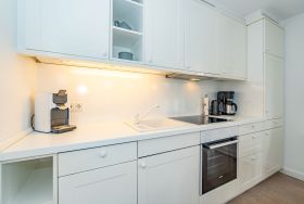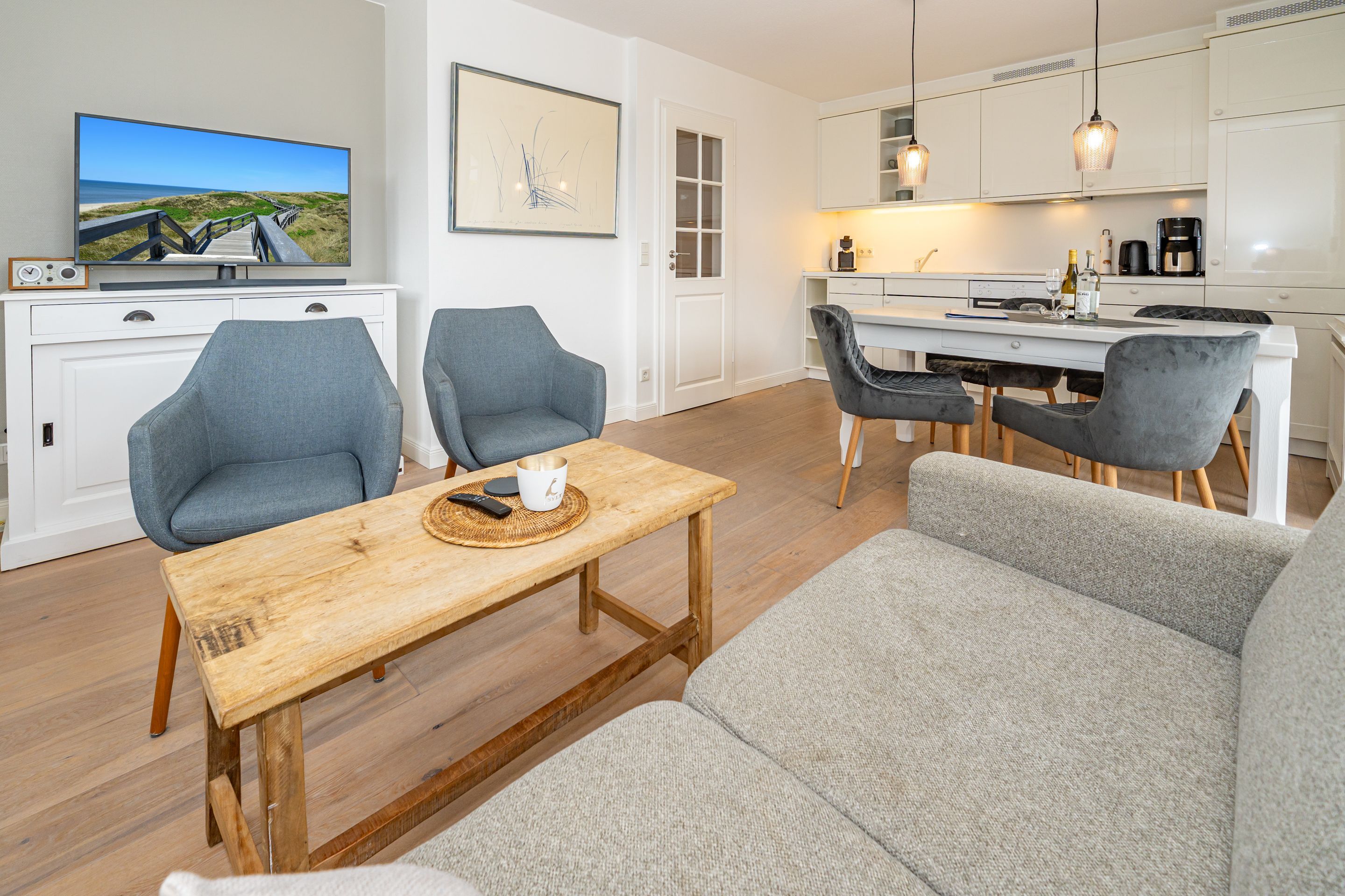 Im Eingangsbereich befindet sich die Diele mit Garderobe. Daran schließt das Wohnzimmer mit direktem Zugang zur geschützten Südterrasse an. Der Wohnraum ist mit einer Sitzgarnitur (2-Sitzer-Couch mit hochwertiger ausziehbarer Schlafmöglichkeit und 2 Sesseln), einem separaten Essplatz, Flachbild-TV, WLAN und einer offene Küche ausgestattet. Die voll ausgestattete weiße Hochglanzküche lässt mit Geschirrspüler, Ceranfeld (4 Felder) und Backofen kaum Wünsche offen. Kaffeemaschine, Wasserkocher und Toaster gehören zur Grundausstattung.