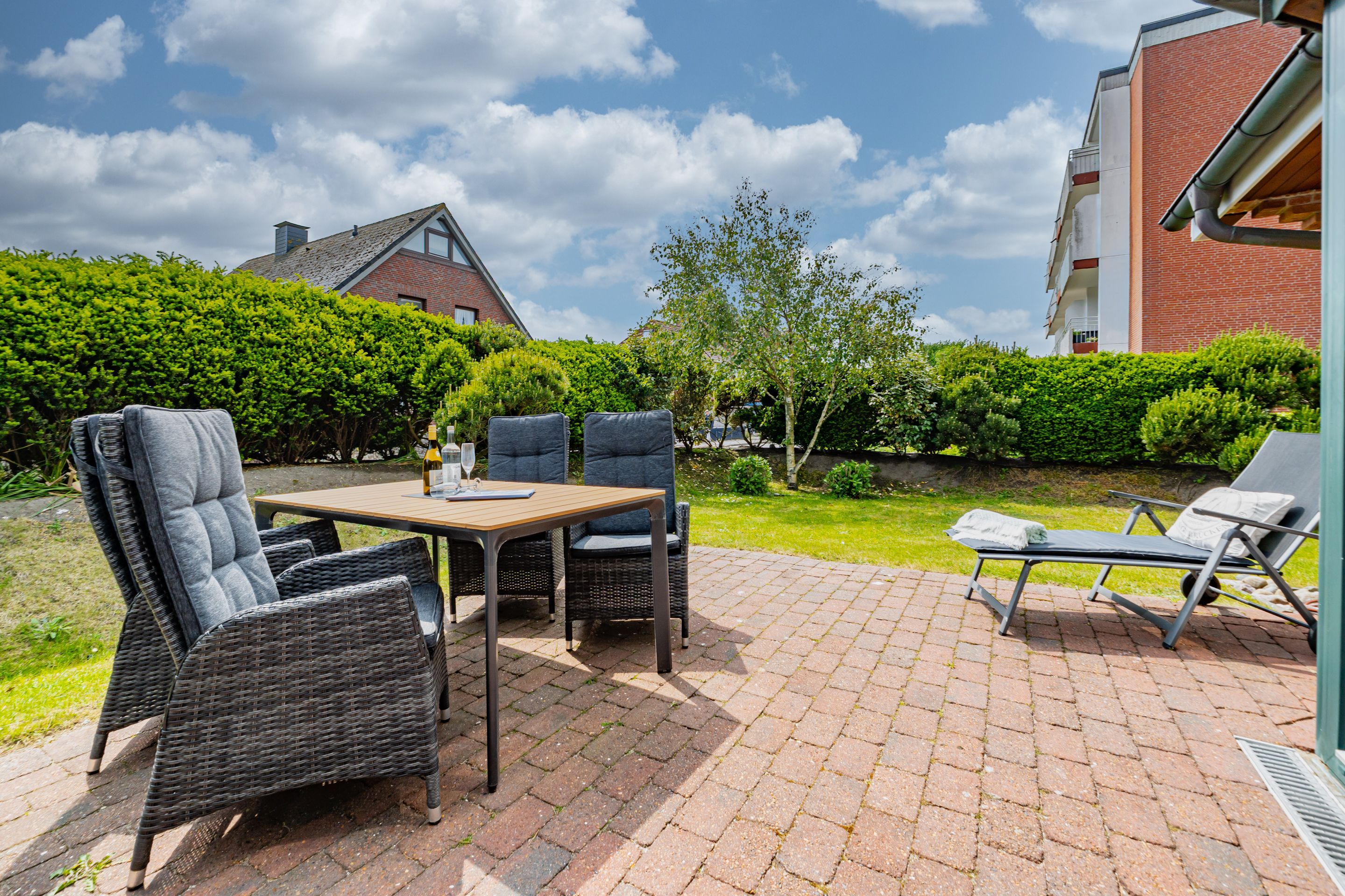 Hochwertig ausgestattete 2,5-Zimmer-Ferienwohnung mit ca. 55 qm zur Südseite mit möblierter Terrasse (mit Balkonmöbeln, Auflagen und Sonnenschirm) für bis zu 4 Personen.