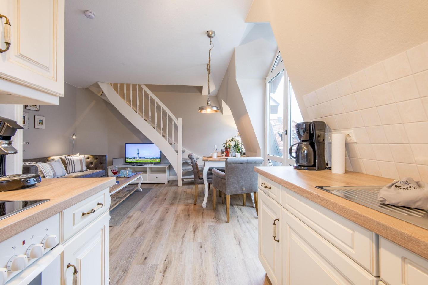 Die offene Einbauküche ist modern ausgestattet und bietet allen Komfort, den Sie für Ihren Aufenthalt benötigen. Mit einem Geschirrspüler und einer Filterkaffeemaschine ist alles vorhanden, um Ihre Mahlzeiten entspannt vorzubereiten.