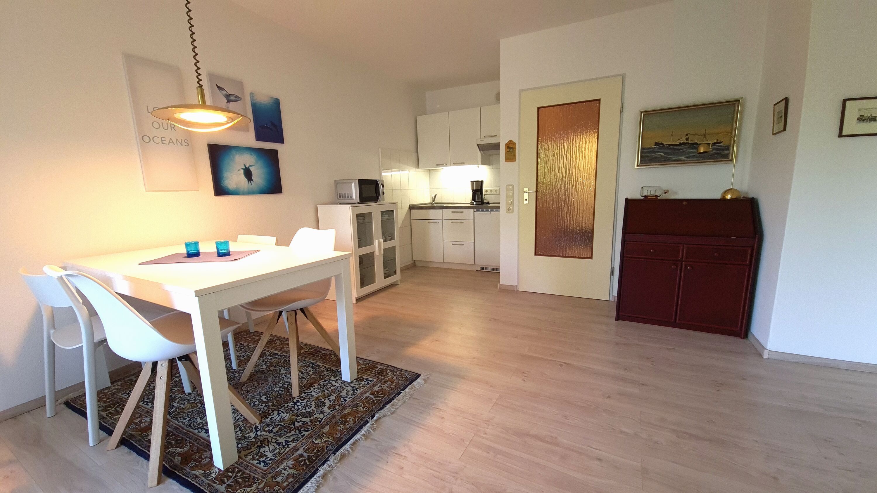 Das Appartement 32 ist ein 1-Raum-Apartment im 3. Obergeschoss für bis zu 2 Personen mit 38 qm. Der möblierte Westbalkon bietet morgens Schatten und nachmittags Sonne.