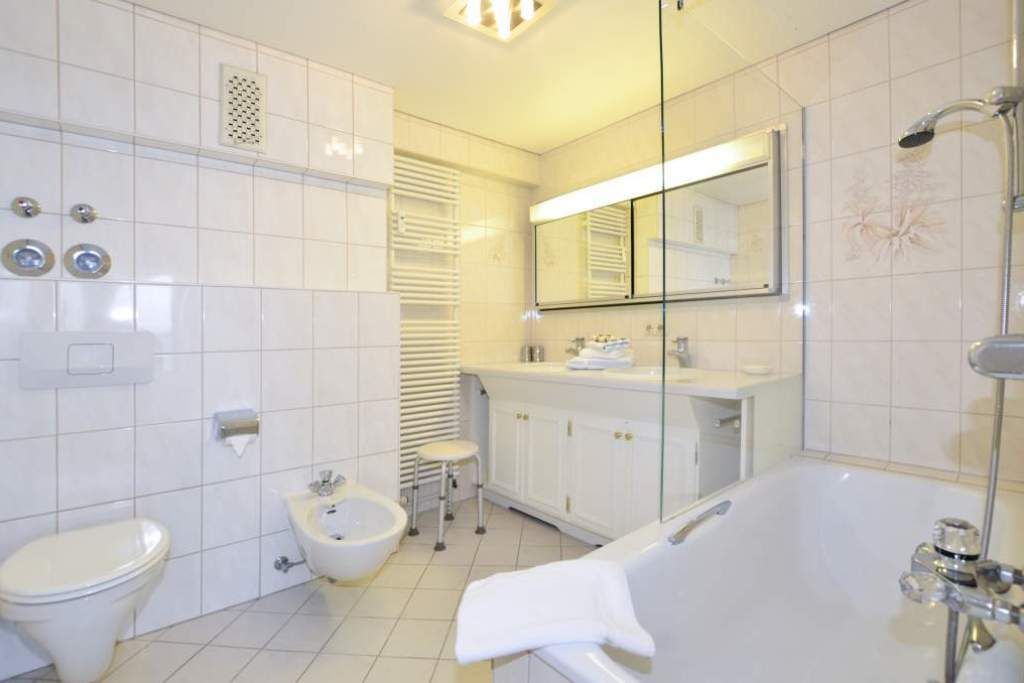 Das großzügige Bad bietet Wellness-Komfort auf hohem Niveau: Ein Doppelwaschtisch, eine Echtglas-Duschvorrichtung in der Badewanne, ein Bidet, ein Handtuchtrockner und ein Fön stehen Ihnen zur Verfügung geschmackvoll ausgestattet und durchdacht gestaltet.