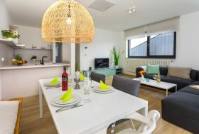 • Großes Wohnzimmer mit Esstisch, Fernseher (40 Zoll) und gemütlicher Couch