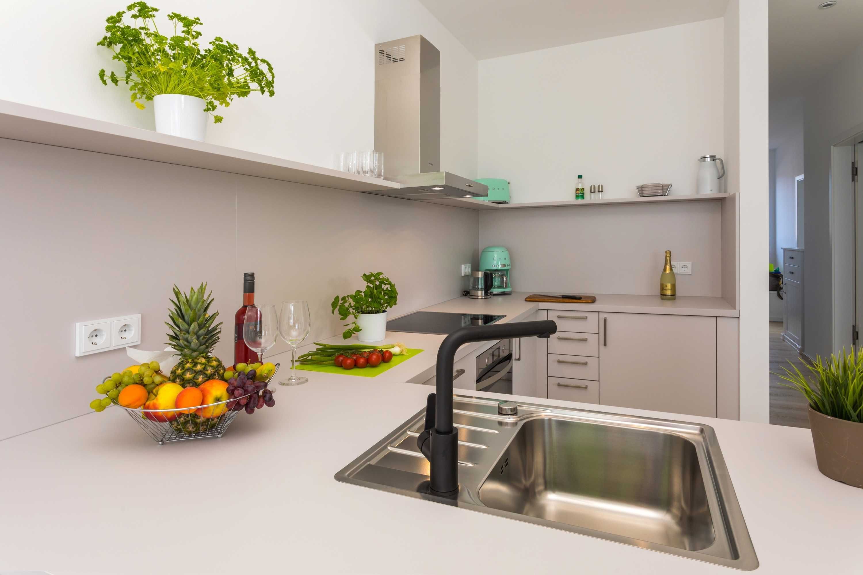 • voll ausgestattete Küche mit Spülmaschine, Mikrowelle, Kaffeemaschine, Backofen, Herd, Kühlschrank mit Gefrierschrank
