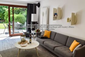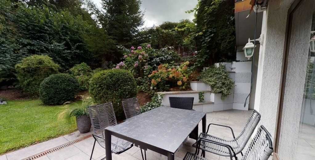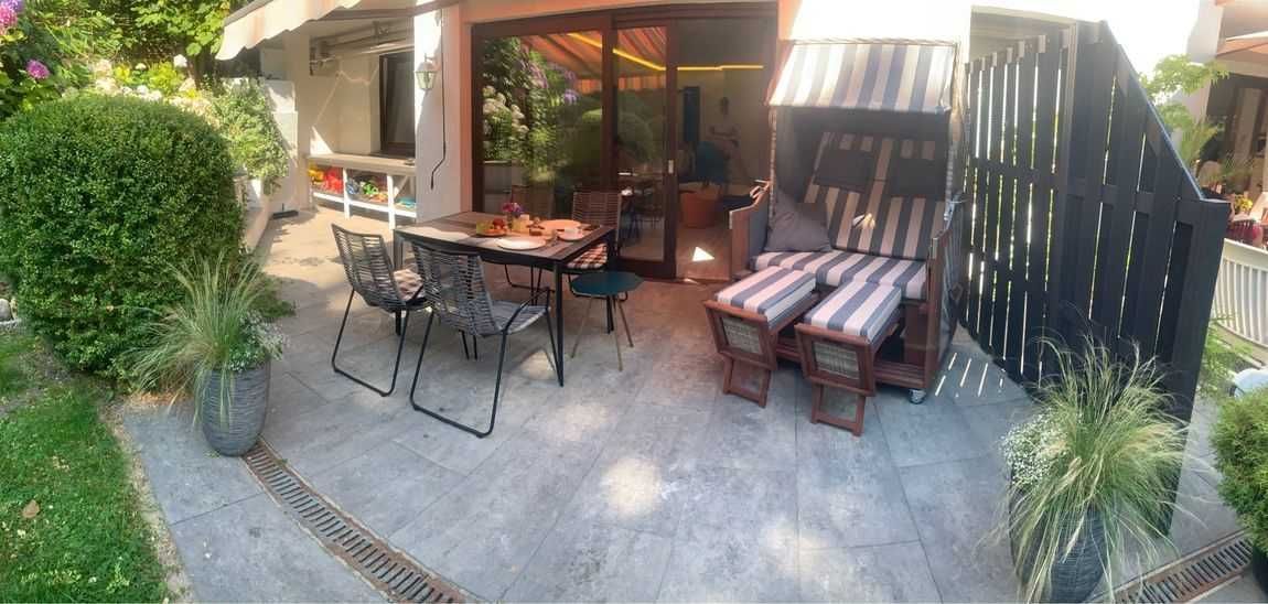 Zum Garten hin schließt sich eine kleine Südterrasse an, möbliert mit Sitzgelegenheiten und Tisch. Ab etwa mittags können Sie hier in aller Ruhe die Sonne genießen.