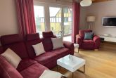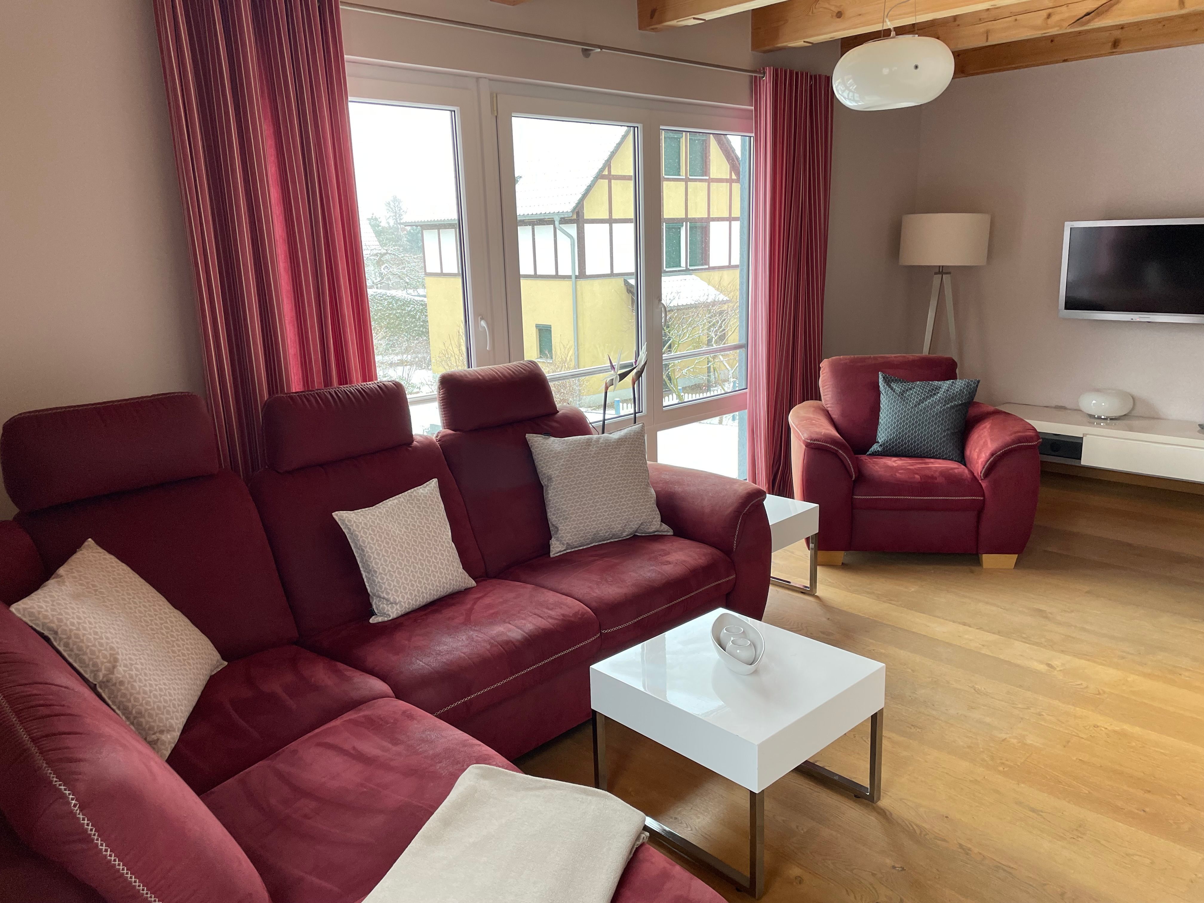 OG: gemütlicher Wohnbereich mit Eckcouch und Sessel und Panasonic Flachbild-TV mit ca. 94cm Bilddiagonale