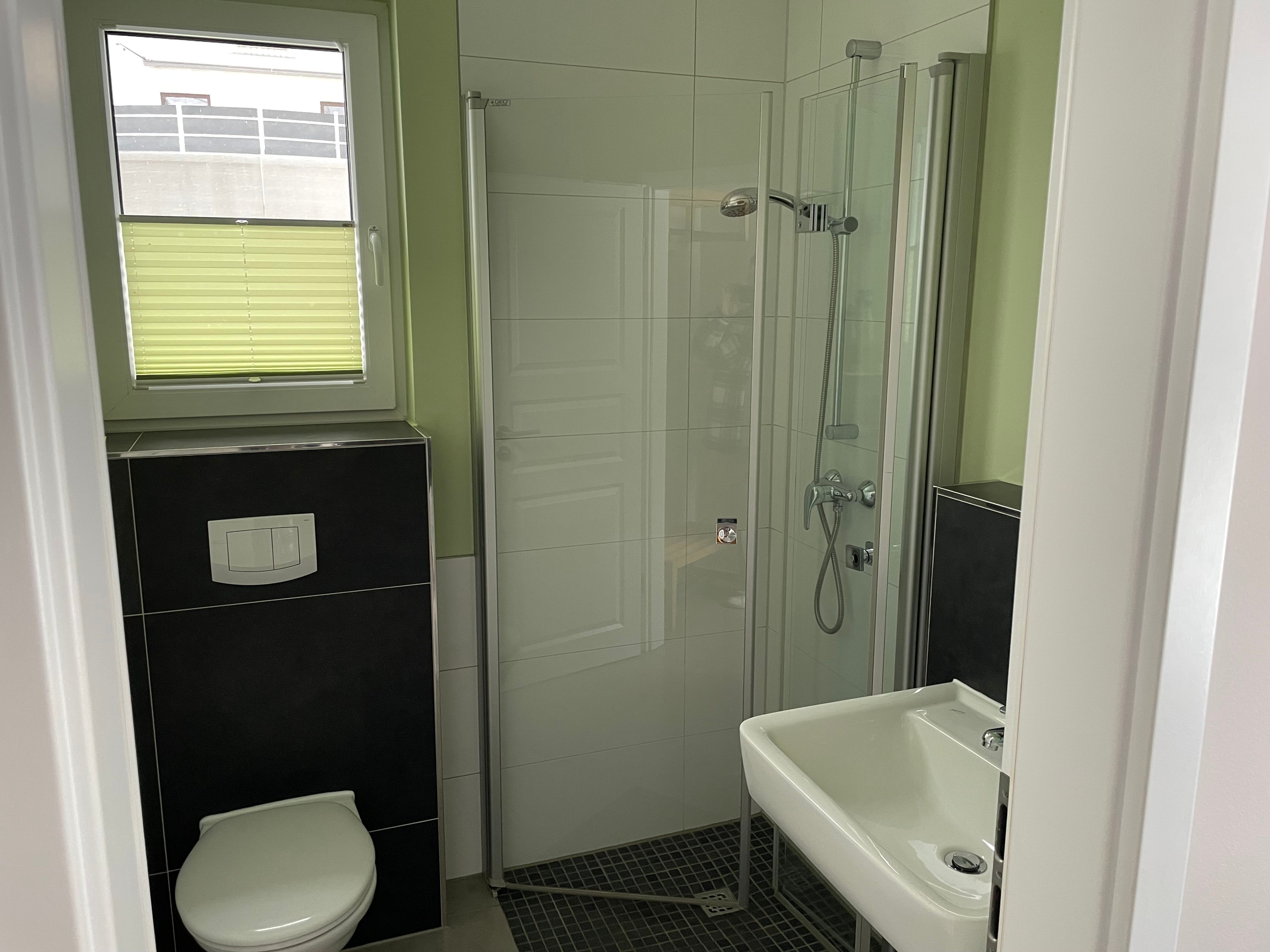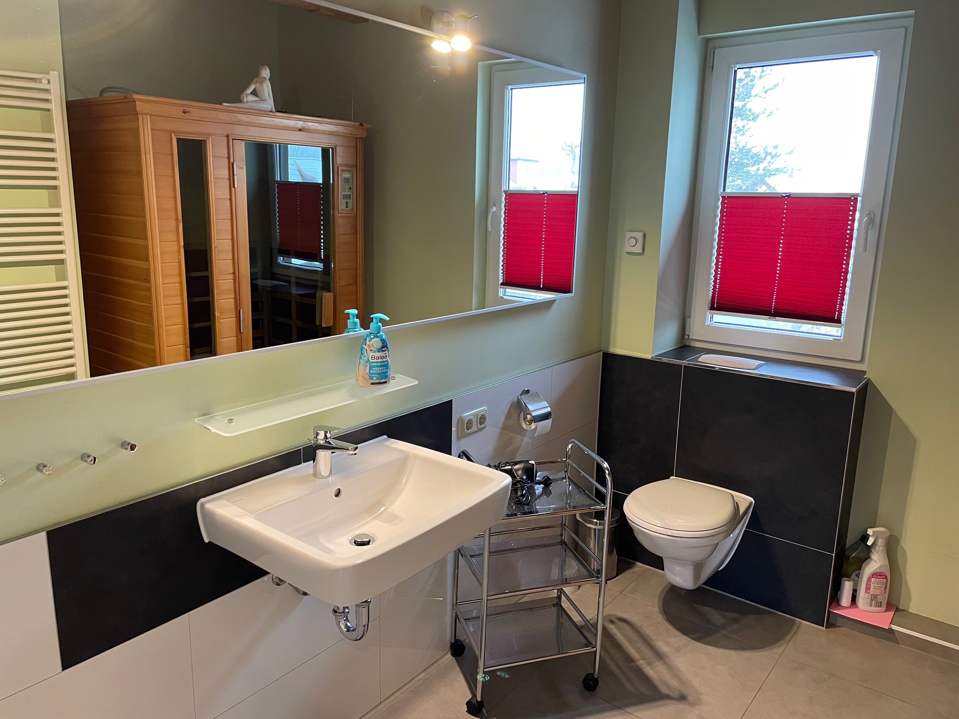 Bad mit ebenerdiger Dusche, WC, Handtuchtrockner und Infrarot-Wärmekabine für 2 Personen (Fußbodenheizung)