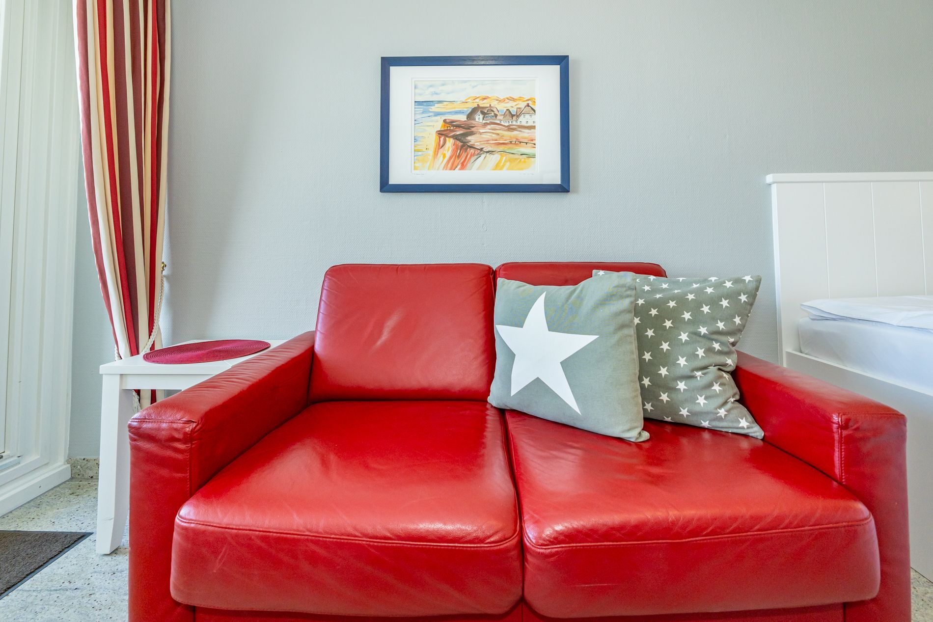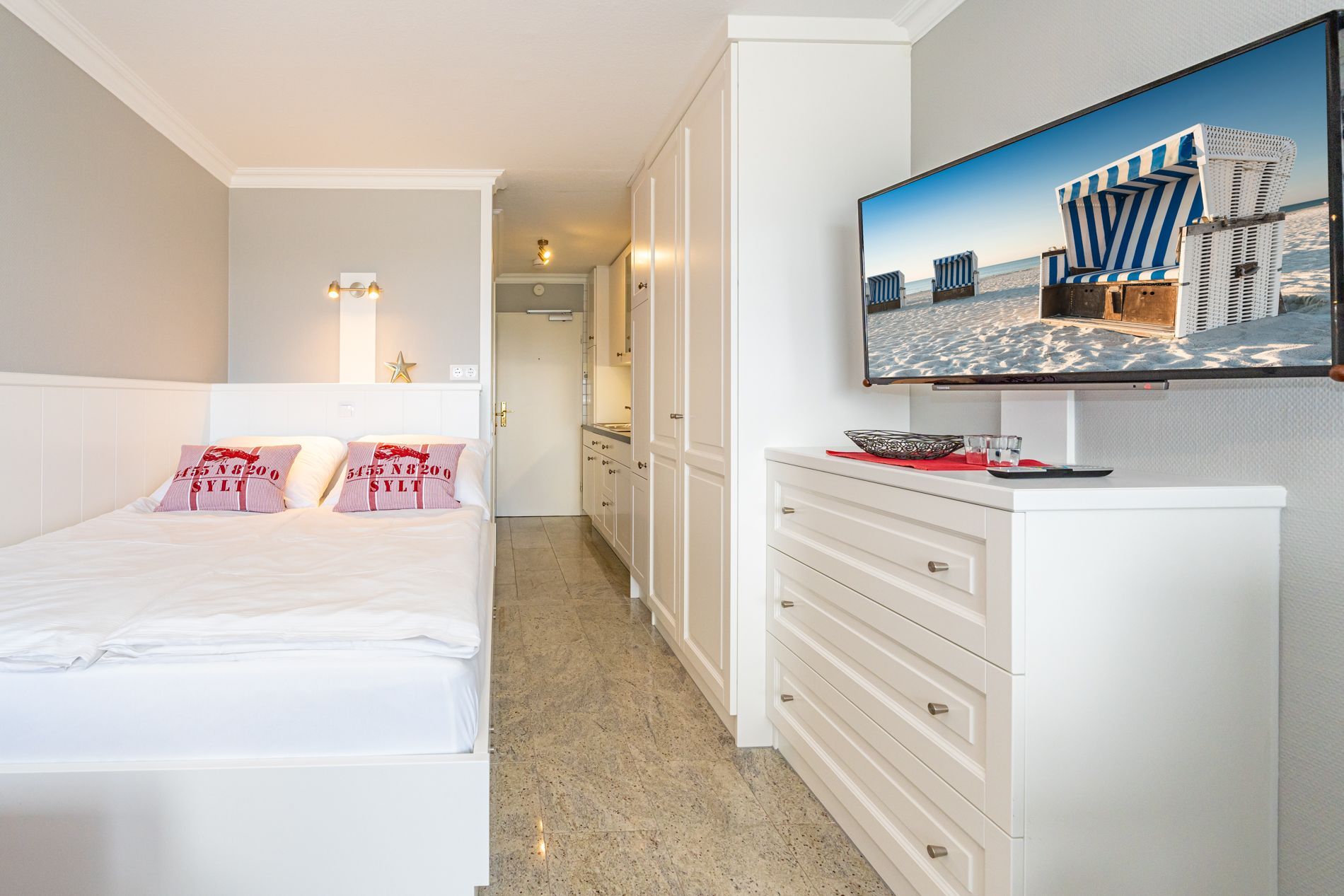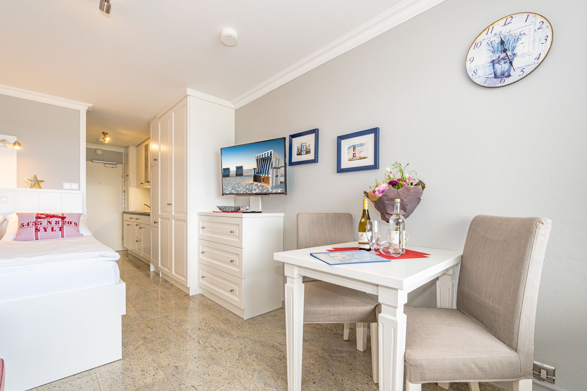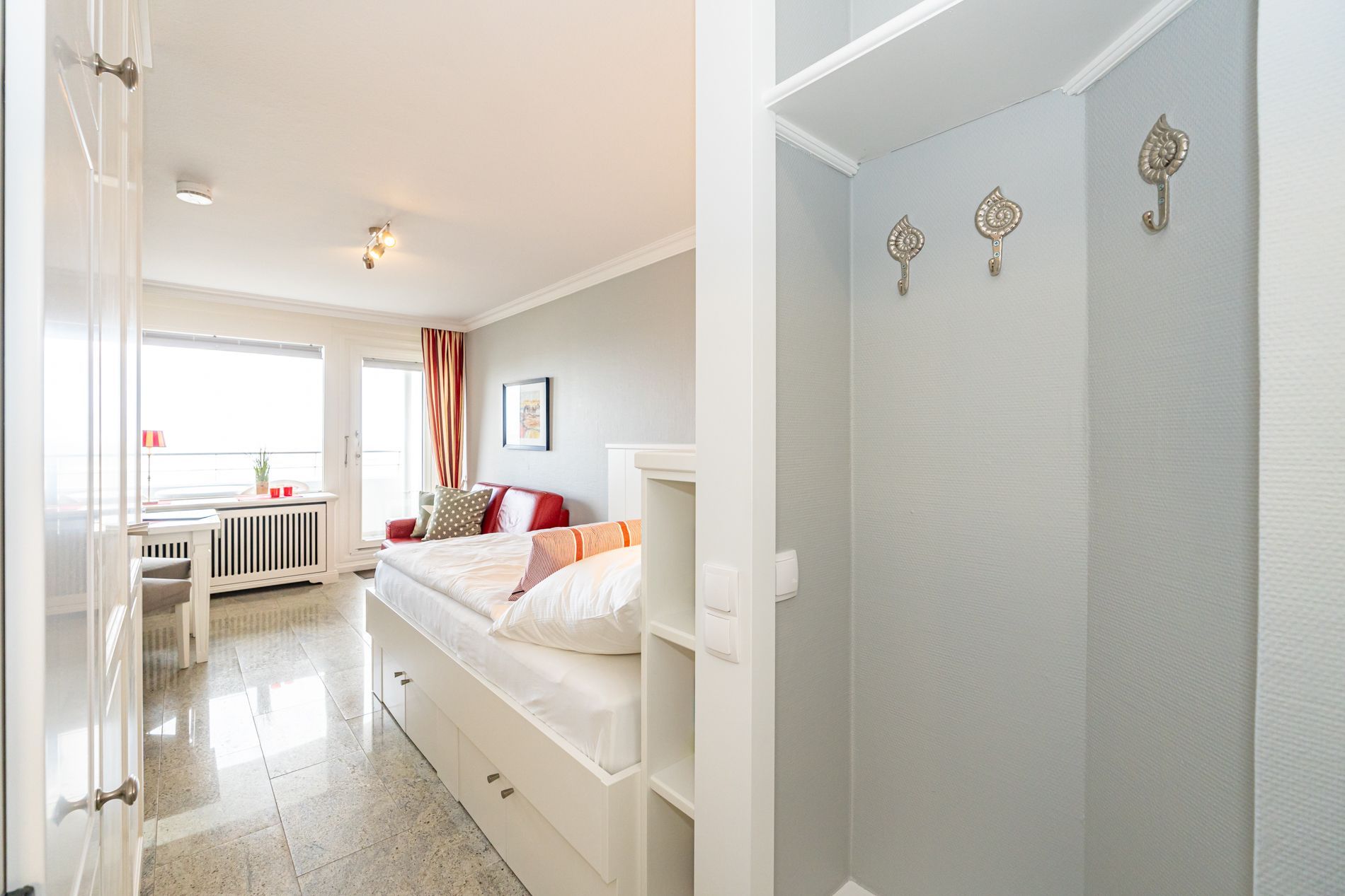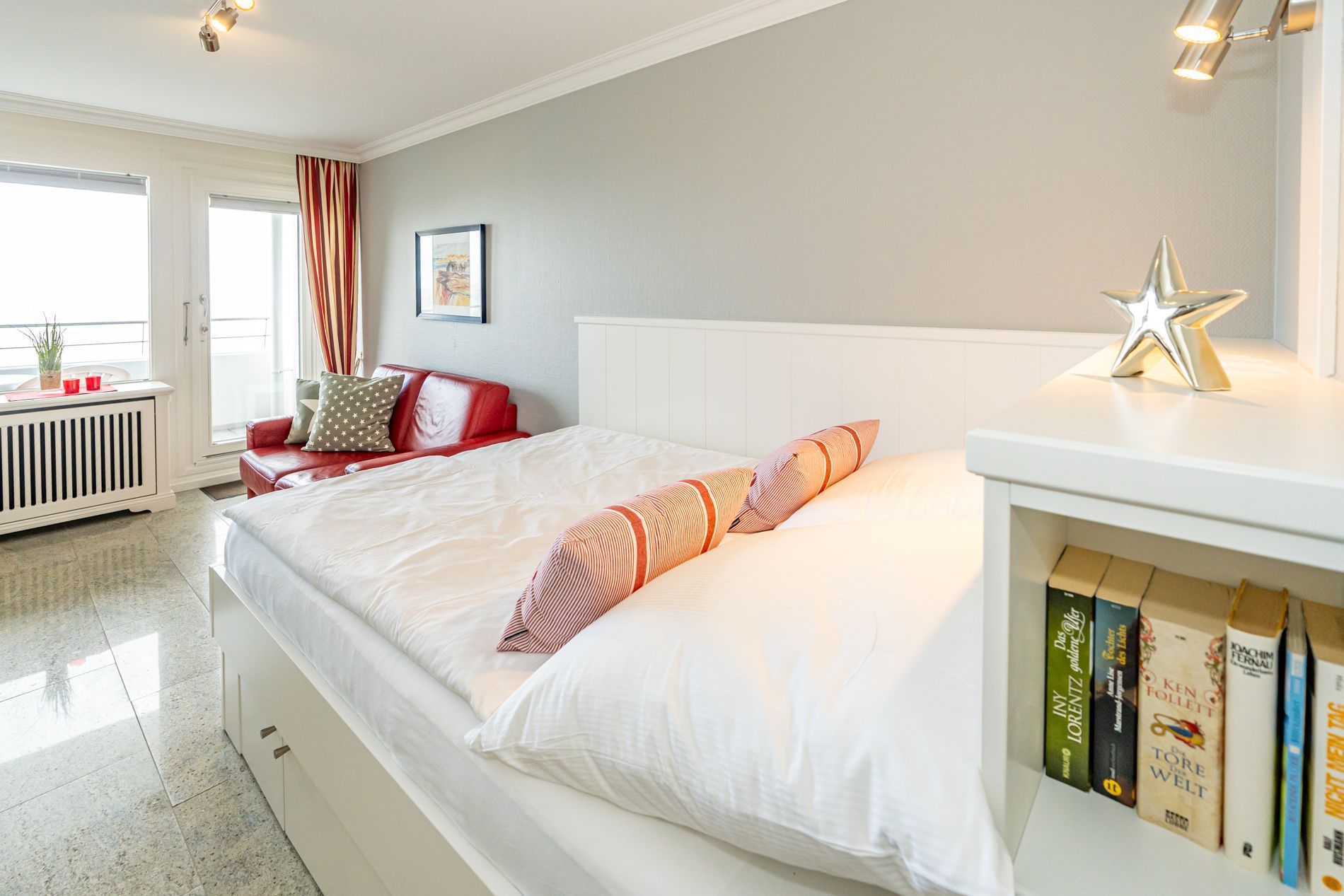 Gemütliche 1-Zimmer-Nichtraucher-Ferienwohnung ca. 25 qm in der 4. Etage zur Westseite mit Meerblick und Westloggia (Nachmittagssonne, mit Balkonmöbeln und Auflagen) für max. 2 Personen.