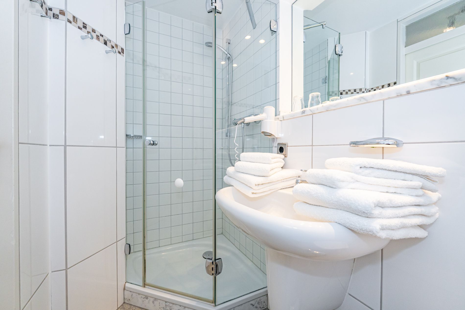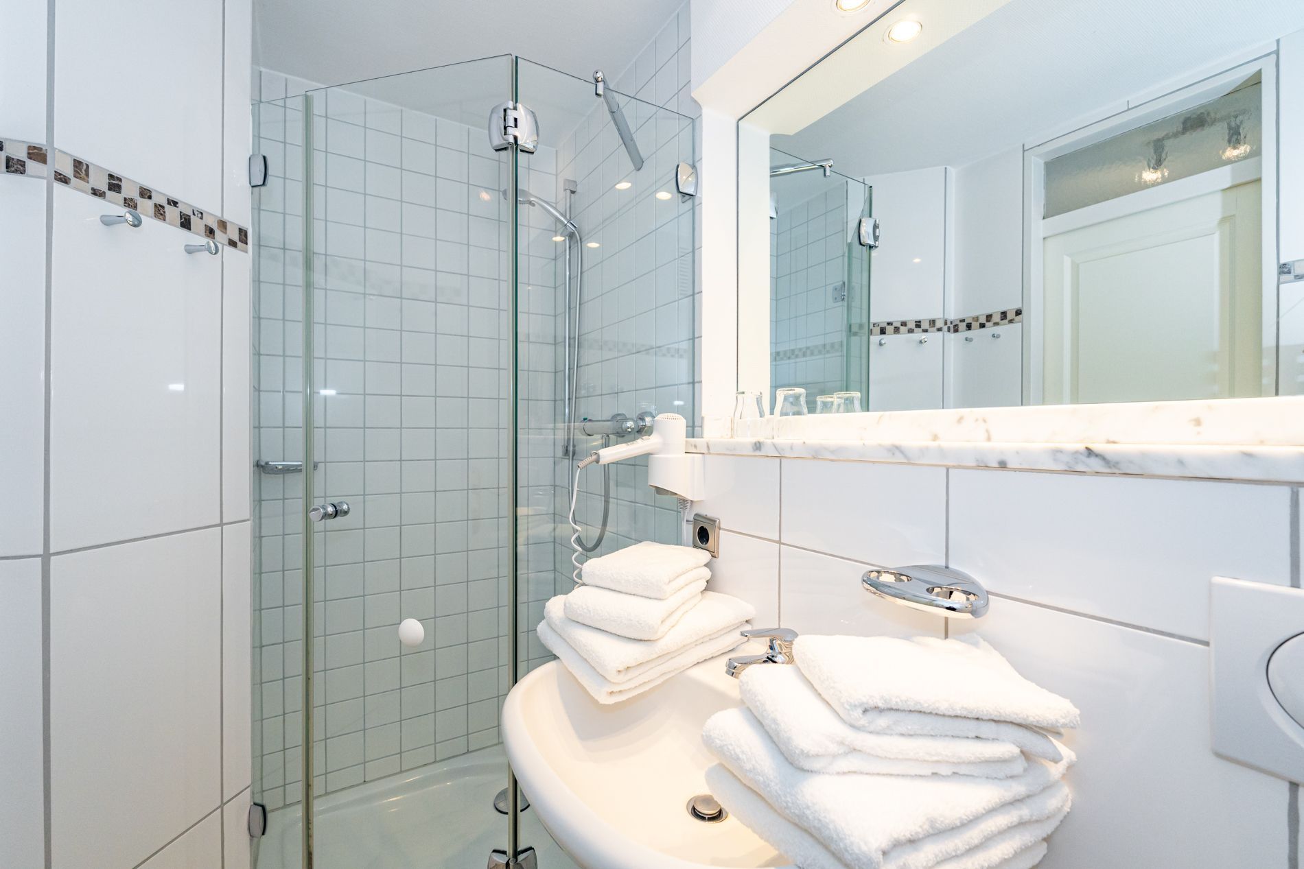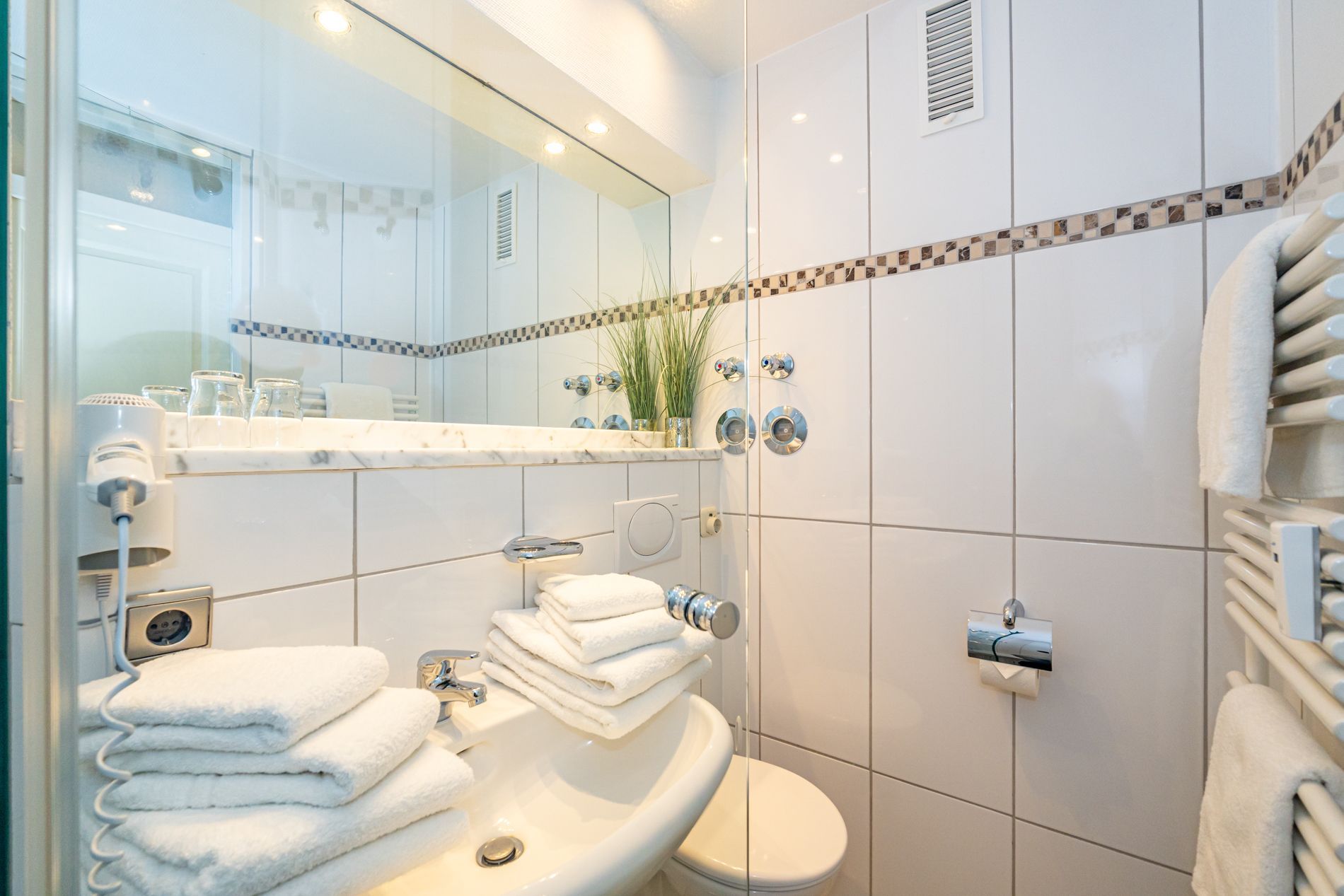 Im hellen, freundlichen Bad befinden sich eine Dusche, ein WC und ein Waschtisch.