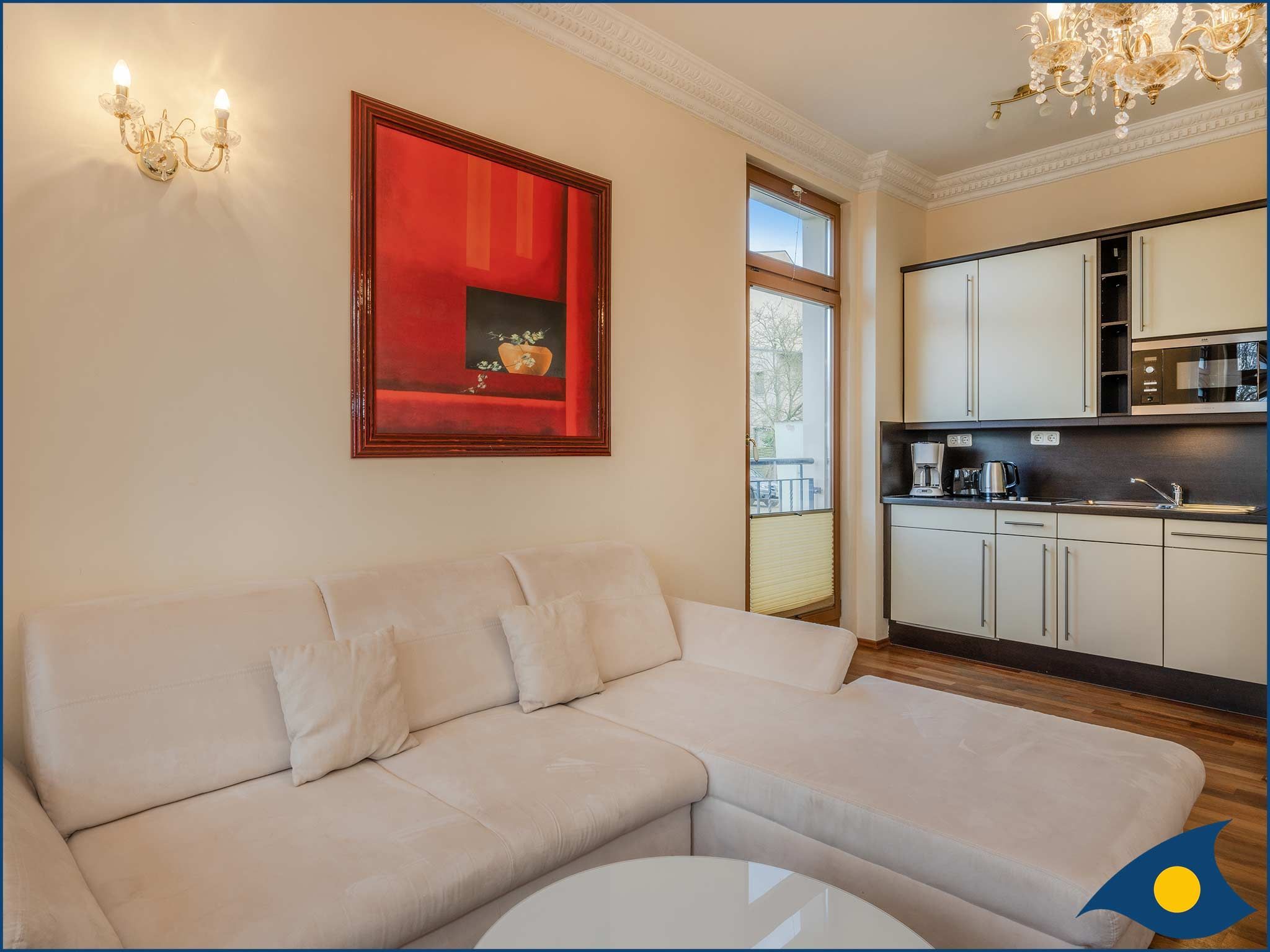 Die helle Wohnung verfügt über einen großzügigen Wohn-/Essbereich mit Zugang zur Terrasse, auf der Sie gemütlich dem bunten Treiben auf der Promenade zuschauen können. Die Aufbettung der 3. Person findet auf der Schlafcouch Platz. Die offene Küche ist mit einer Spülmaschine, einer Mikrowelle, einem 2 Platten-Ceranfeld und Kühlschrank ausgestattet.