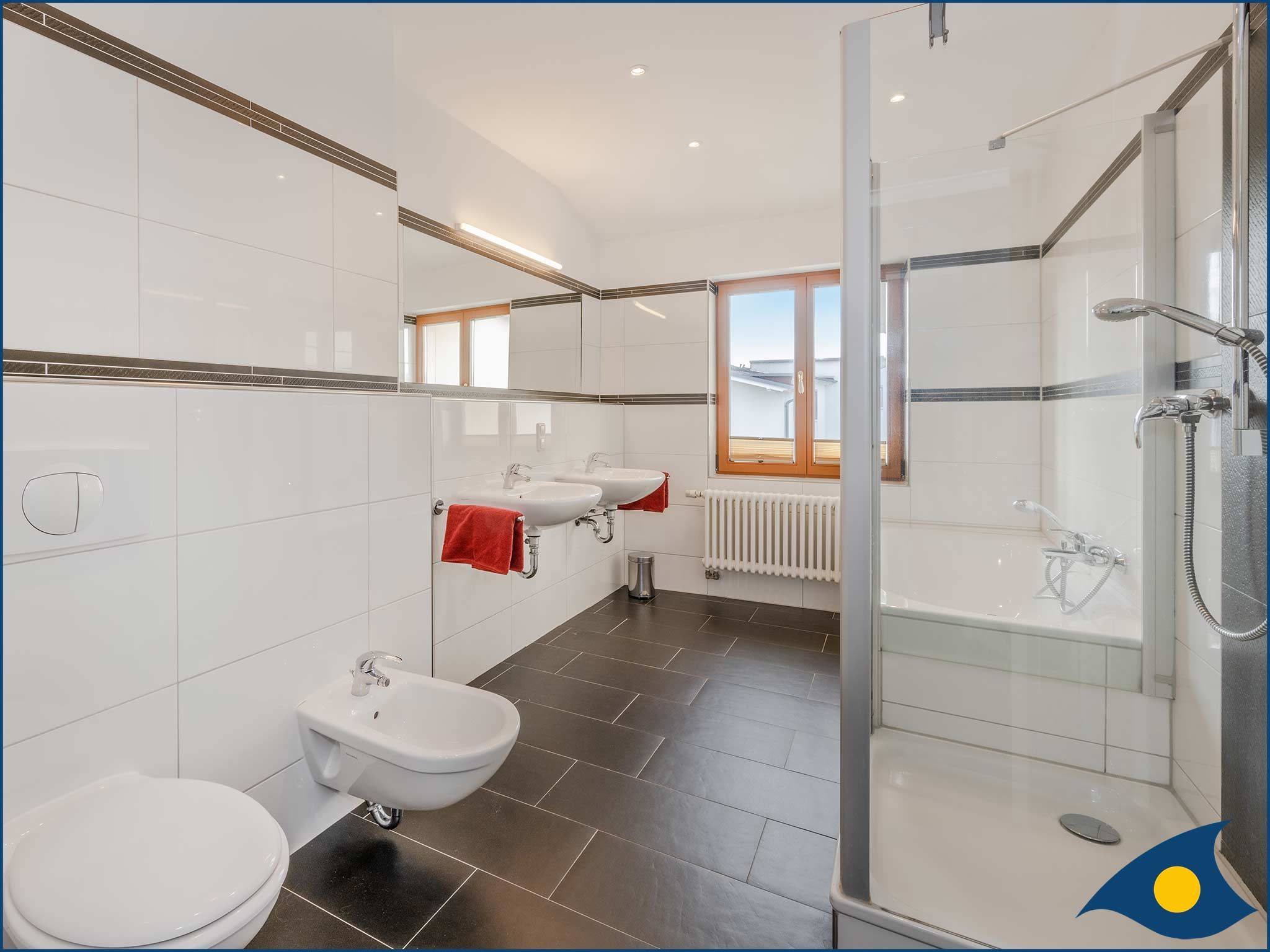 Das Tageslicht-Badezimmer überzeugt mit Badewanne und Dusche sowie zwei Waschbecken und Bidet.