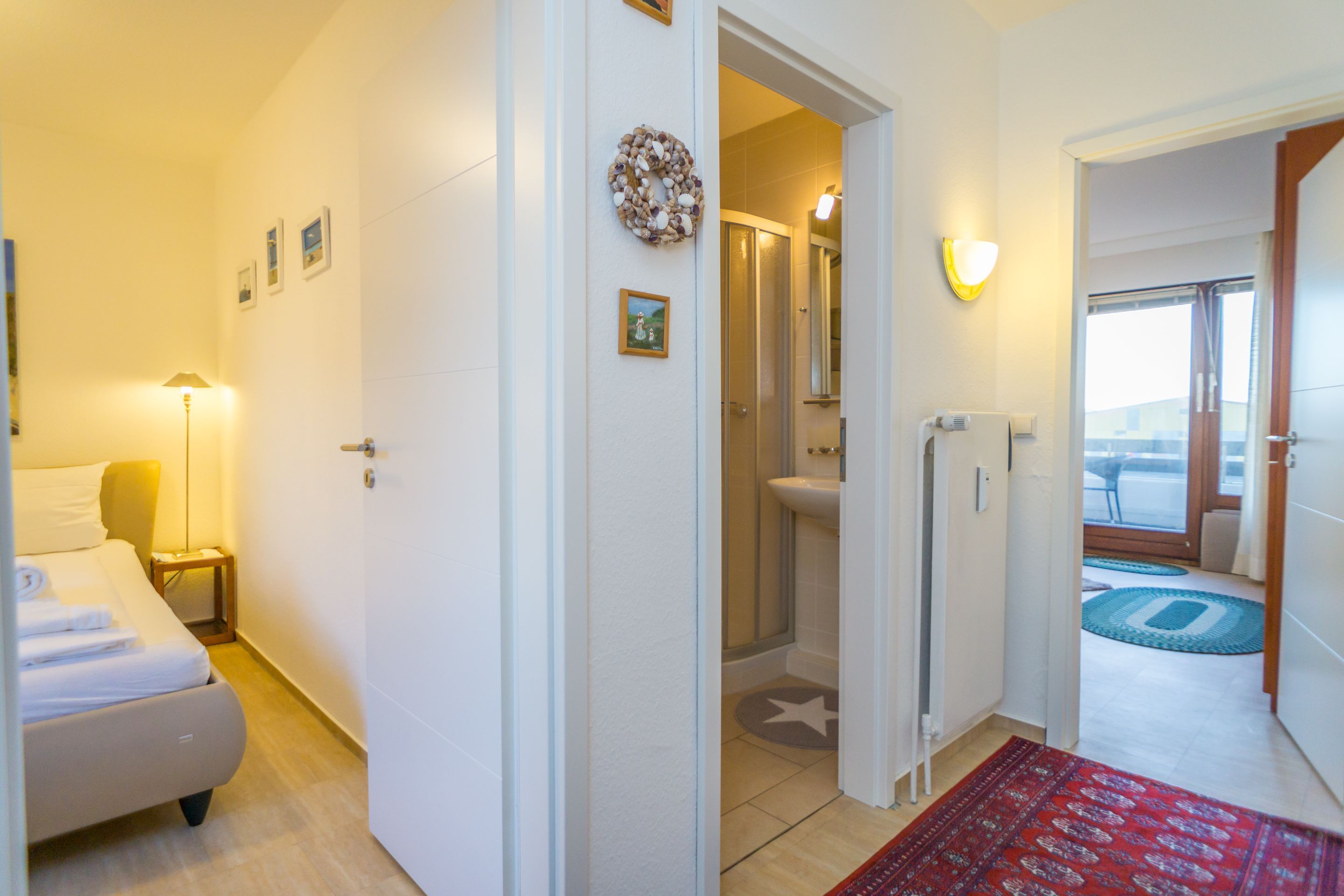 Die moderne Kochnische verfügt über eine Mikrowelle, einen Geschirrspüler, ein Cerankochfeld und hat ein Fenster. Kaffeemaschine, Wasserkocher und Toaster gehören selbstverständlich zur Grundausstattung. Das separate Schlafzimmer ist mit einem feststehenden Doppelbett ausgestattet, das aus zwei Einzelmatratzen (86 x 200 cm) besteht. Das helle Duschbad/WC bietet eine Dusche, ein WC und einen Waschtisch.