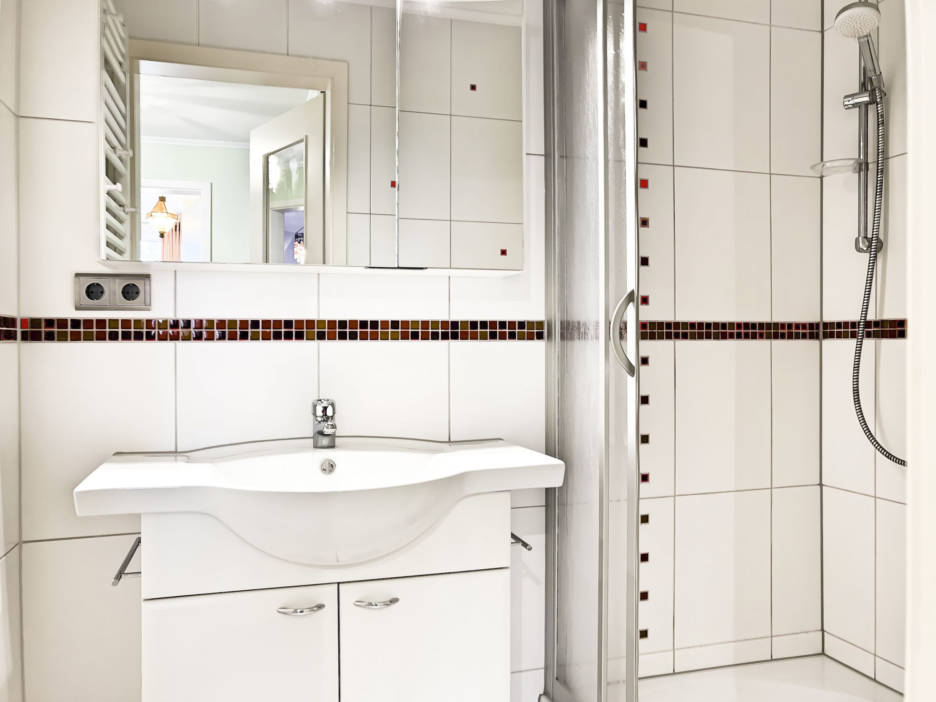 • Modernes Badezimmer mit erfrischender Dusche und beleuchtetem Spiegel