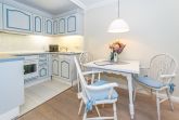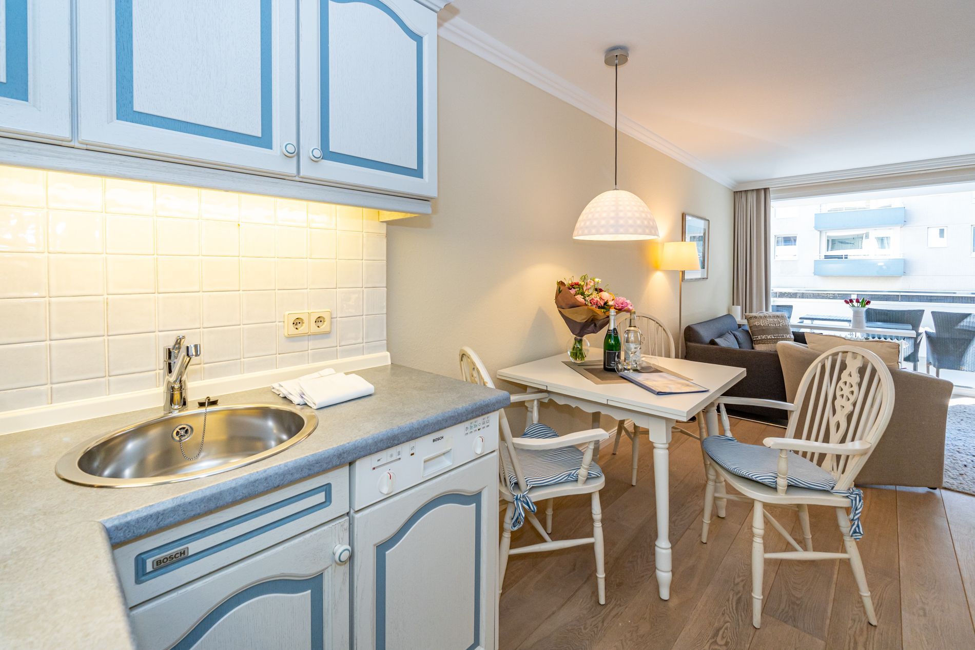 Der Wohnbereich ist mit einem hochwertigen Echtholzboden versehen und verfügt über eine gemütliche 2-Sitzer-Schlafcouch (Liegefläche ca. 1,50?m x 2,00?m), einen Sessel, einen flexibel nutzbaren Beistelltisch mit abnehmbarem Tablett (auch als Hocker verwendbar), einen Essplatz, SAT-TV und einen Bluetooth-Lautsprecher. Die offene Küchenzeile bietet alles, was Sie für einen angenehmen Aufenthalt benötigen: ein 4-Platten-Cerankochfeld, Backofen, Mikrowelle, Geschirrspüler sowie einen Kühlschrank mit 3*-Gefrierfach. Kaffeemaschine, Wasserkocher und Toaster gehören selbstverständlich zur Grundausstattung.