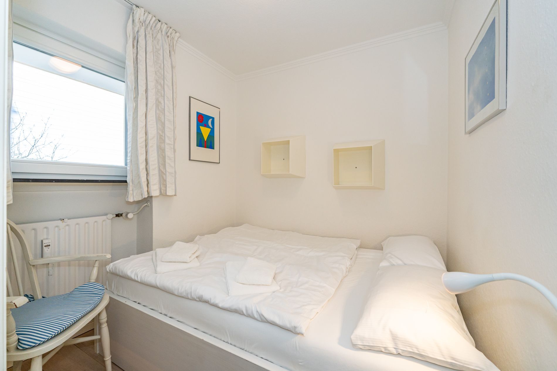 Das separate Schlafzimmer ist mit einem Doppelbett (ca. 1,40?m x 1,90?m) ausgestattet. Auch hier sorgt der Echtholzboden für ein behagliches Wohngefühl. Das Badezimmer verfügt über eine Dusche, ein WC sowie einen Waschtisch und ist funktional und gepflegt eingerichtet.