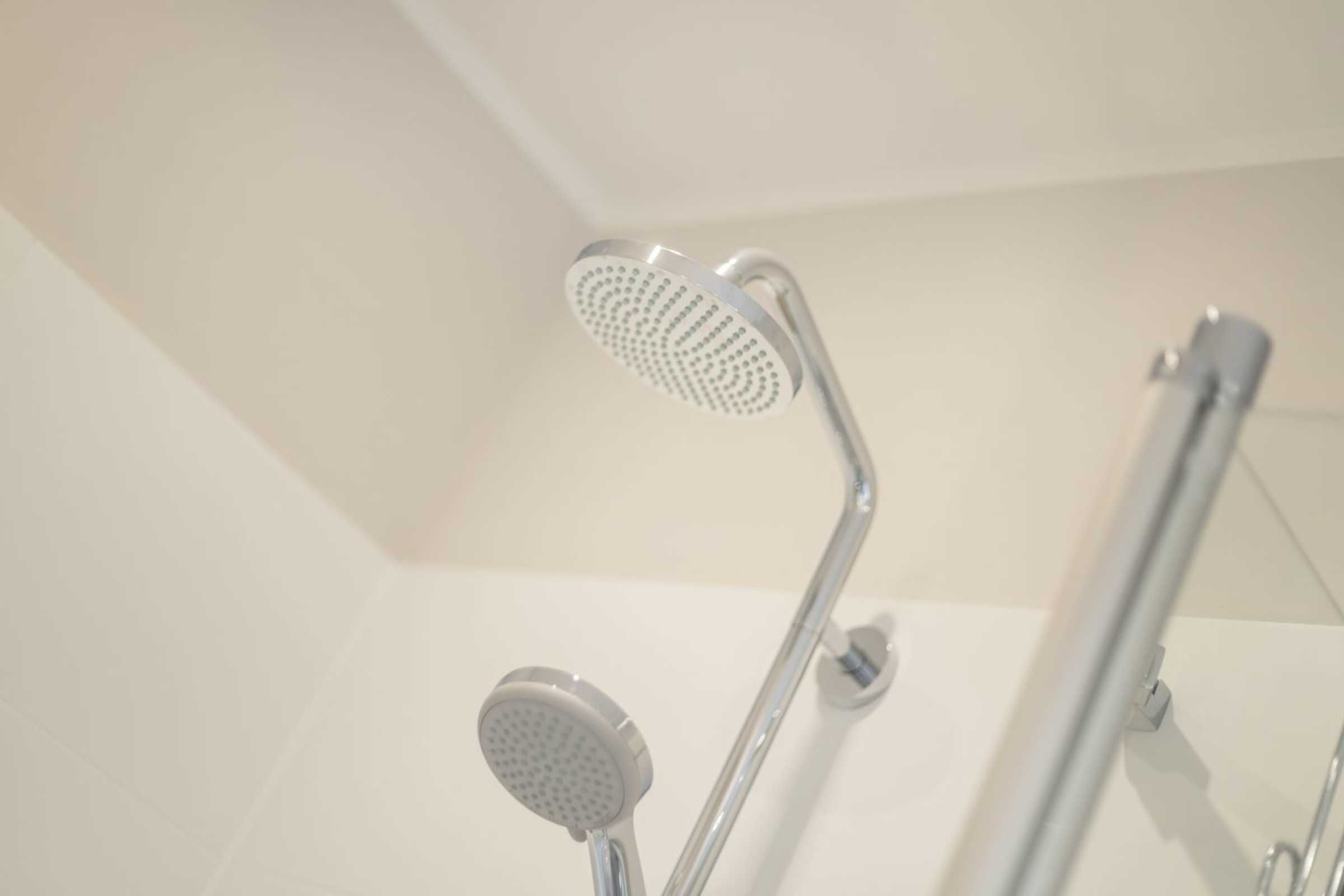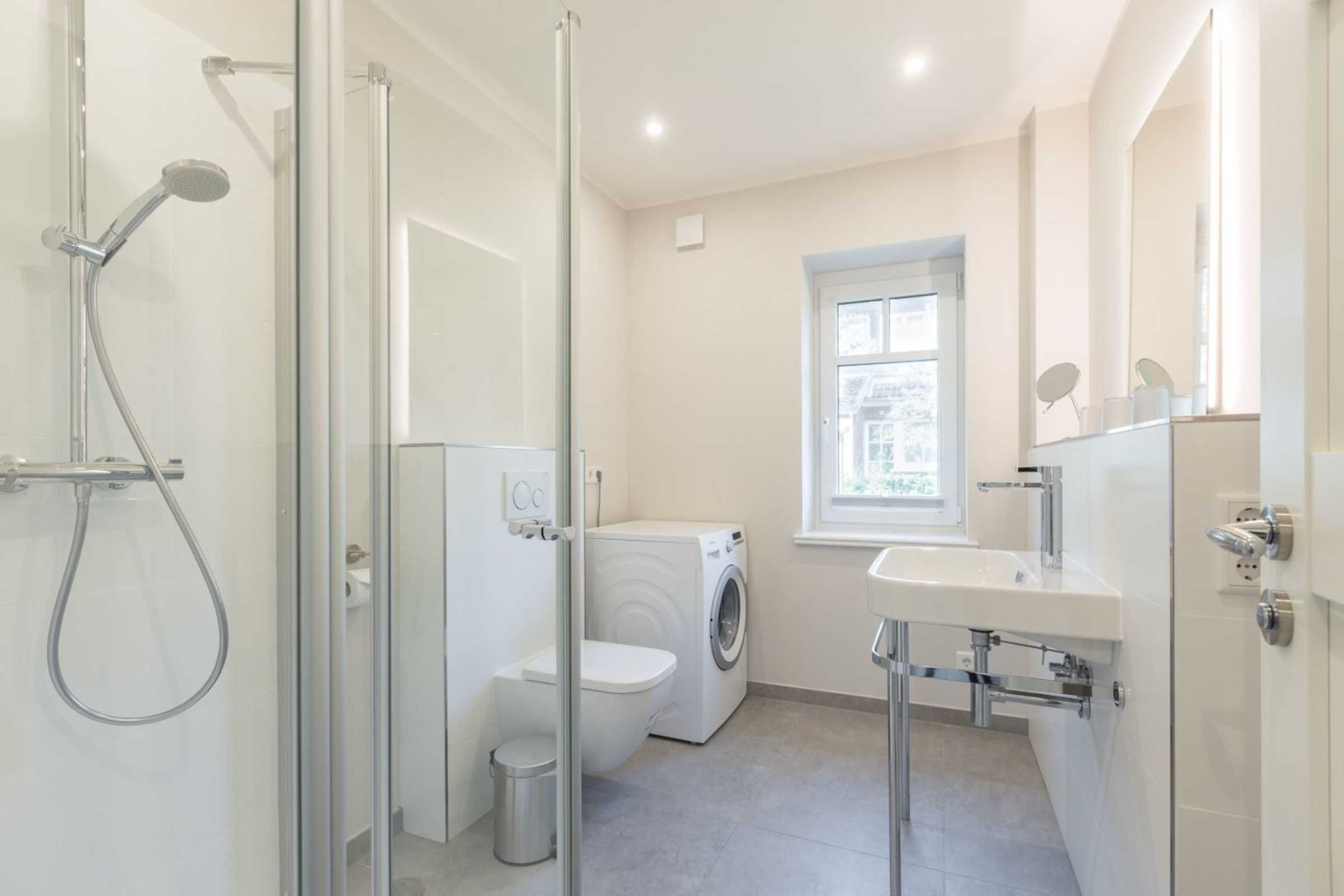 1. Badezimmer (Duschbad) mit bodengleicher Dusche, WC, Handtuchwärmer, Tageslicht, Kosmetikspiegel, Föhn und Waschmaschine.