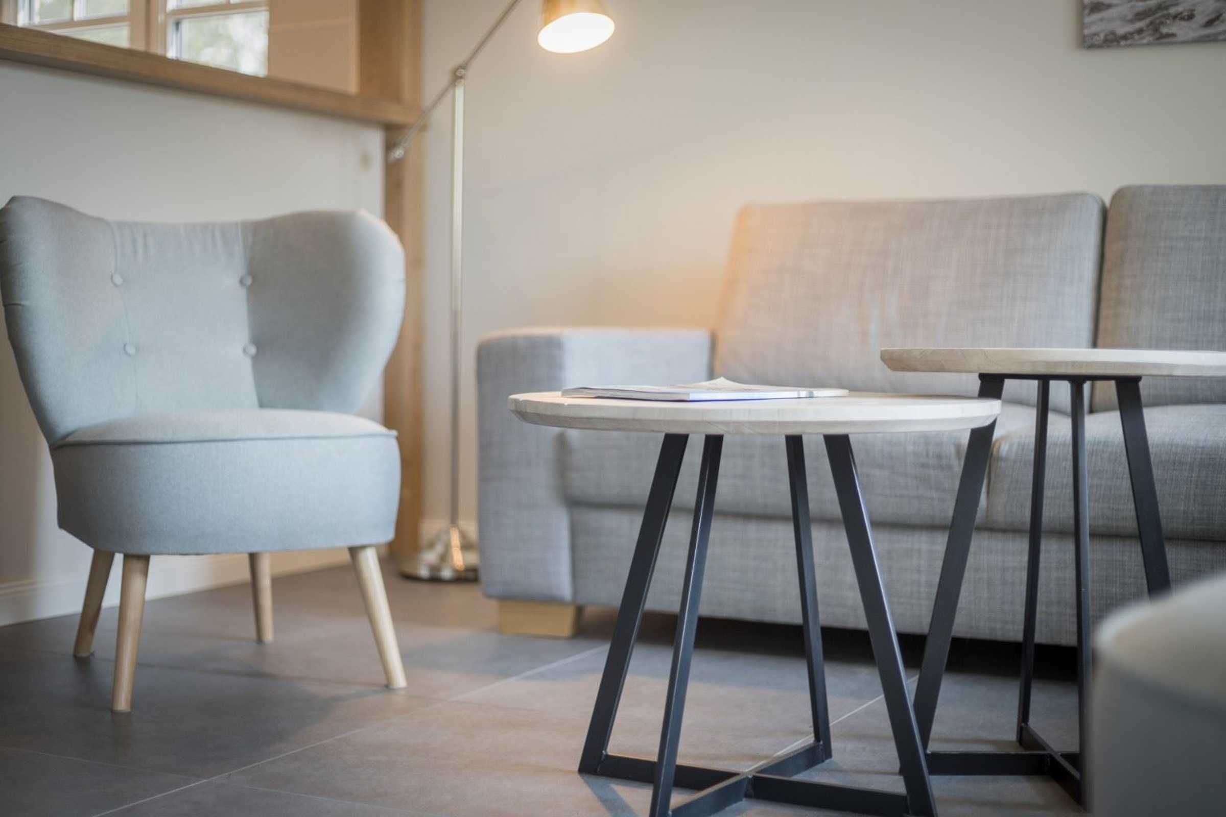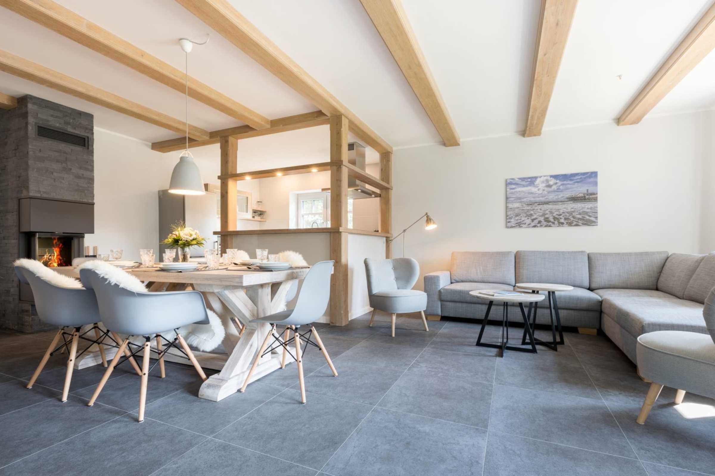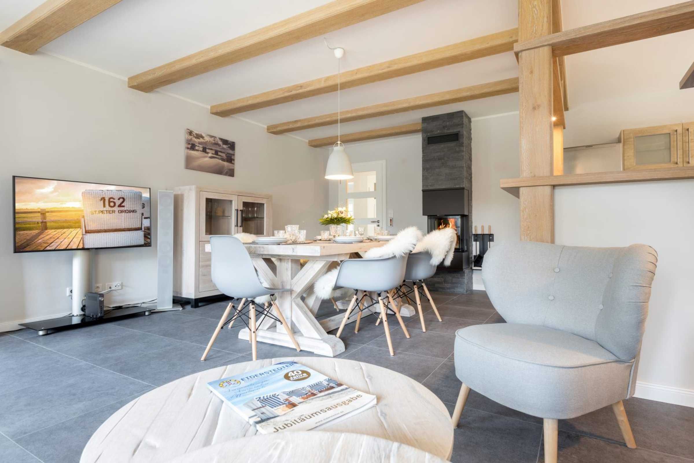 Wohnzimmer mit großem Ecksofa, Sesseln, SMART-TV (Sat), YAMAHA-Bluetooth-Soundsystem, gemütlichem Kaminofen, Esstisch für 6 Personen und Austritt zur schönen, möblierten Gartenterrasse nach Südwesten mit Strandkorb. Moderne, offene Küche mit Backofen, Mikrowelle, Geschirrspüler, Induktionskochfeld und Kühl-Gefrier-Kombination.