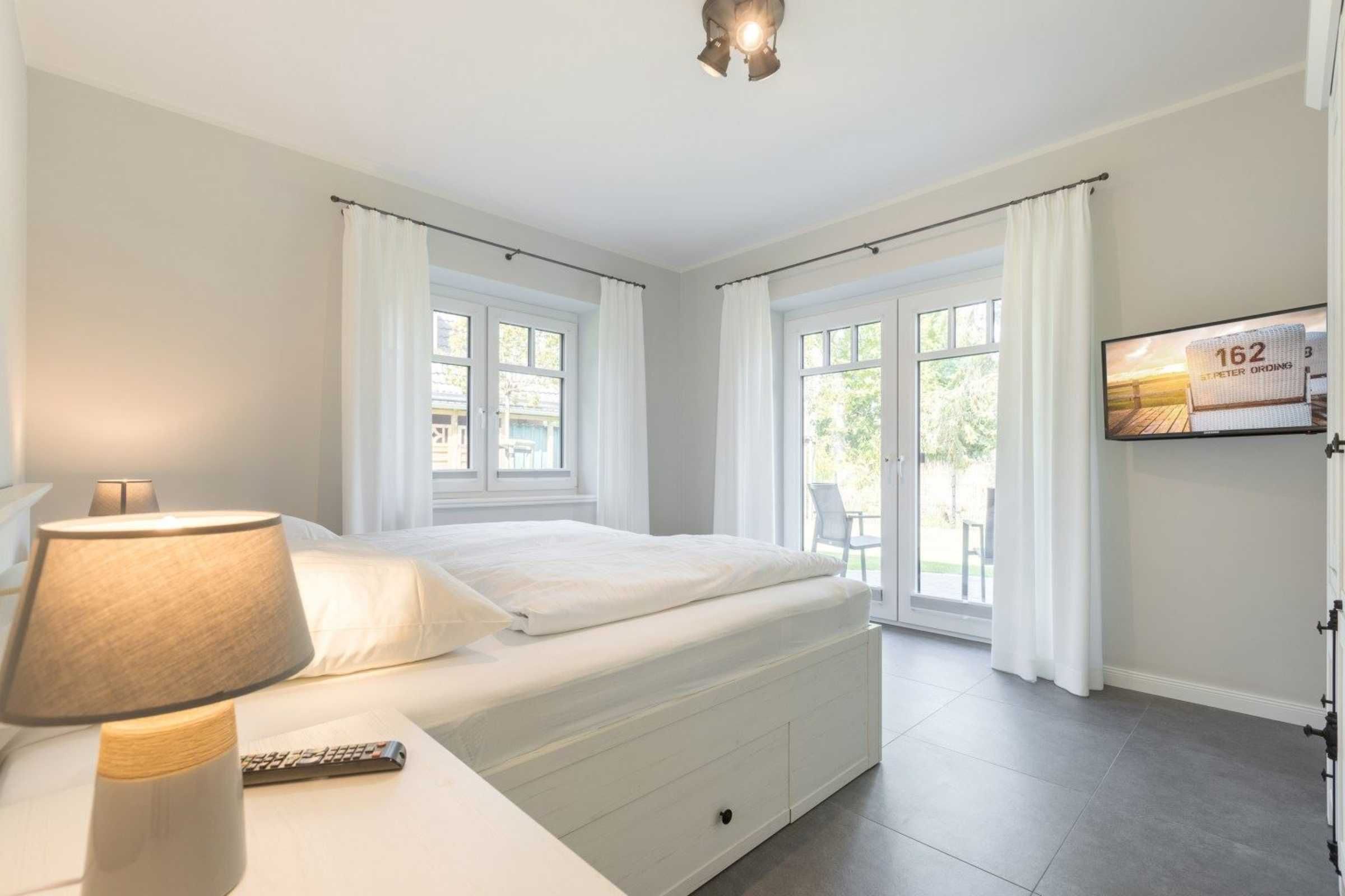 1. Schlafzimmer mit Doppelbett (2x 90x200cm), SMART-TV (Sat) und Austritt zur Gartenterrasse nach Norden.