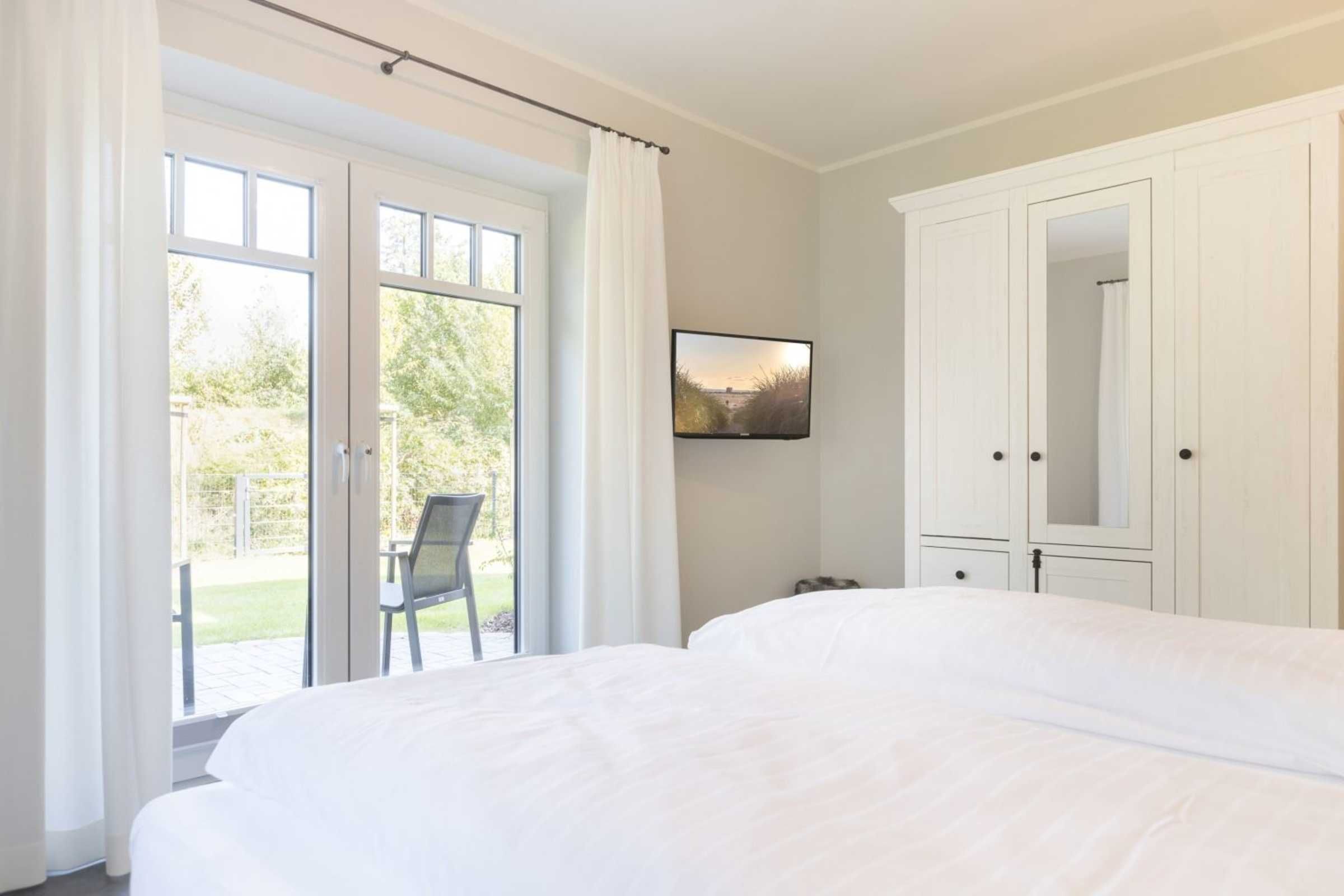 2. Schlafzimmer mit Doppelbett (2x 90x200cm), SMART-TV (Sat) und Austritt zur Gartenterrasse nach Südenwesten.