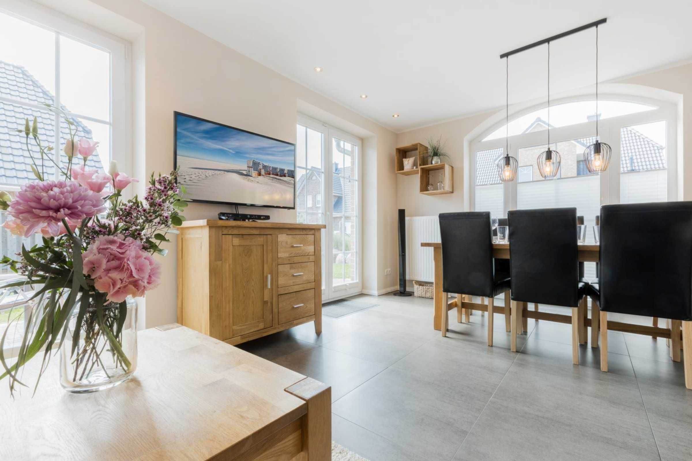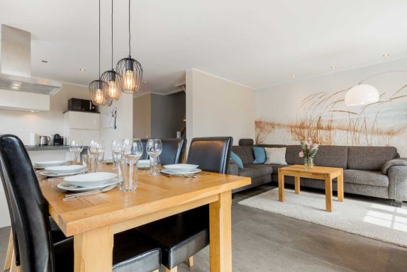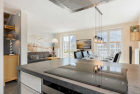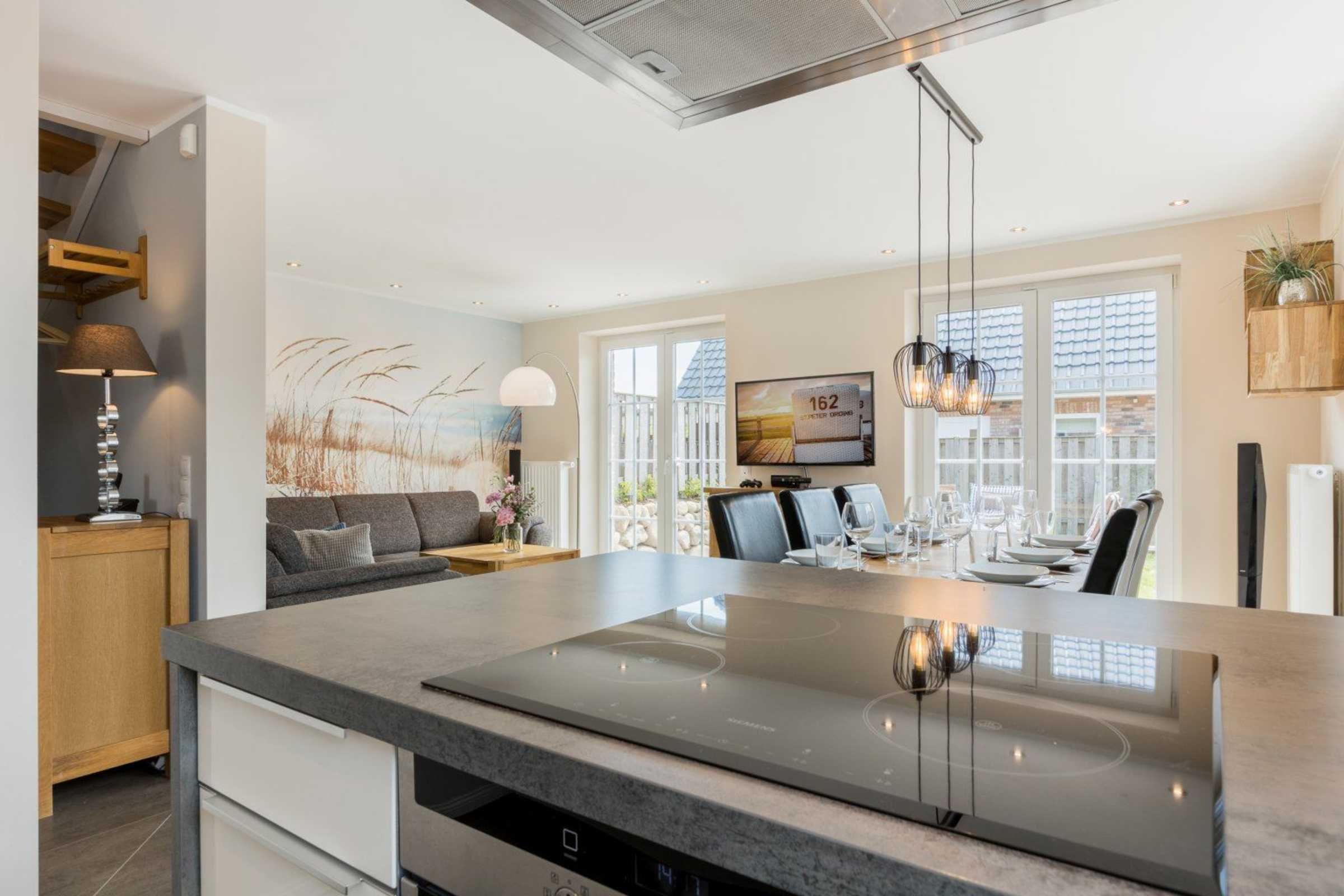 Wohnzimmer mit großem Eck-Sofa, SMART-TV (Sat, 46 Zoll), MediaPlayer und XBOX360 mit Kinect. Zugang zur sonnigen Süd-Terrasse mit Gartenmöbeln und Strandkorb. Offene Küche mit Induktionsherd, Backofen, Mikrowelle, Geschirrspüler, Kühl-Gefrier-Kombination und Nespresso-Maschine.
