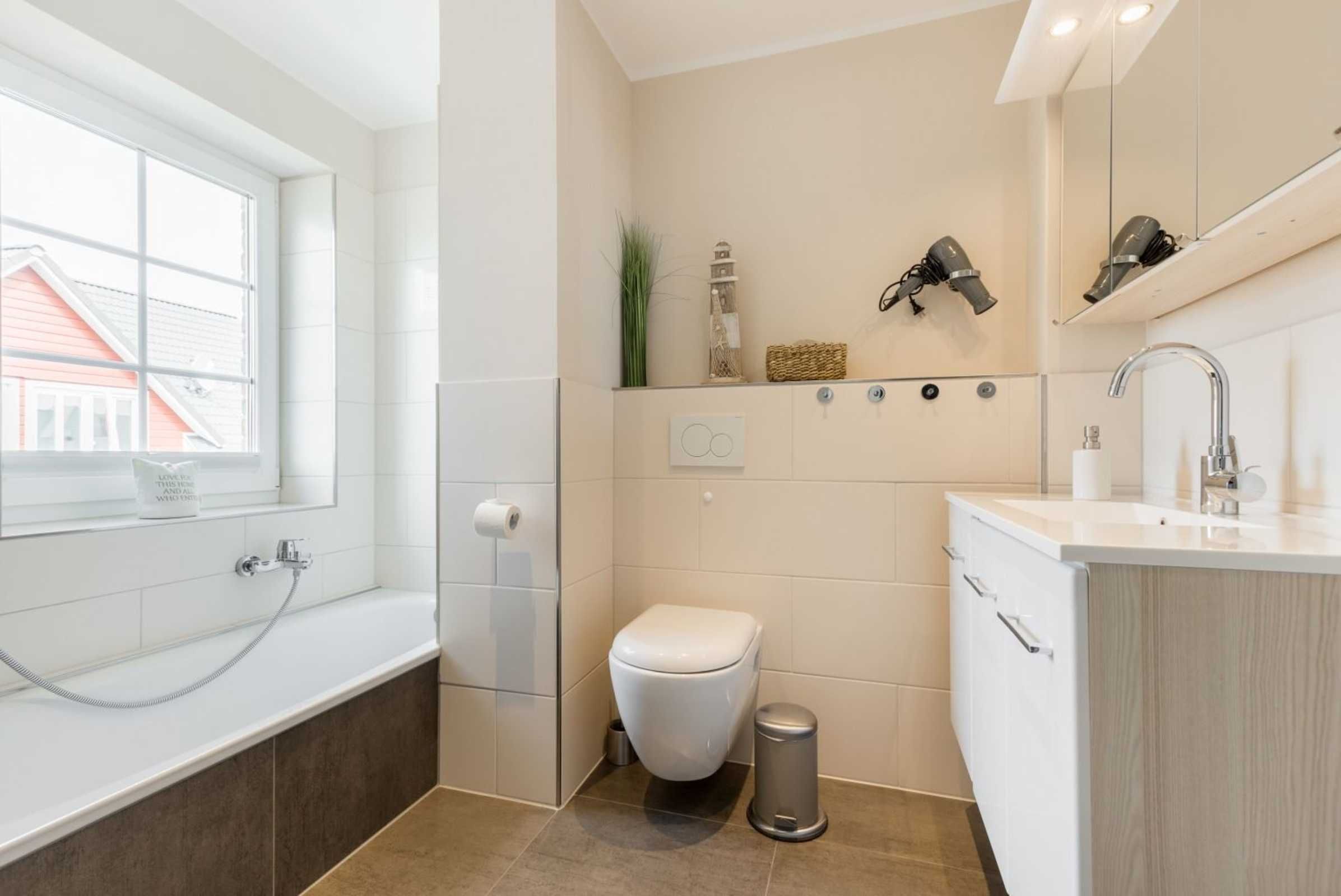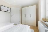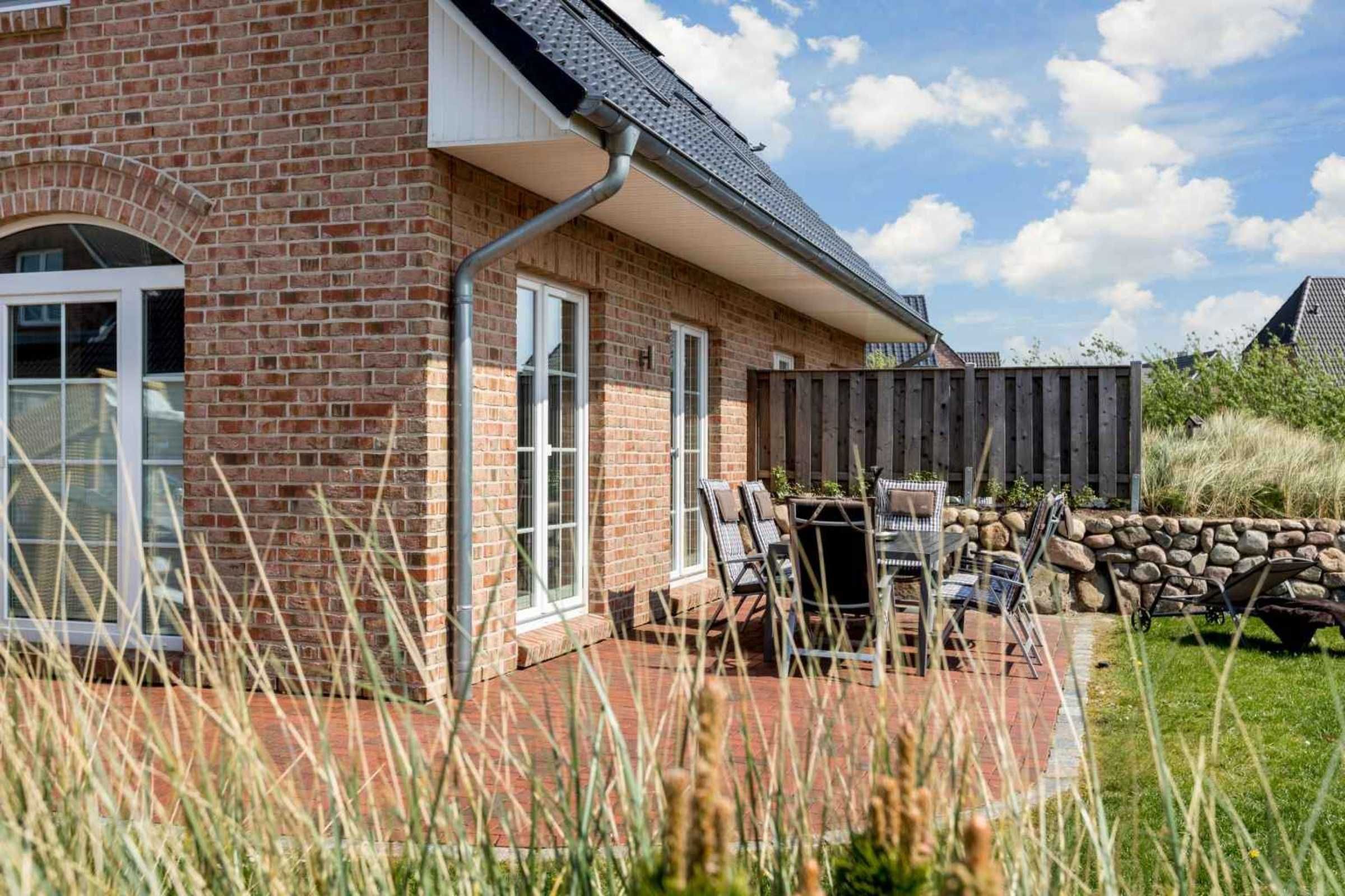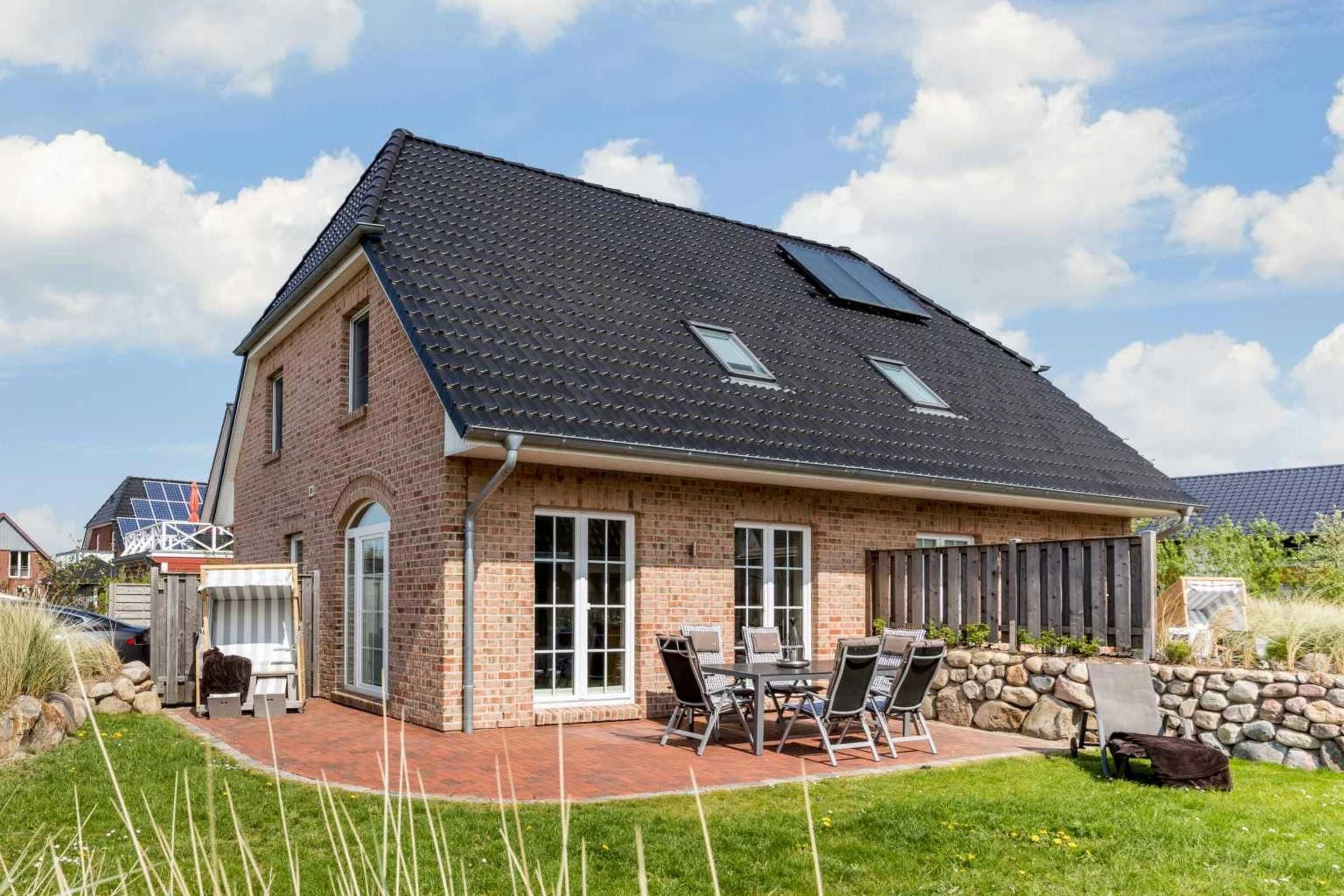 Exklusive Ferienhaushälfte „Droemhus 44a“ (vorne) mit 4 Zimmern und ca. 82 m² auf 2 Ebenen für bis zu 6 Personen. Ruhige Lage in einer Spielstraße im Ortsteil Dorf in St. Peter-Ording. Hund willkommen.