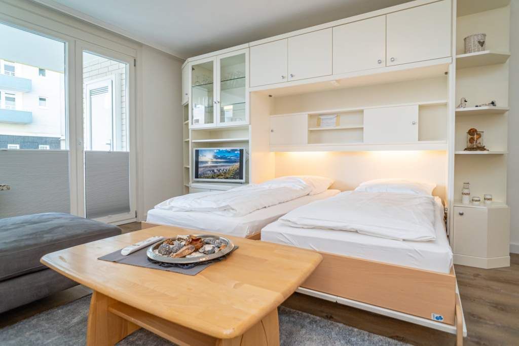 Der Wohnraum besteht aus einer Sitzecke, einem Essplatz, einem Doppelschrankbett (Betten einzeln klappbar) und einem Sat-Flachbild-TV.