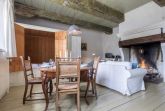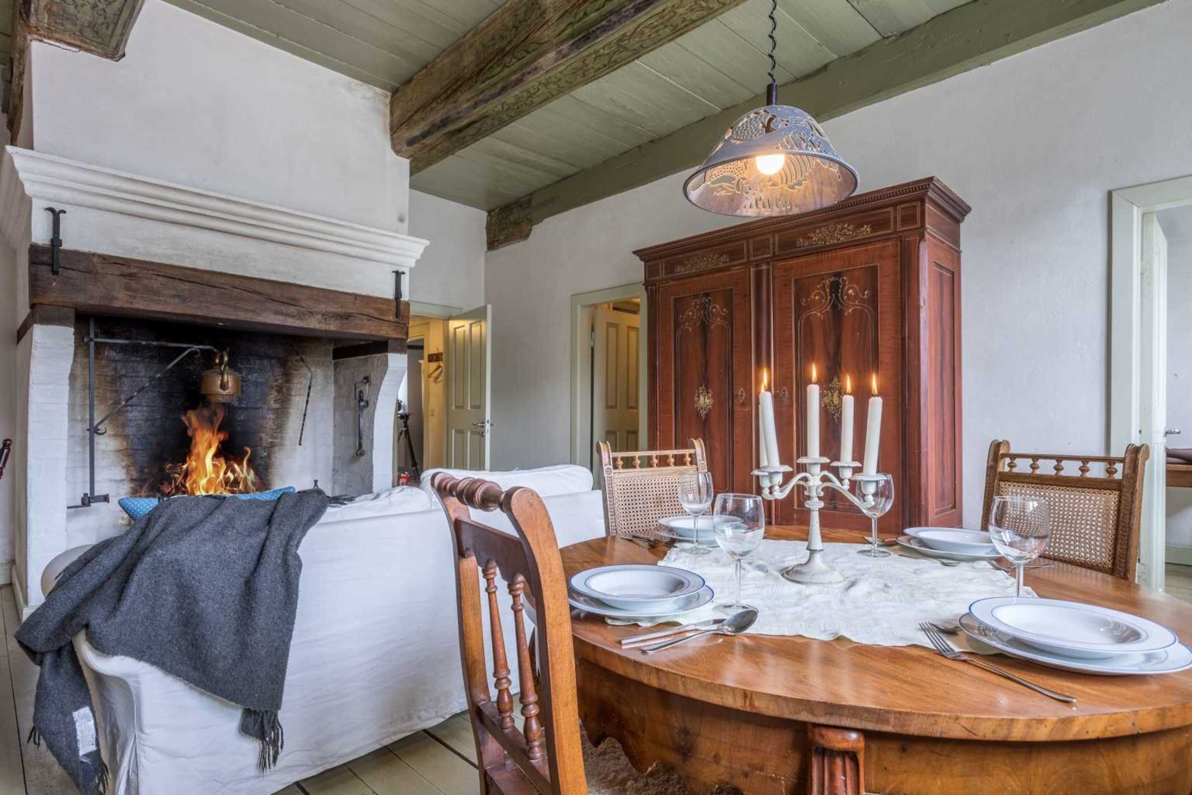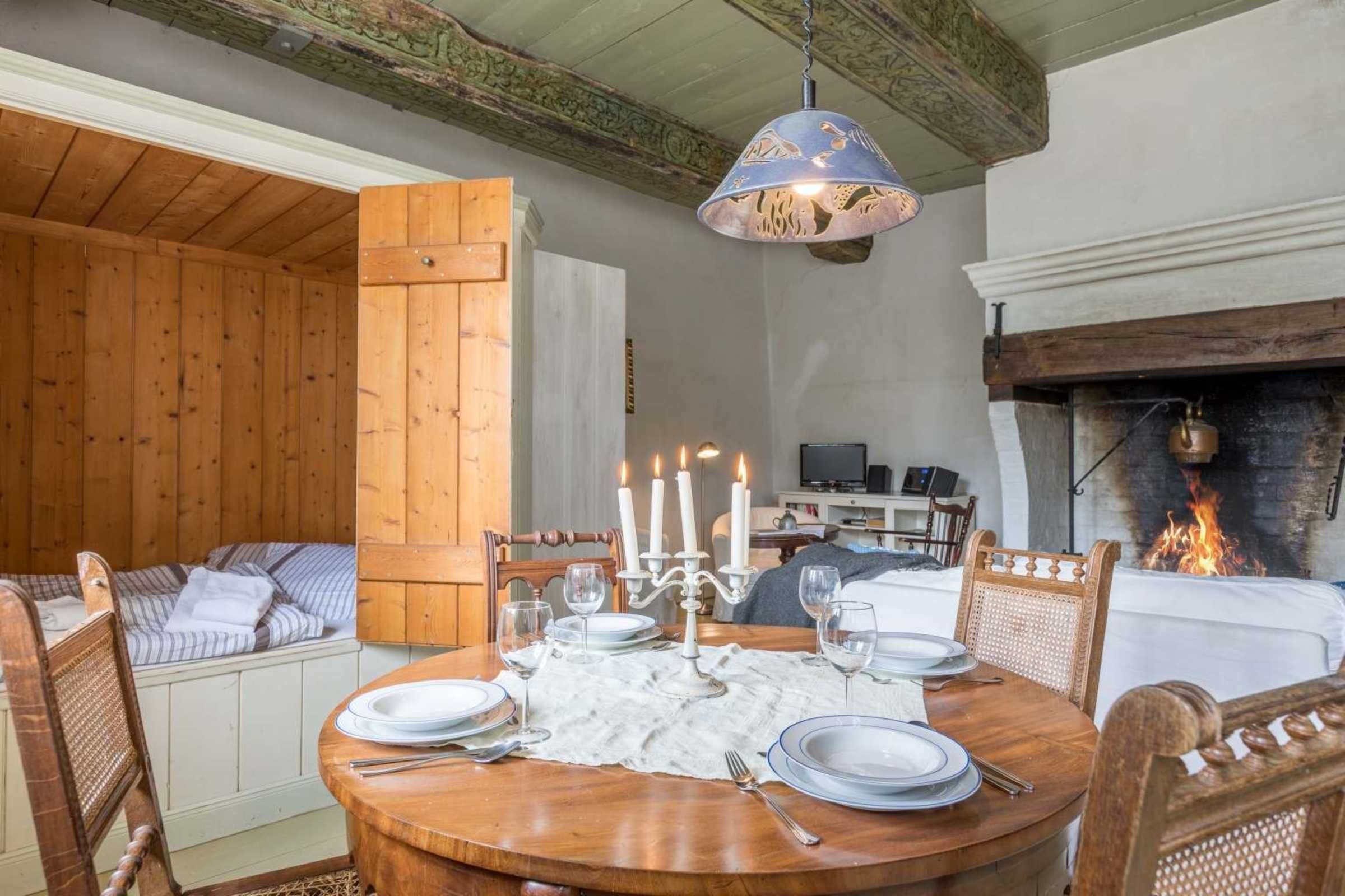 Wohn- / Schlafzimmer mit Sofa vor dem großem Kamin, Lese-Ecke mit Sesseln, Essplatz für 4 Personen, einem Flatscreen-TV (SAT), einer Stereo-Anlage mit CD-Spieler, Kleiderschrank und einem Alkoven-Doppelbett (160 x 200cm).