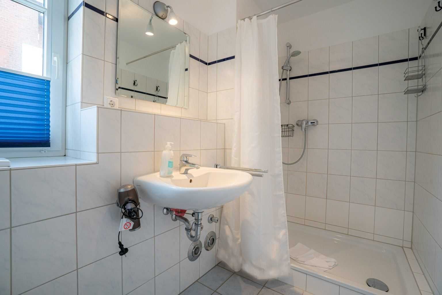 Badezimmer (Duschbad) mit Dusche, WC, Föhn und Tageslicht.