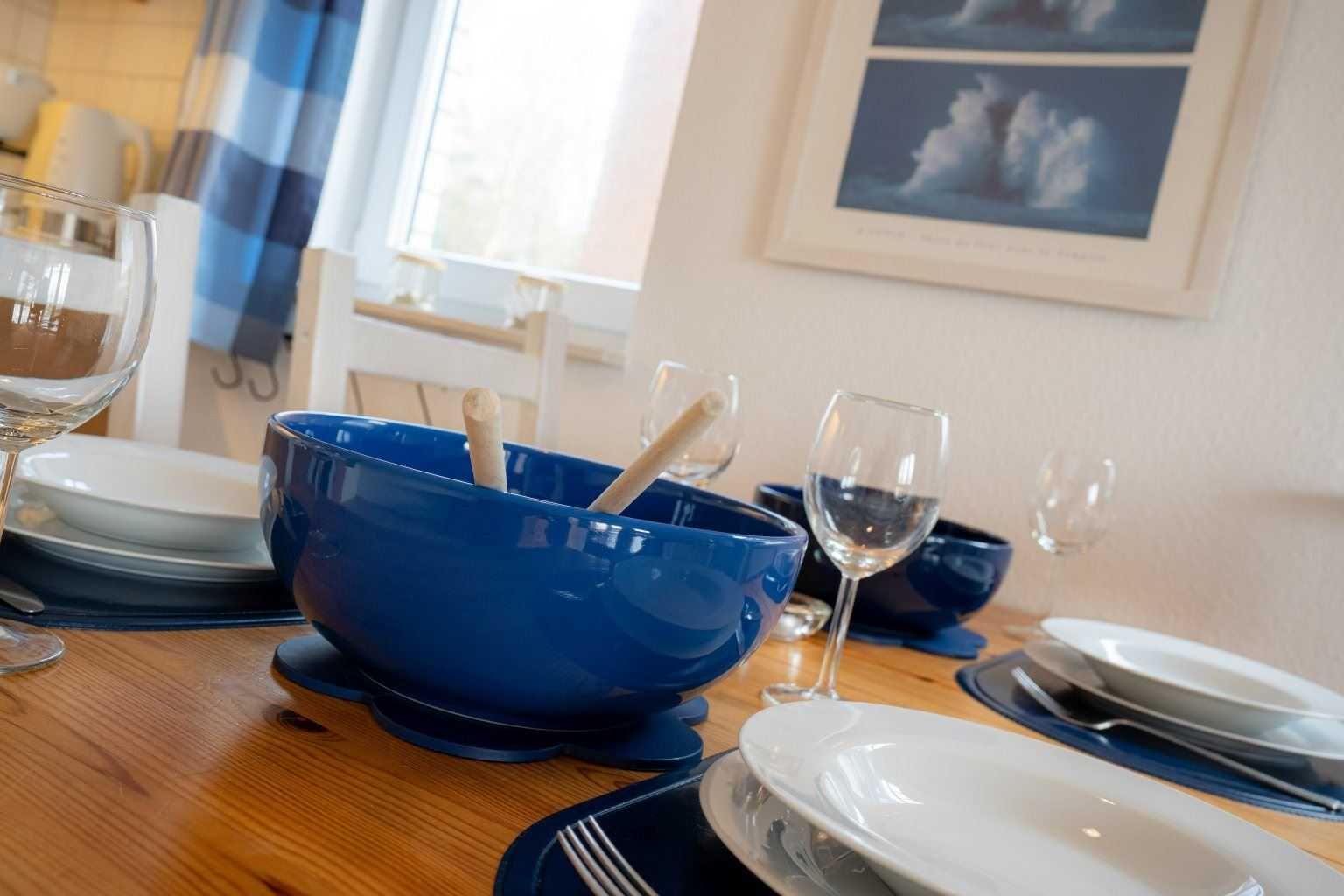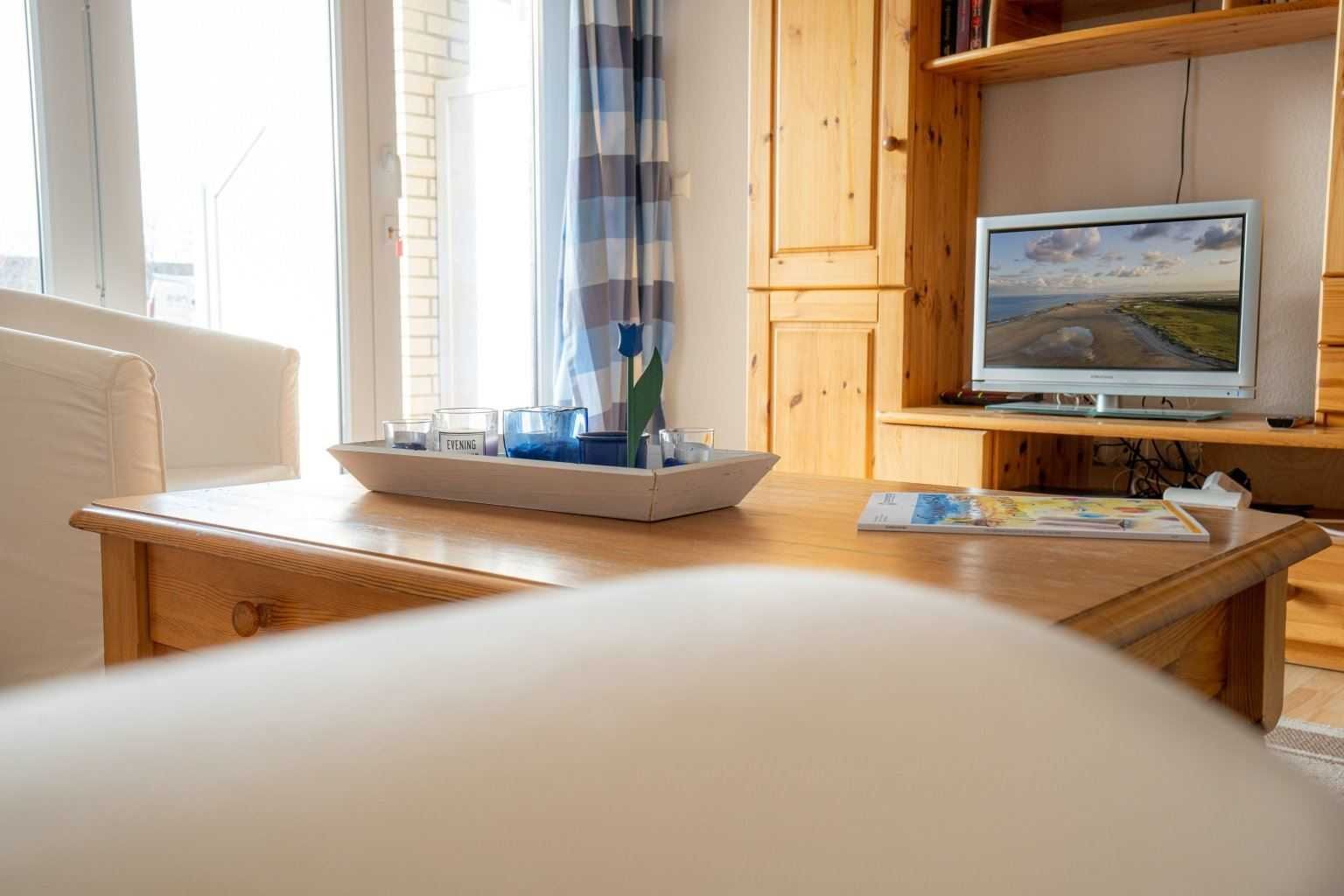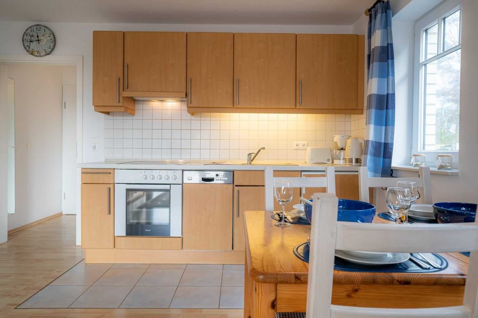 Wohnzimmer mit Sofa, 1 Sessel, TV (Sat), DVD-Player, Radio mit CD-Player und Esstisch mit 4 Stühlen. Direkter Zugang zur windgeschützten, möblierten Terrasse nach Süden. Offene Küche mit Backofen, Geschirrspüler und Kühlschrank mit Gefrierfach.