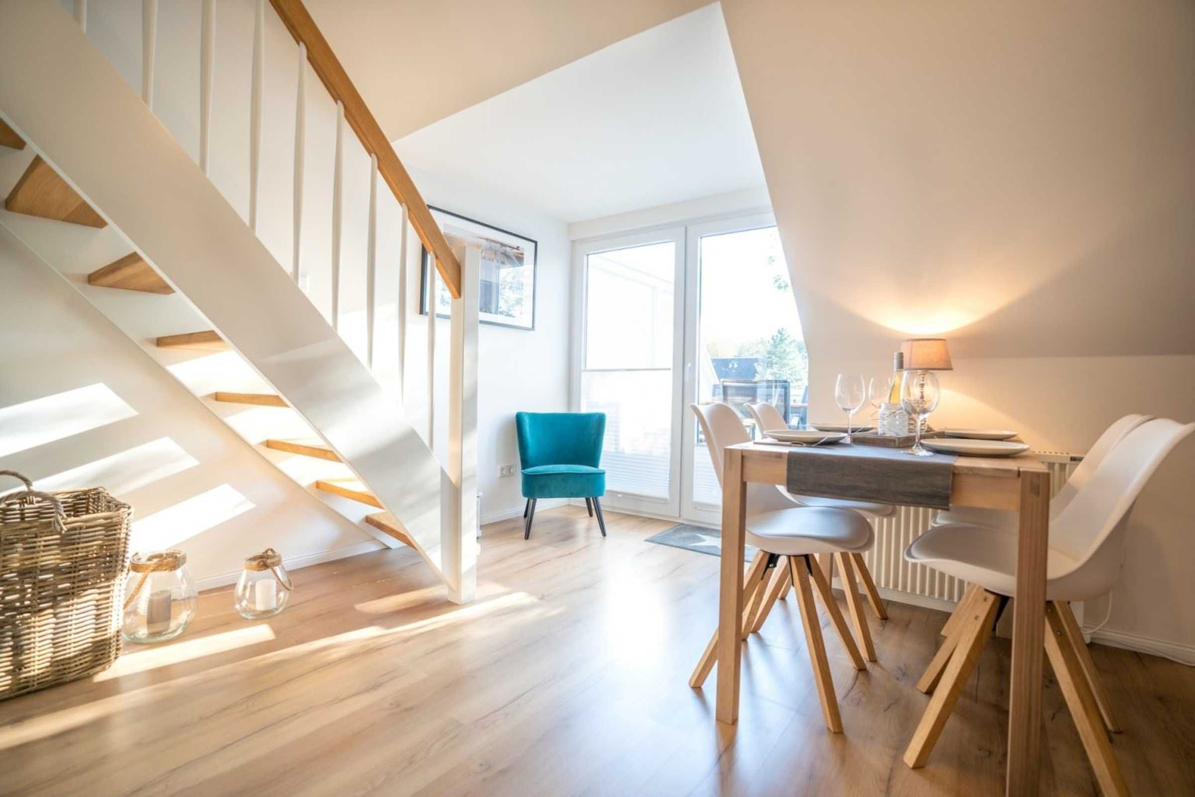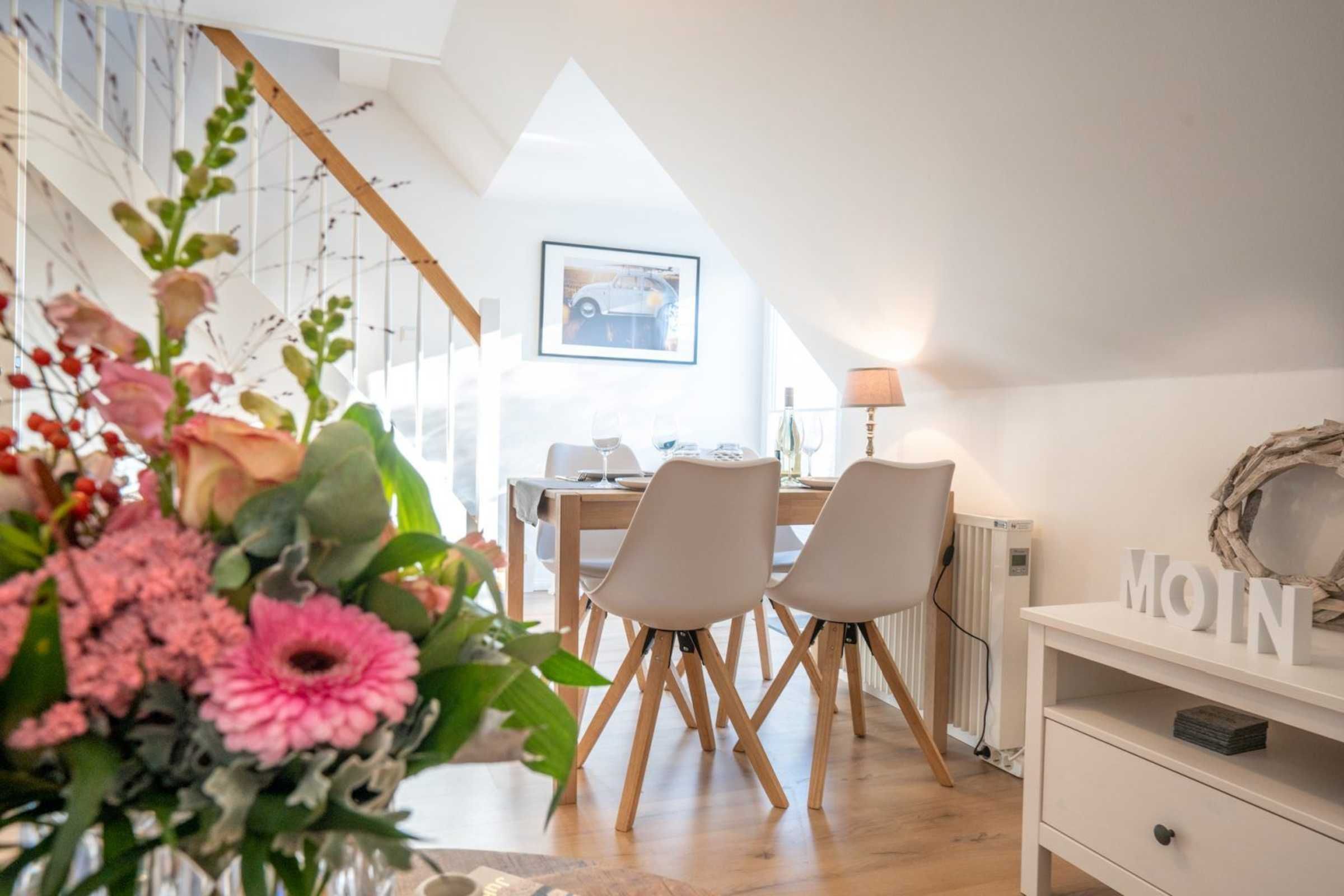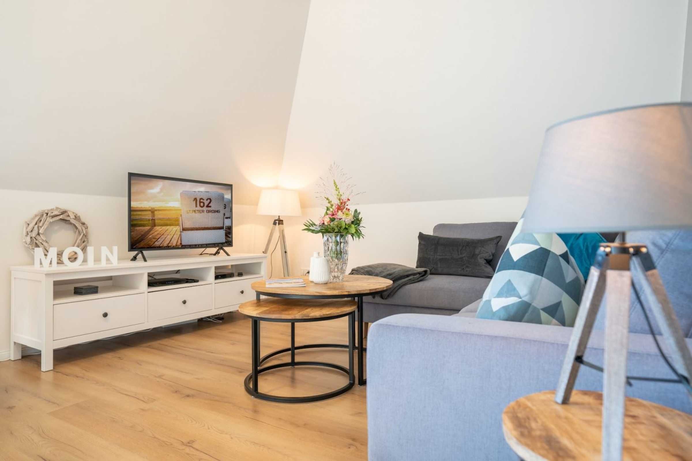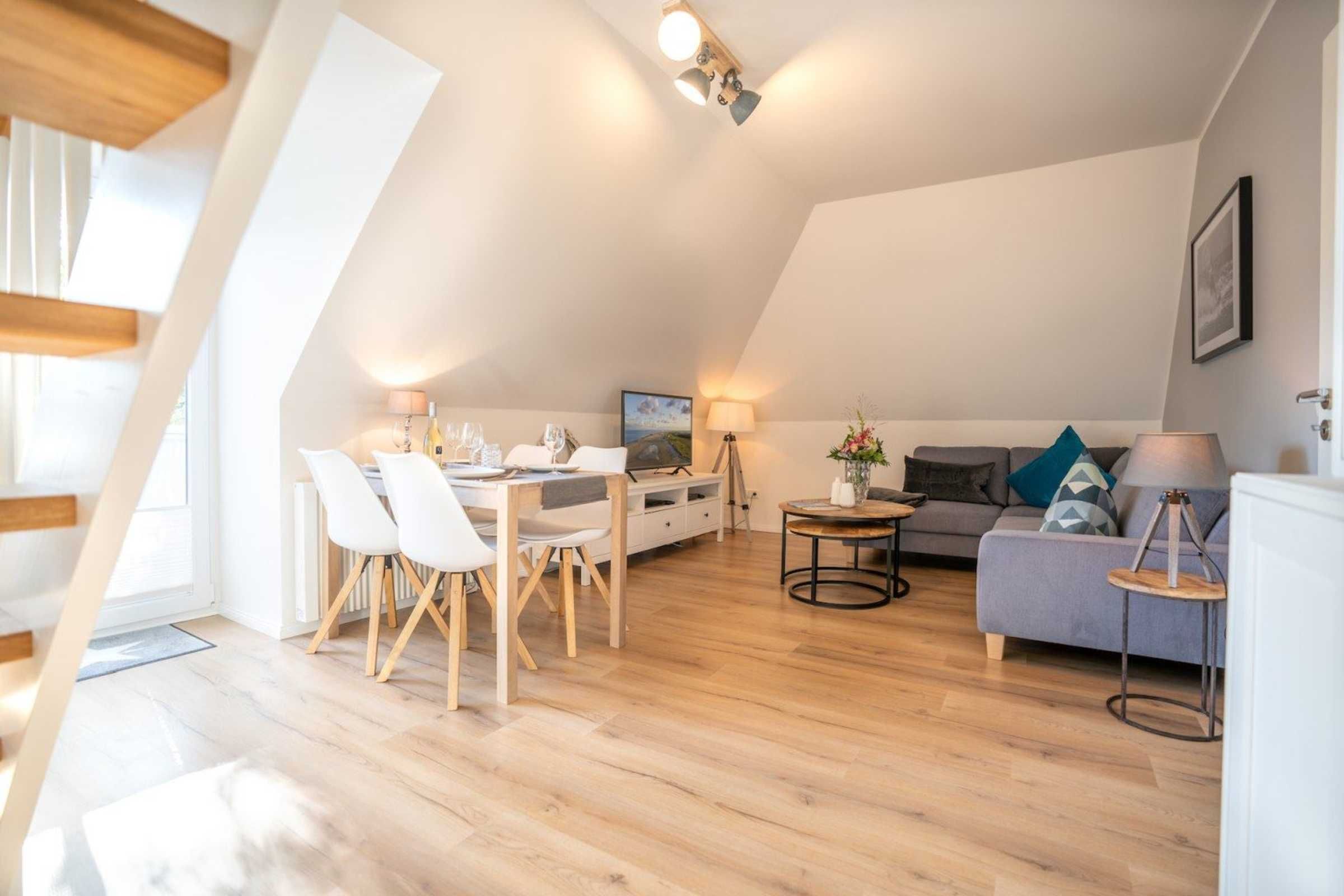 Moderne 3-Zimmer-Ferienwohnung Wellenreiter mit ca. 62 qm auf 2 Ebenen (OG, DG) für bis zu 4 Personen. In ruhiger Lage im Ortsteil Dorf in St. Peter-Ording. Mit schönem großem Gartengrundstück. Viel Komfort und Entspannung erwarten Sie hier.