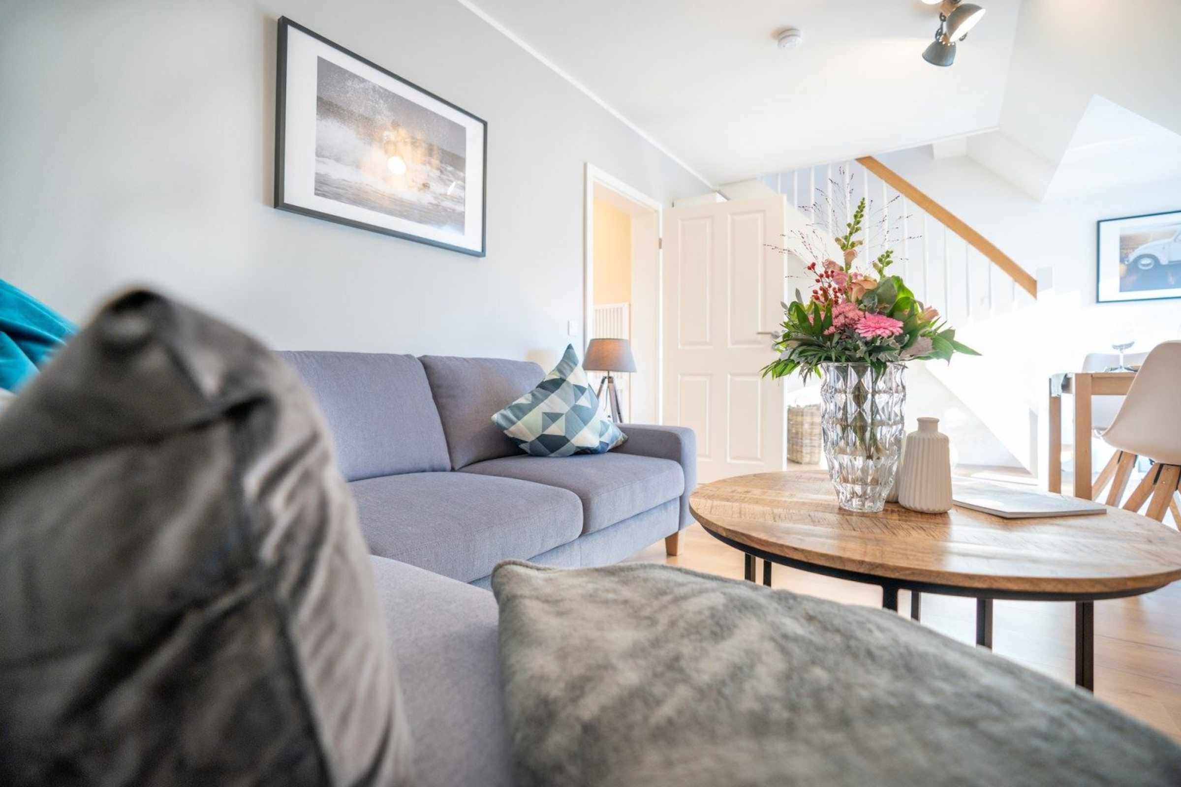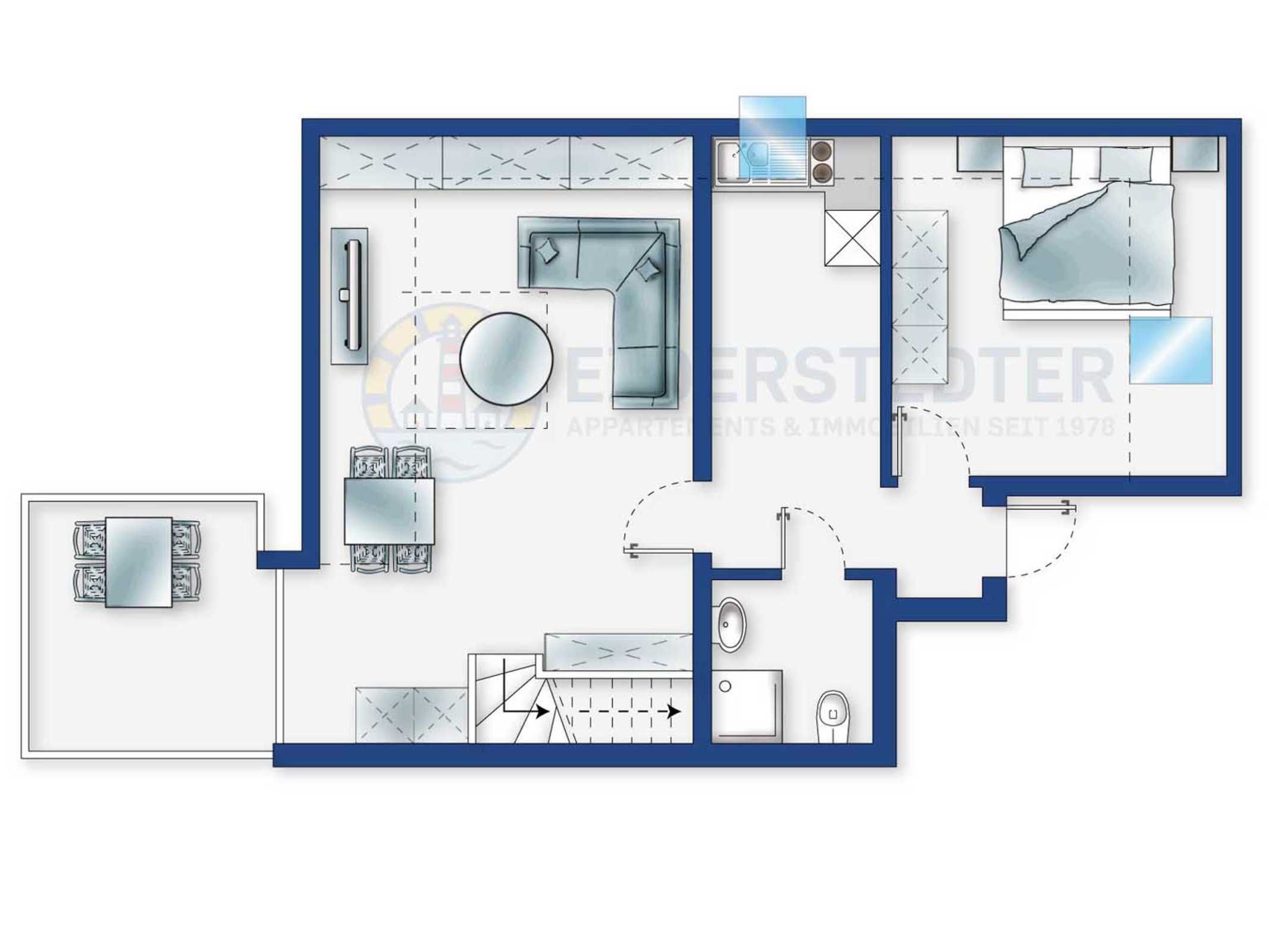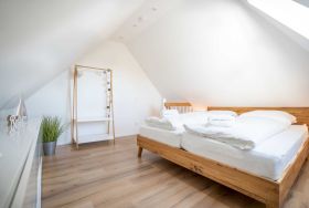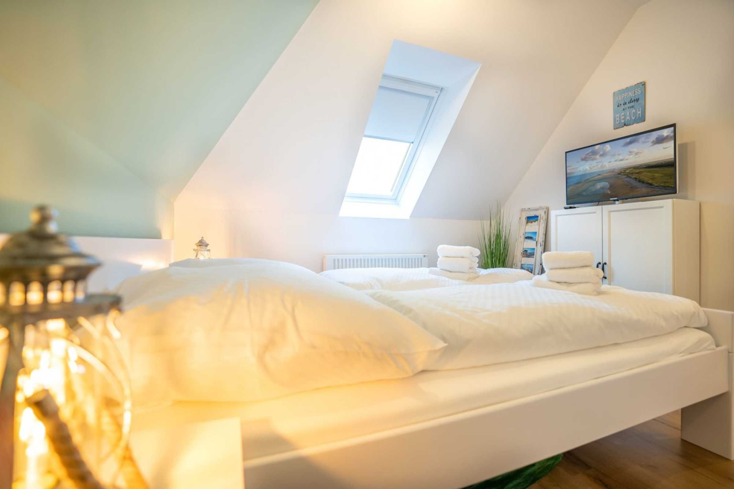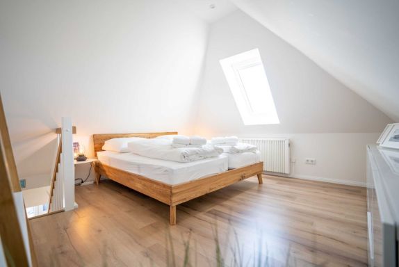 Moderne 3-Zimmer-Ferienwohnung Wellenreiter mit ca. 62 qm auf 2 Ebenen (OG, DG) für bis zu 4 Personen. In ruhiger Lage im Ortsteil Dorf in St. Peter-Ording. Mit schönem großem Gartengrundstück. Viel Komfort und Entspannung erwarten Sie hier.