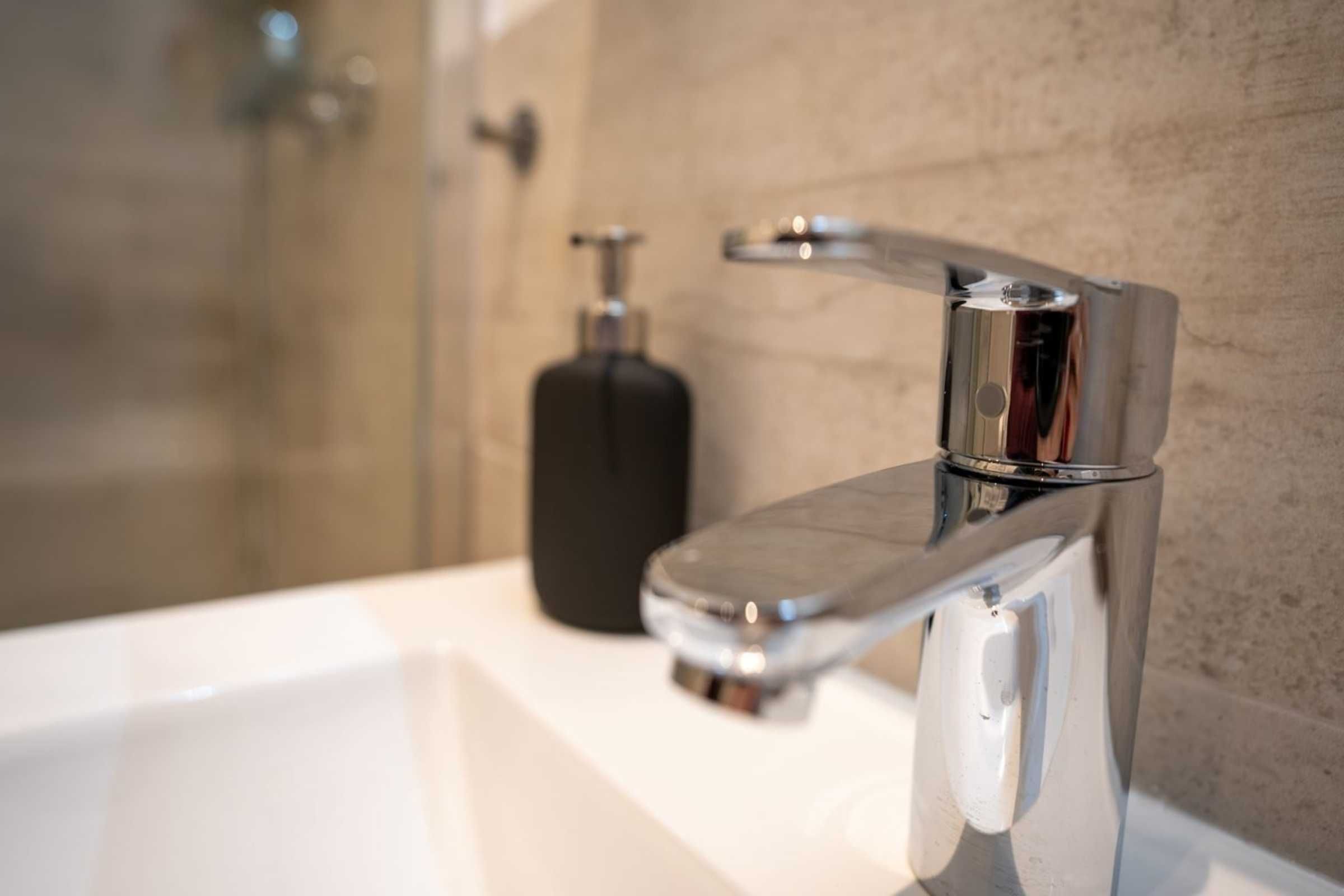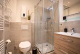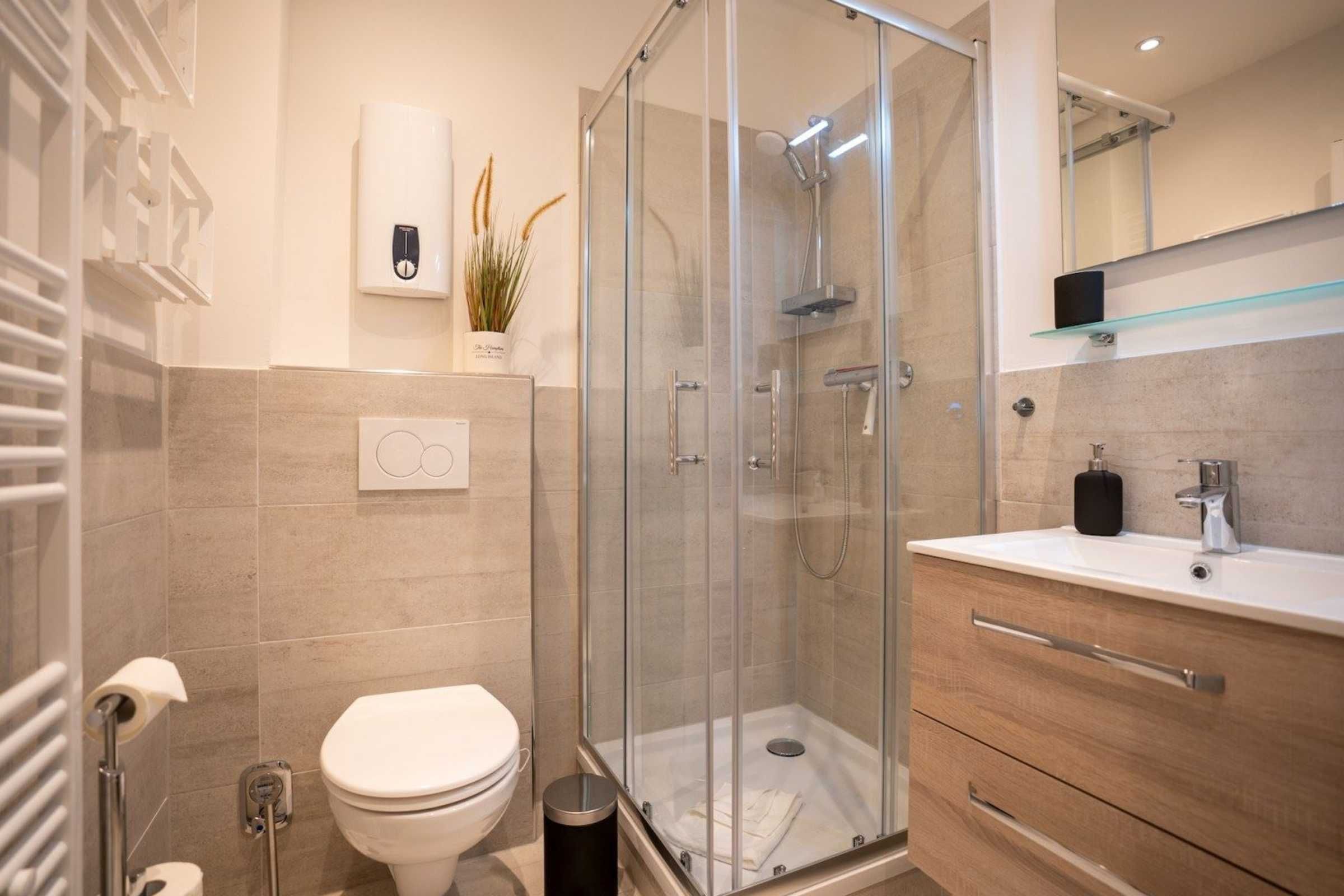 Badezimmer (Duschbad) mit Dusche, WC, Handtuchwärmer und Föhn.
