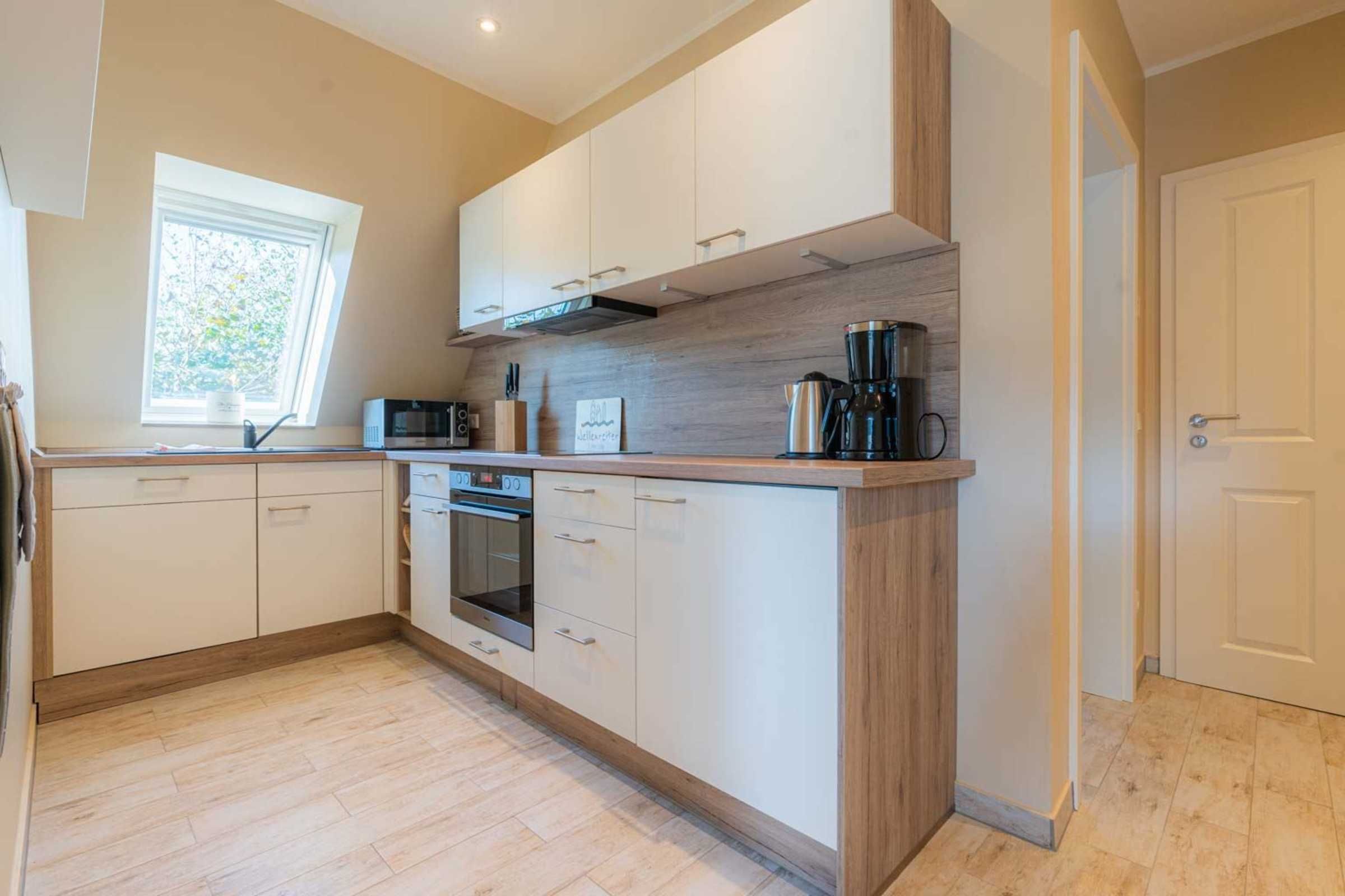 Separate Küche im Eingangsbereich mit Backofen, Mikrowelle, Geschirrspüler und Kühlschrank mit Gefrierfach.