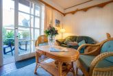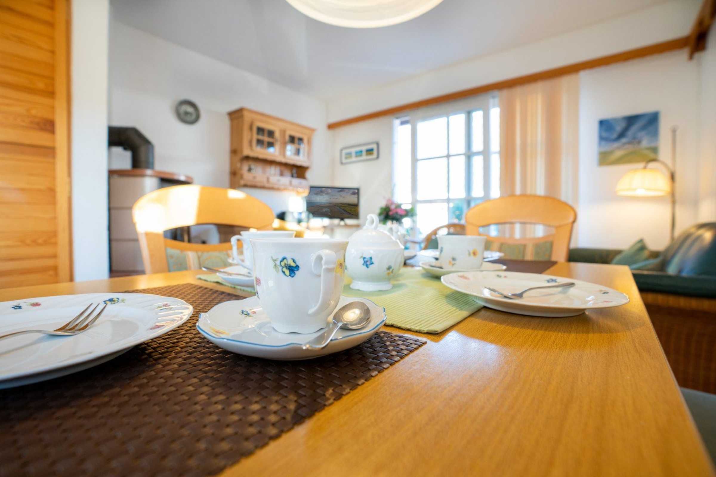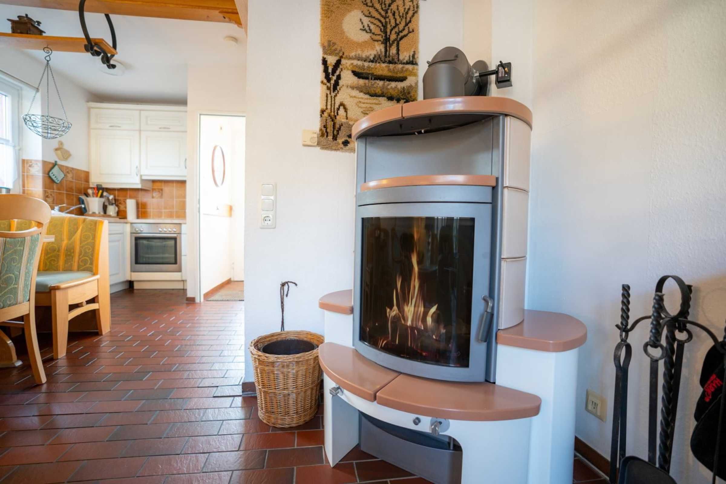 Wohnzimmer mit Sofa (2er), 2 Sesseln, TV (SAT), Stereo-Kompaktanlage, DVD-Player, Kaminofen und separatem Essbereich mit gemütlicher Eckbank und 2 Stühlen. Abstellkammer mit Staubsauger. Offene Küche mit Backofen, Kühlschrank mit Gefrierfach und Geschirrspüler. Direkter Zugang zur möblierten Terrasse nach Osten.