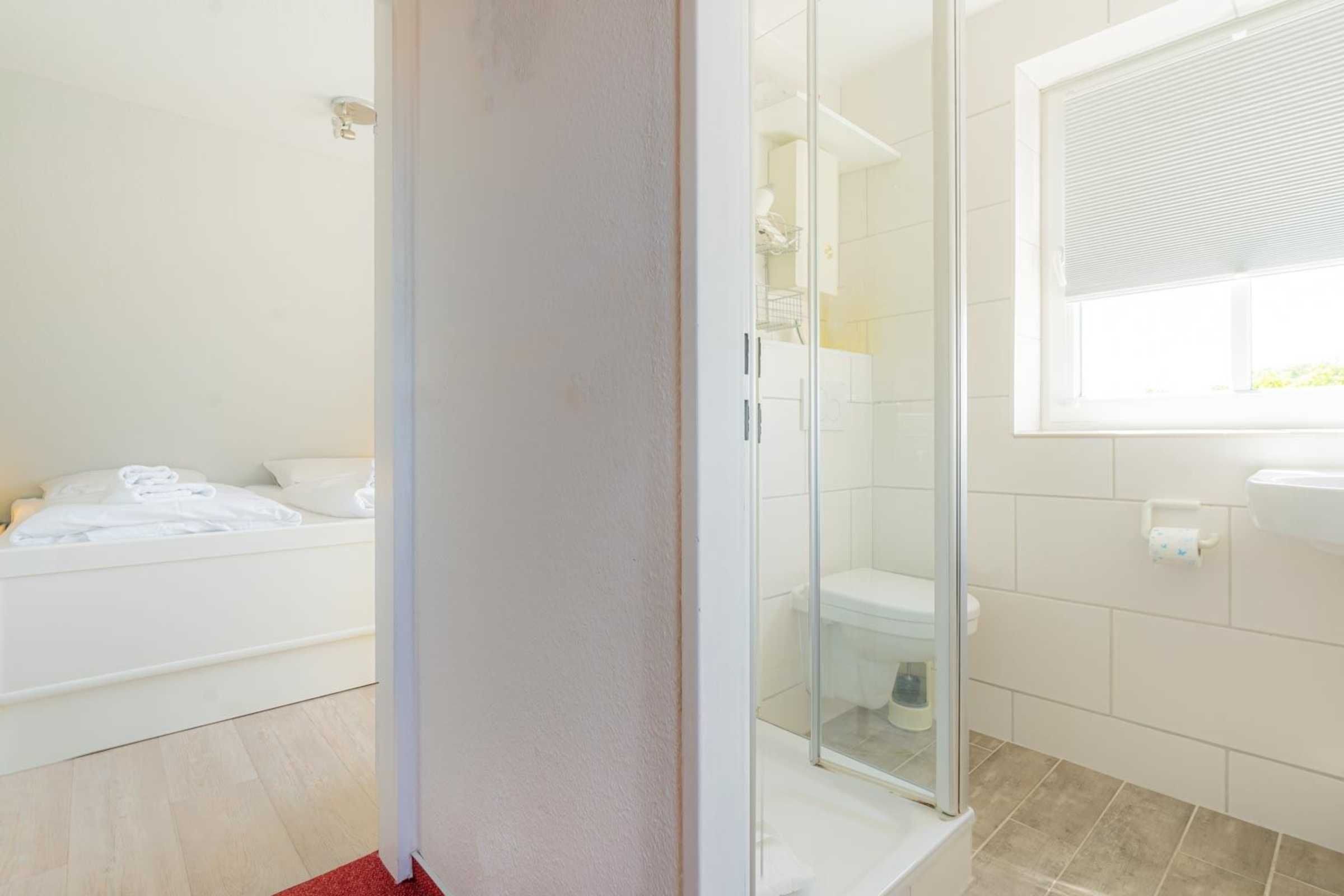 Badezimmer (Duschbad) mit Dusche, WC, Föhn und Tageslicht.