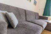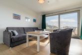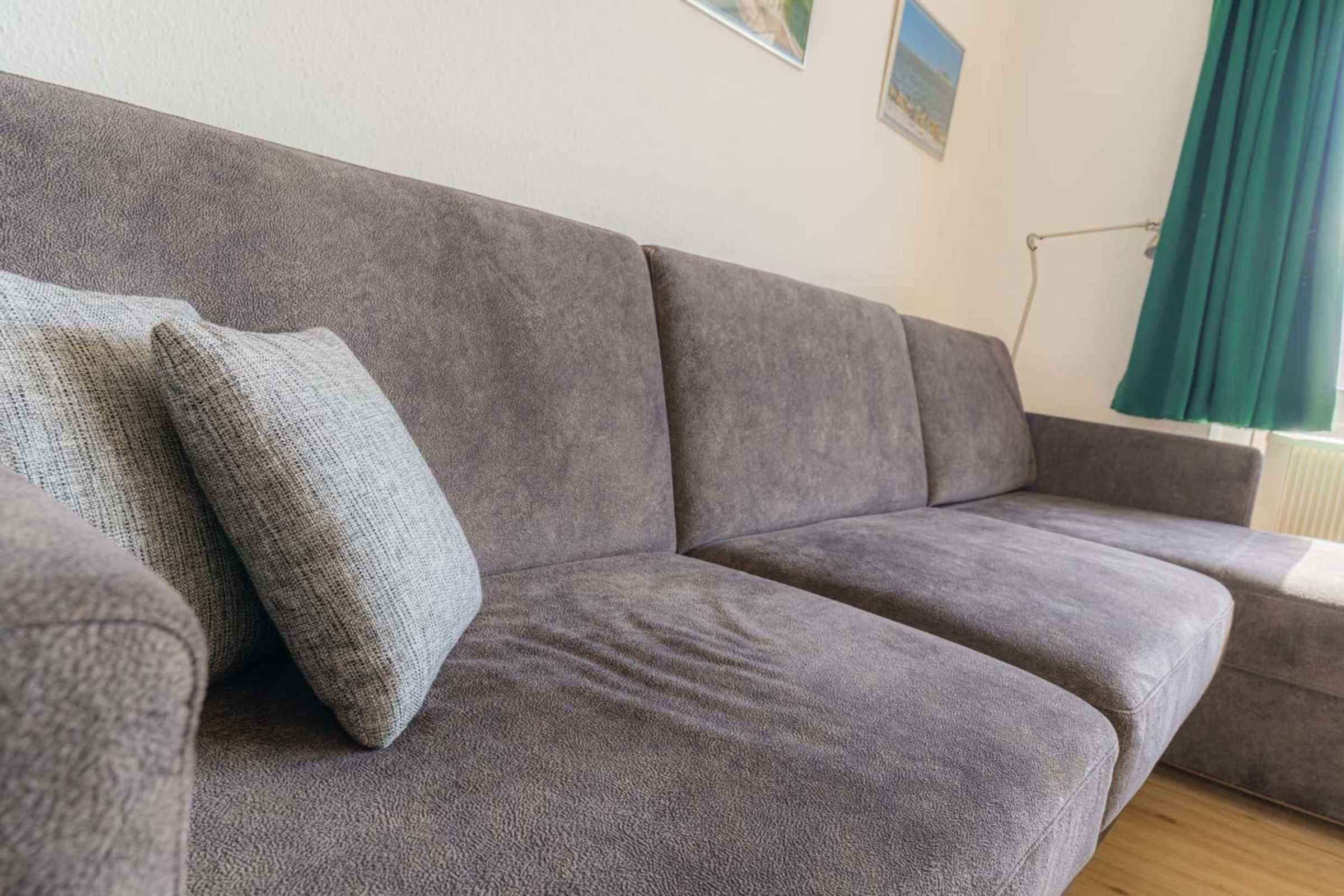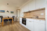 Wohnzimmer mit großem Ecksofa (ausklappbar zum bequemen Bett mit Matraze, 170x200cm), Sessel, großem SMART-TV (Sat), Internet-Radio mit Bluetooth und Esstisch mit 4 Stühlen. Direkter Zutritt zum breiten Balkon nach Südosten. Offene Küche mit Backofen, Mikrowelle, Geschirrspüler und Kühlschrank mit Gefrierfach.